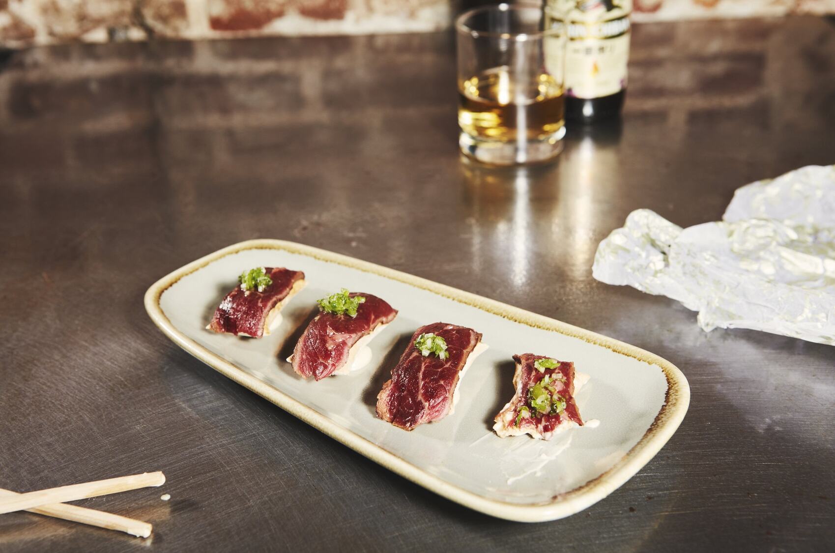 The journey takes on a cosmopolitan flavor at Chuka Ramen Bar, where Asian cuisine blends with local produce. The faux nigiri made with aged beef and chipotle mayonnaise is pure fusion: intense, creamy, vibrant. We pair it with a full-bodied, mineral Mencía wine. A stop along the way to explore Madrid’s most diverse side.