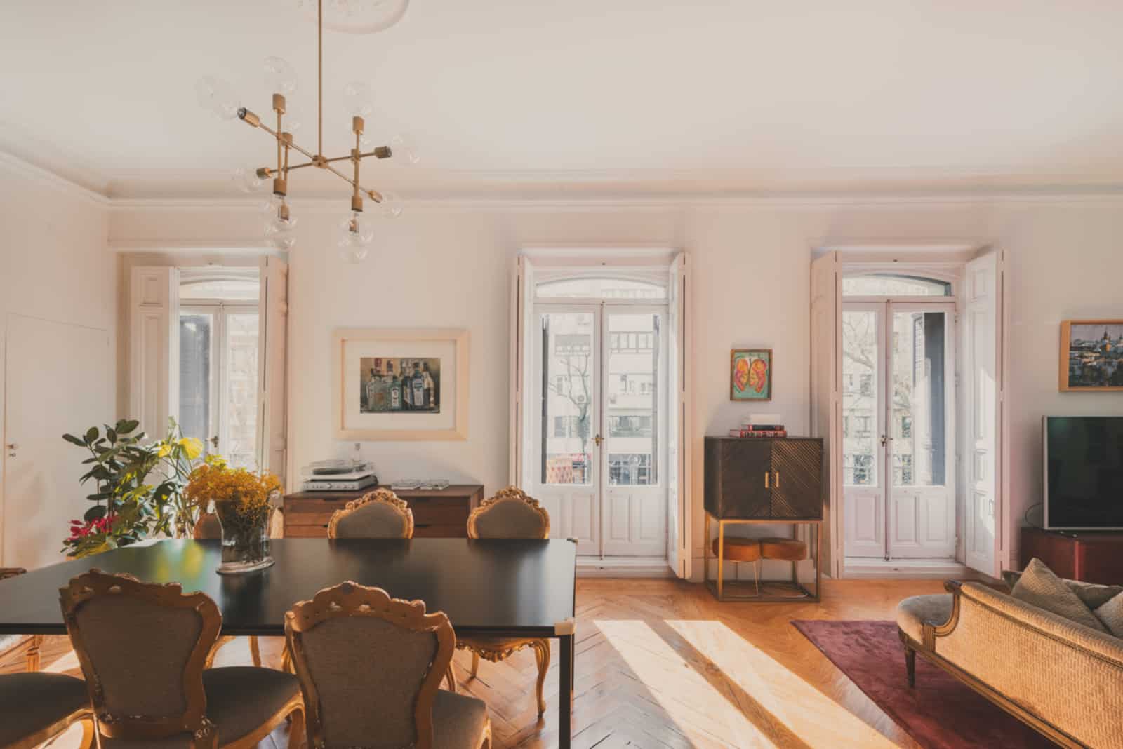 The living-dining room is the heart of the house, a bright and welcoming space thanks to its four exterior balconies, which provide a great feeling of spaciousness.