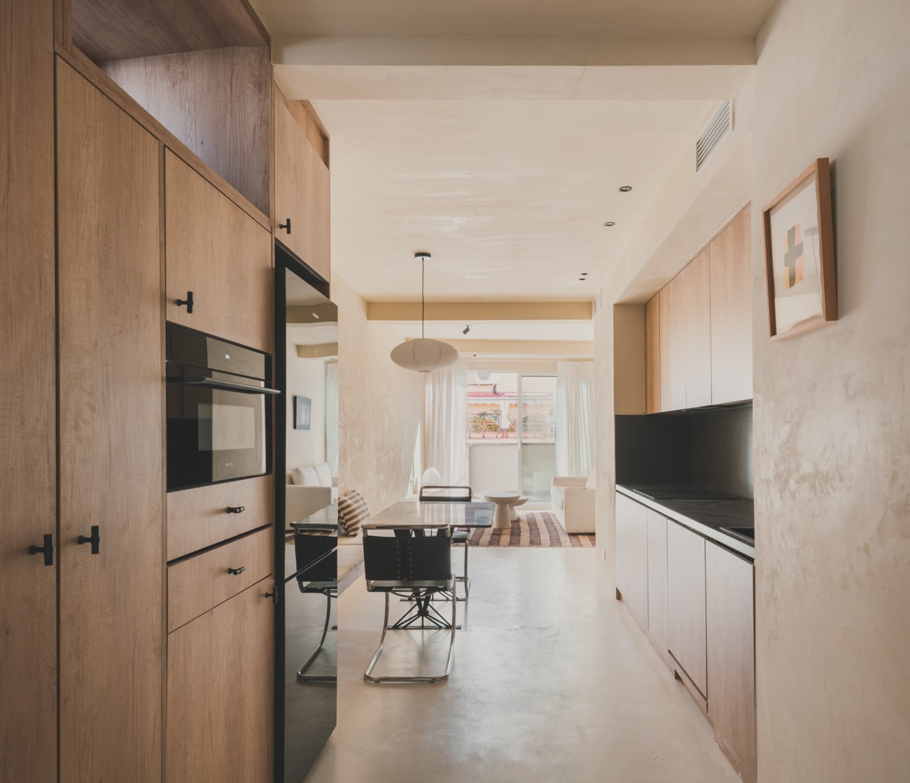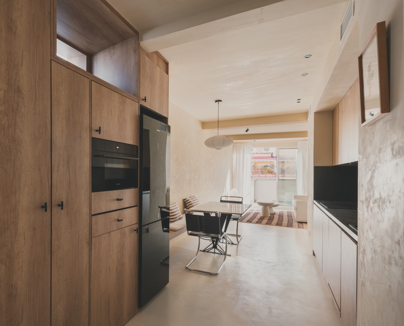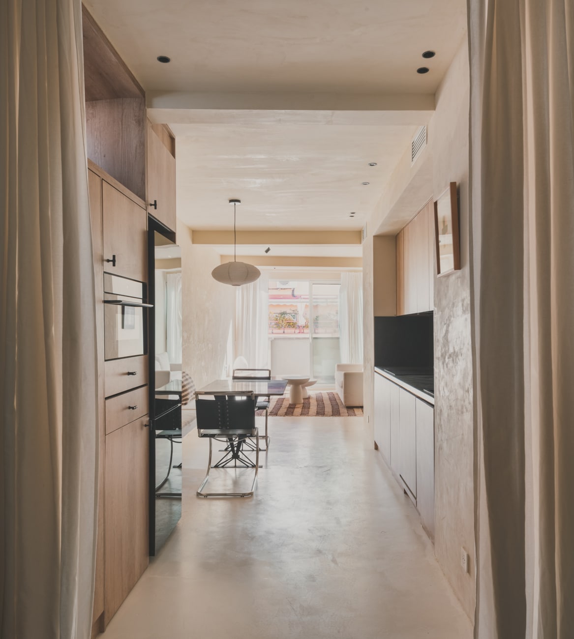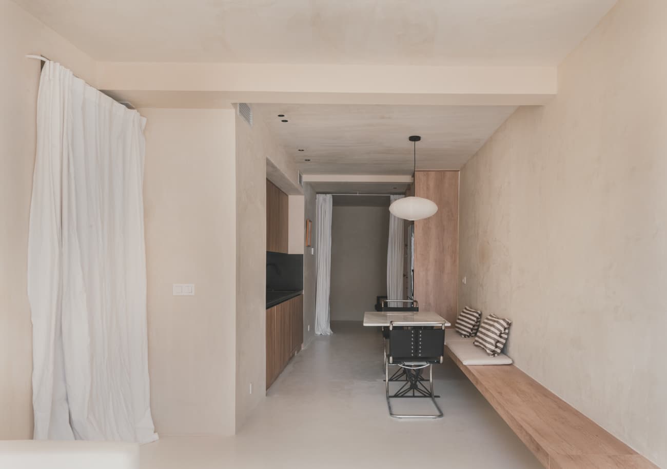 The daytime area, with integrated kitchen and living room, is arranged as a single fluid and contemporary environment. Spaces connect without interruption, materials interact with natural light, and every decision seeks to create a sense of calm and openness.