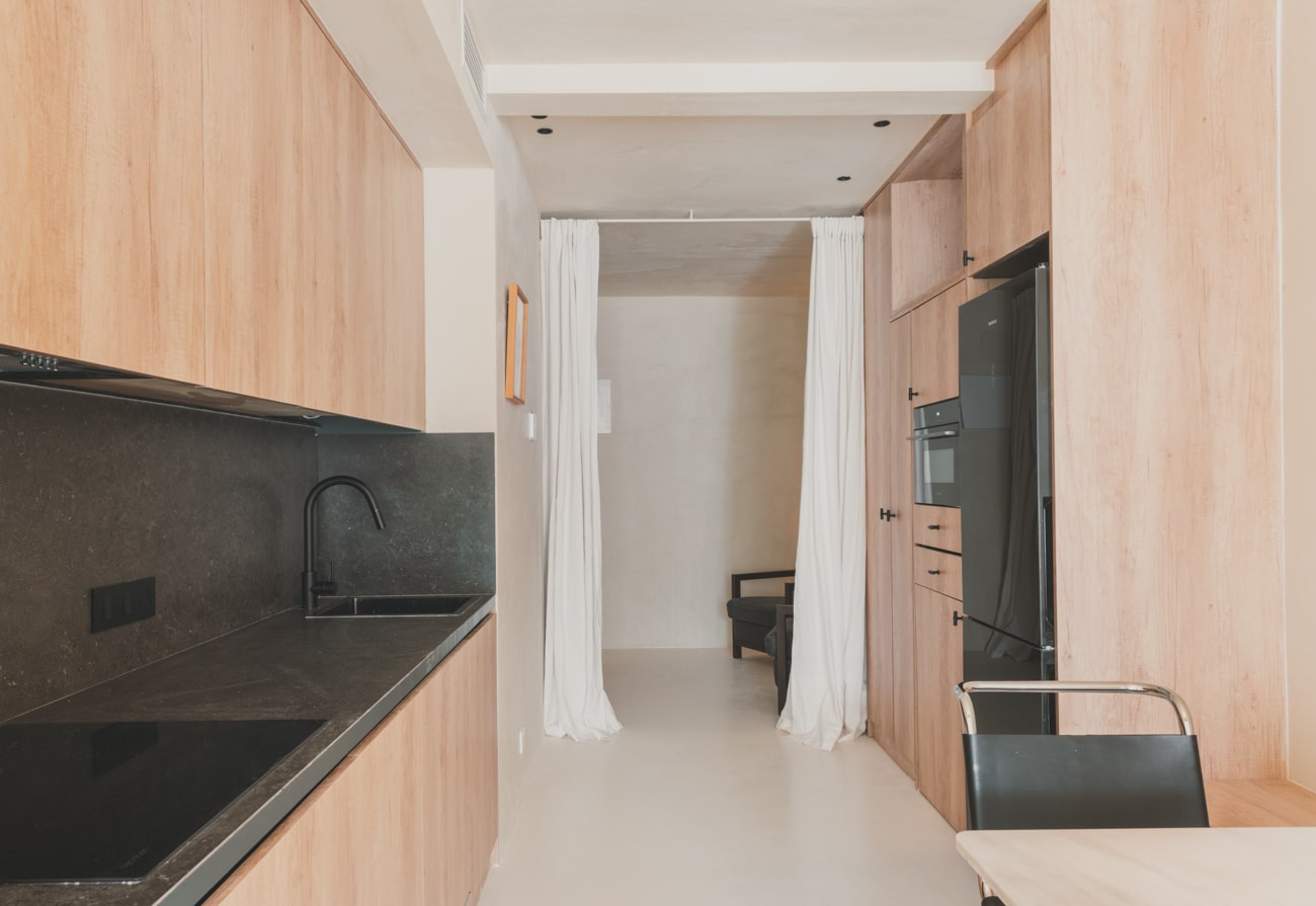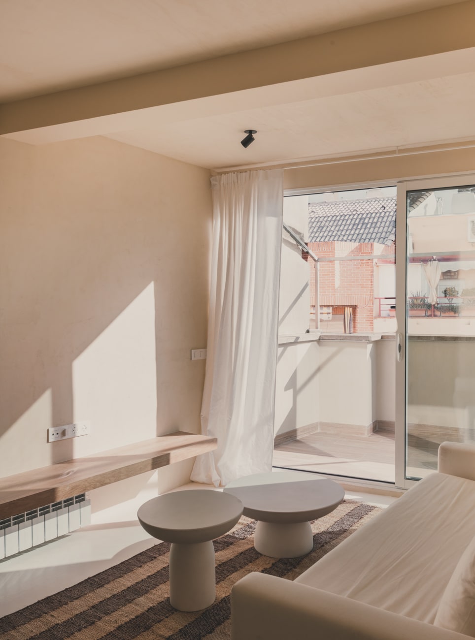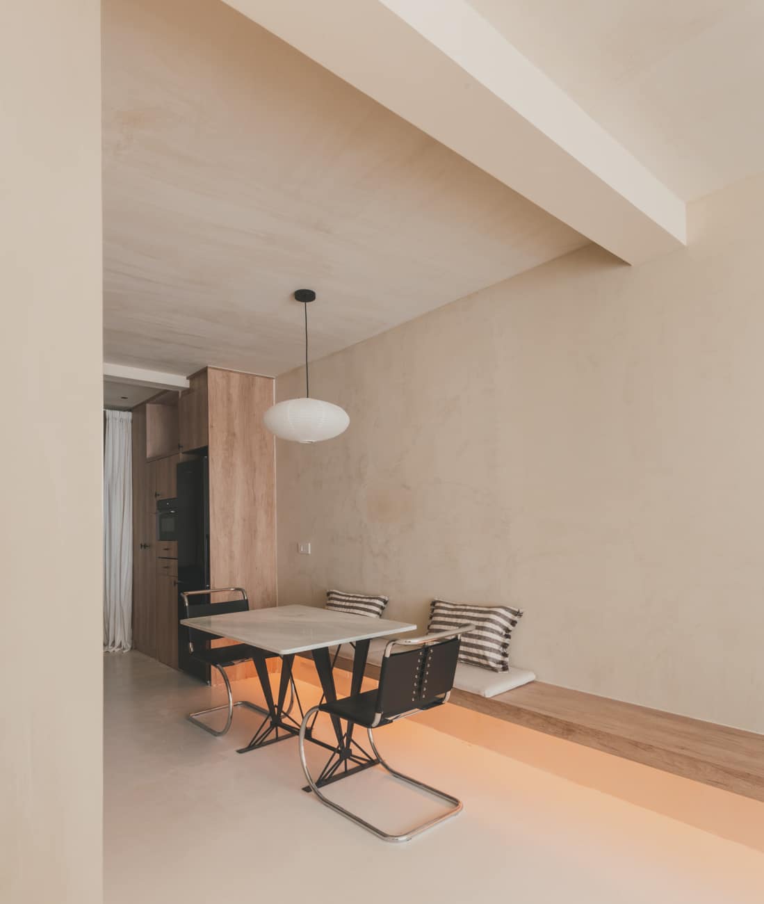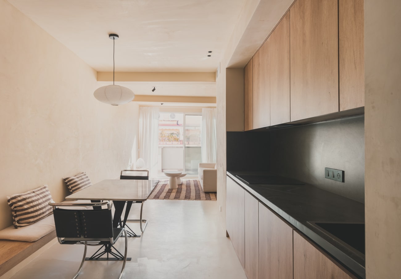 The daytime area, with integrated kitchen and living room, is arranged as a single fluid and contemporary environment. Spaces connect without interruption, materials interact with natural light, and every decision seeks to create a sense of calm and openness.