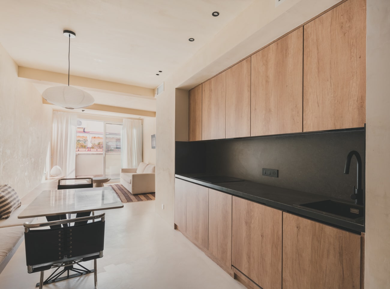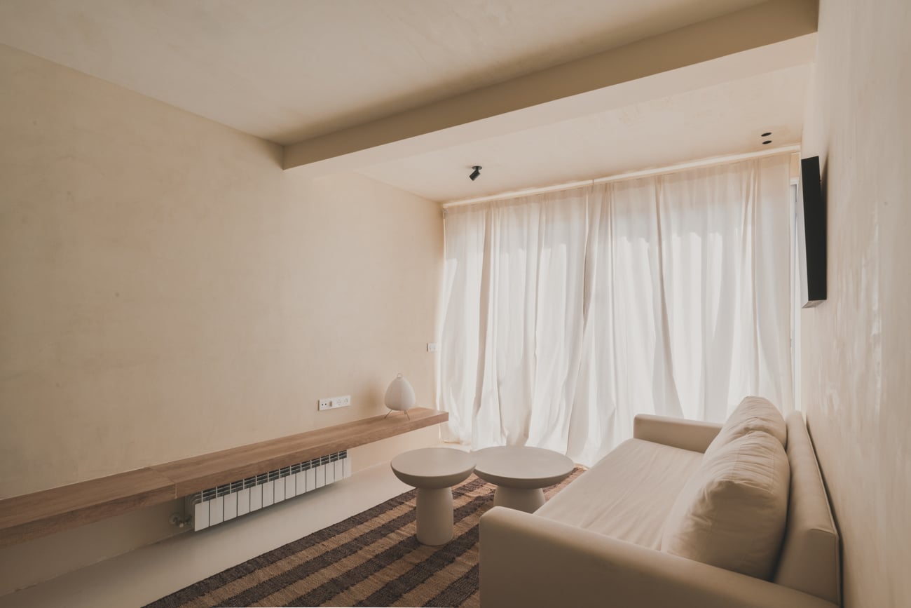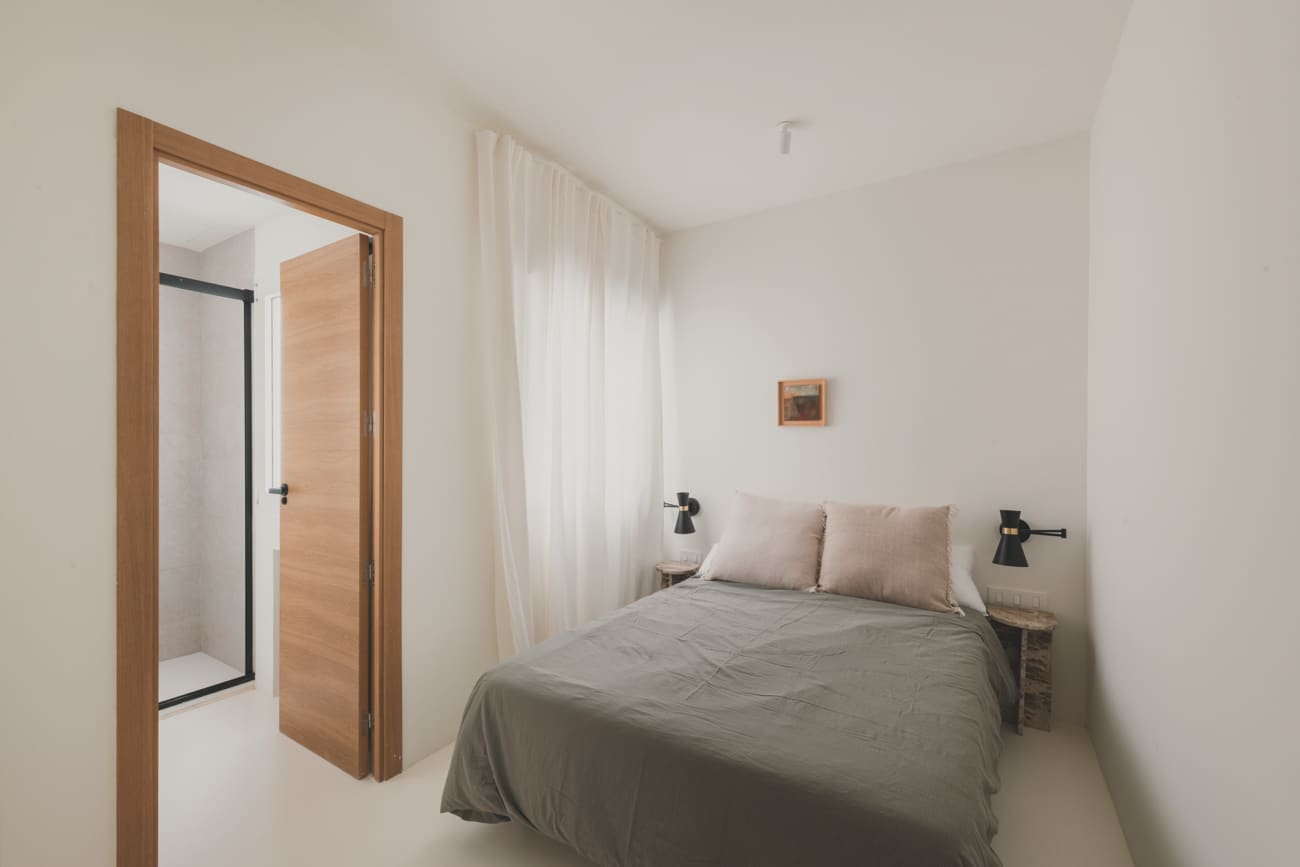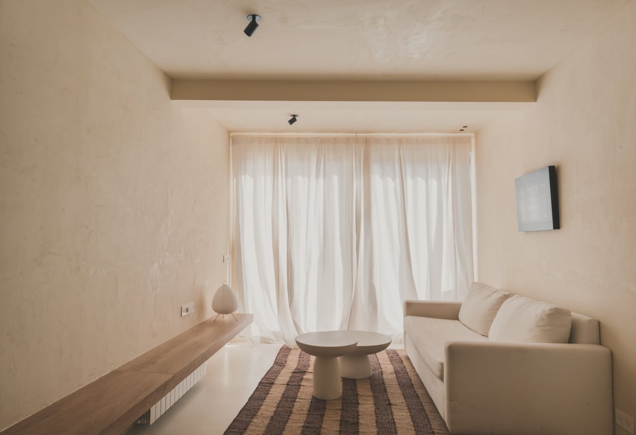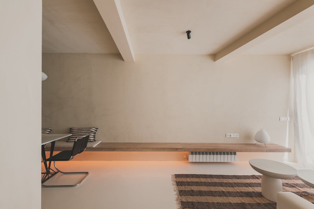 The daytime area, with integrated kitchen and living room, is arranged as a single fluid and contemporary environment. Spaces connect without interruption, materials interact with natural light, and every decision seeks to create a sense of calm and openness.