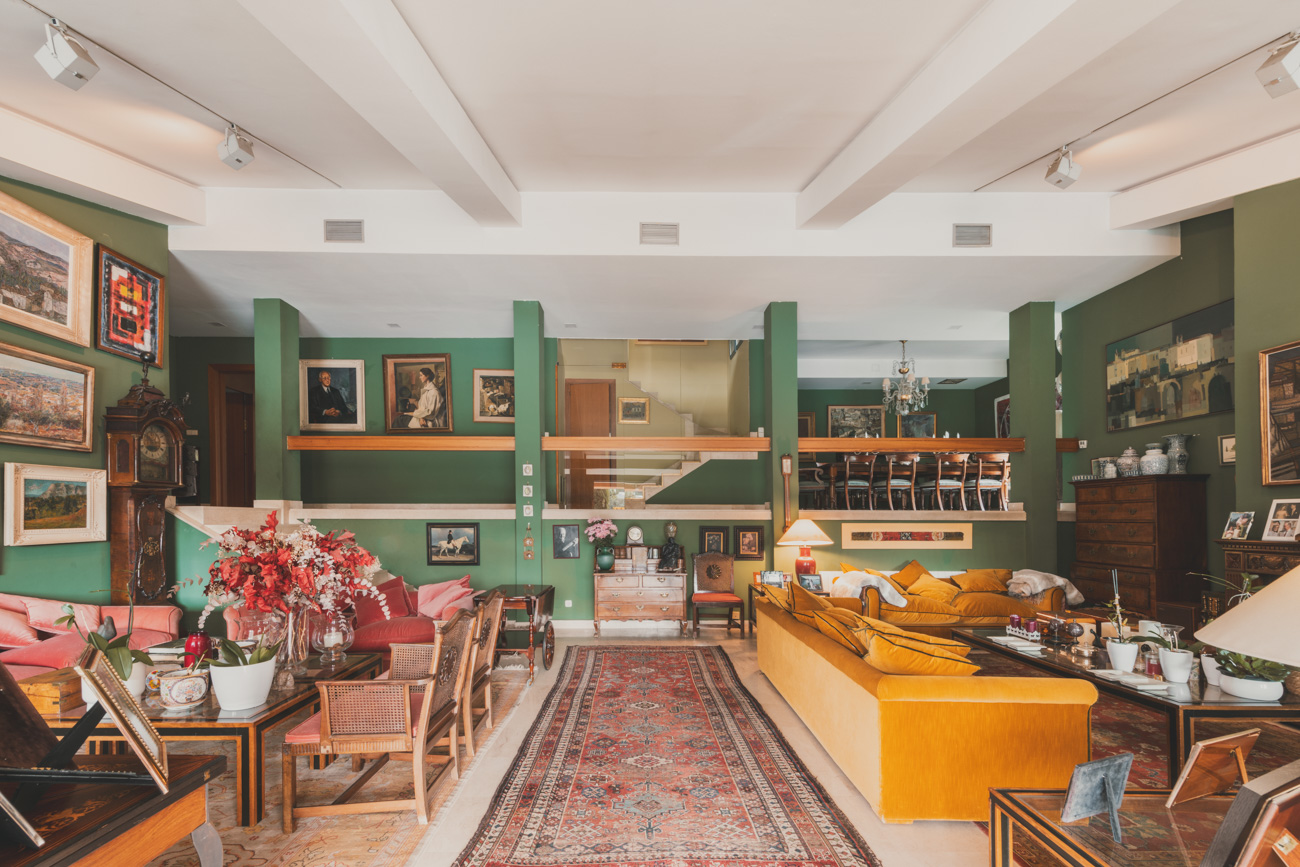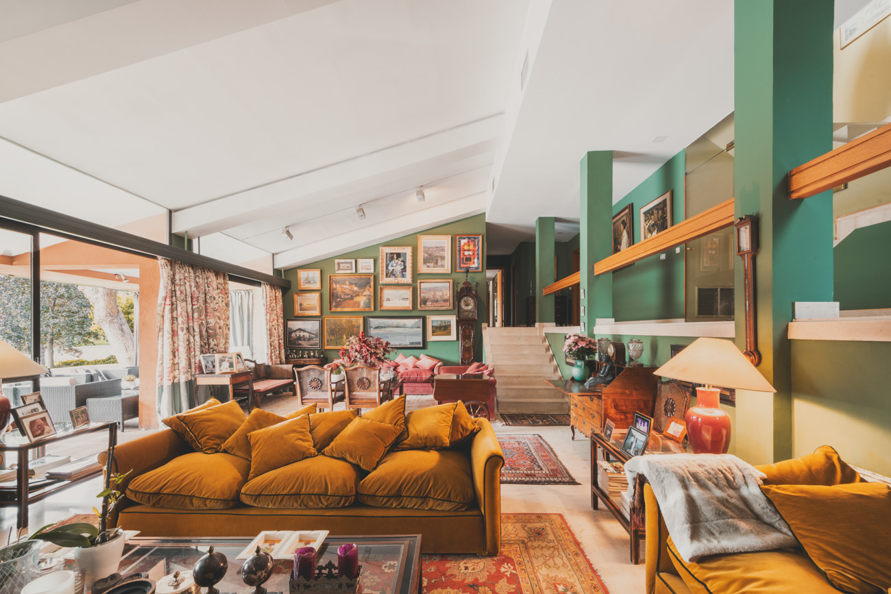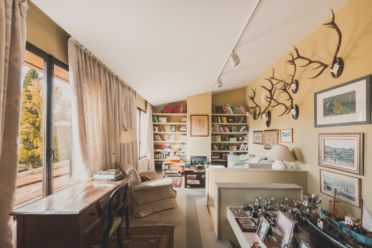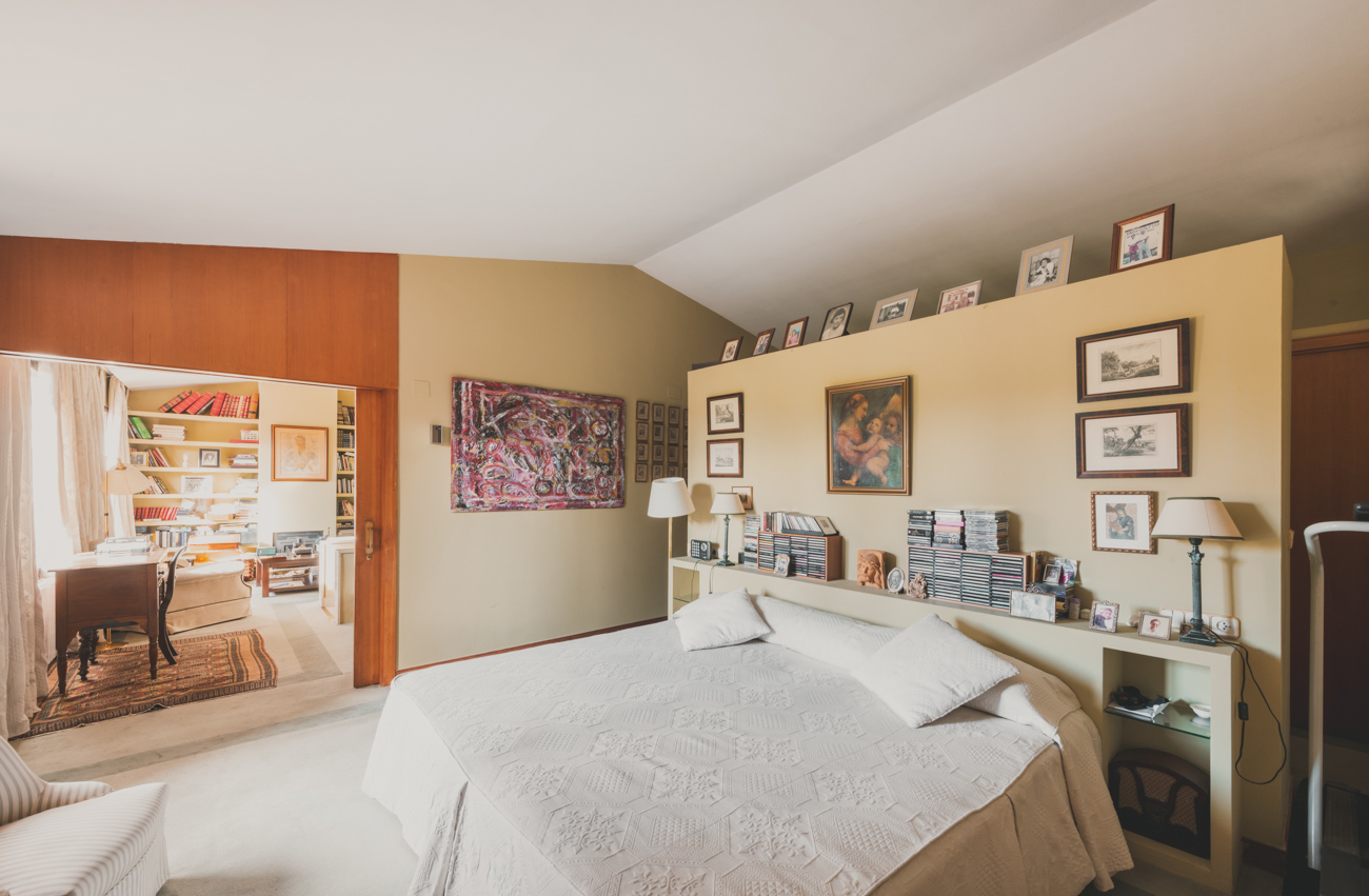 On the main floor, the social area unfolds in an open-plan design, free of architectural barriers, with magnificent views of the garden and a separate dining room. This level also includes a study, a large kitchen with its own service area, and a guest restroom.