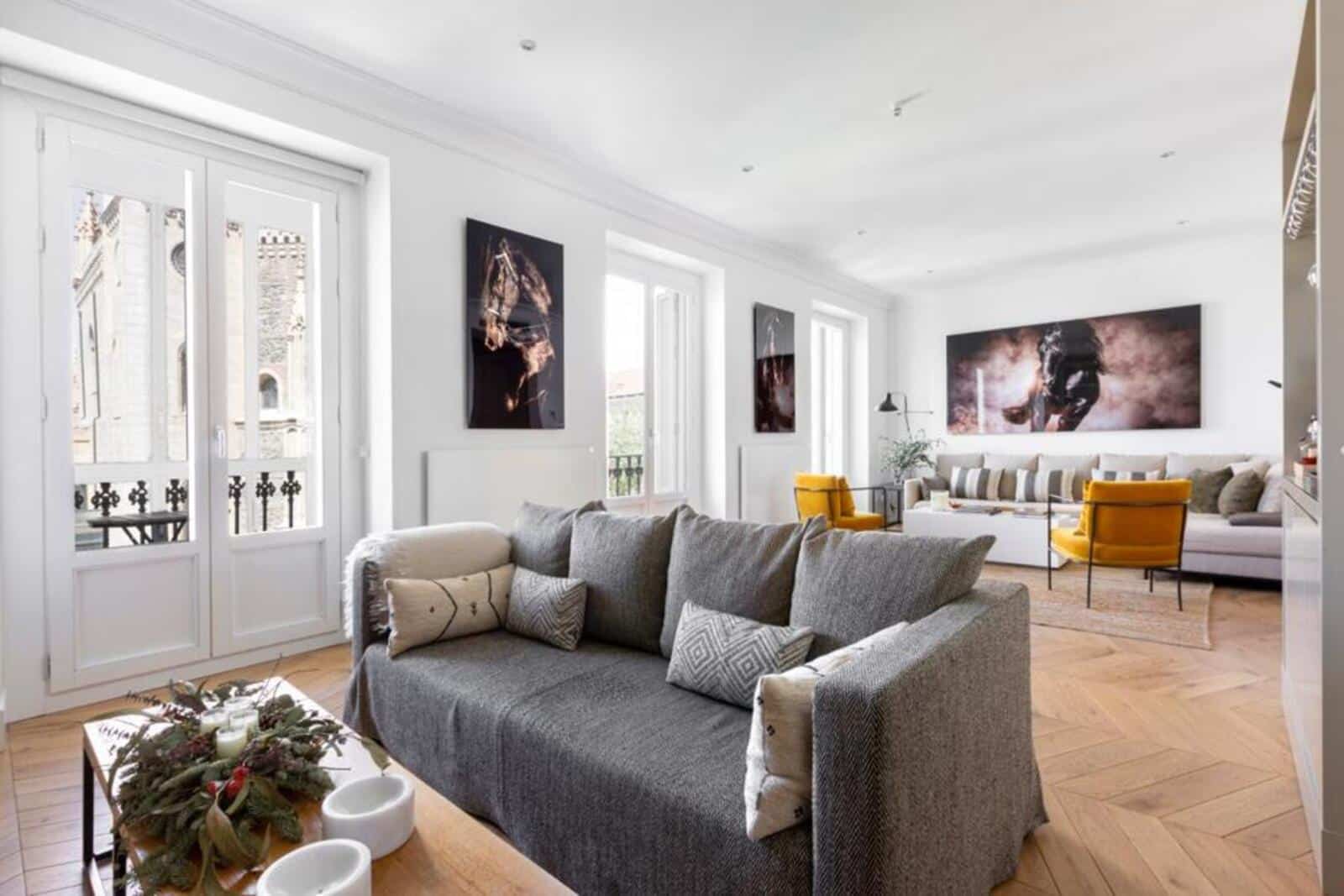 The refurbishment proposes open spaces to allow maximum light to enter through the two French balconies and the large bay window. The rooms are spacious with floor-to-ceiling interior balconies. Exquisite interior design and designer kitchen with large central island, top of the range appliances, separate laundry and first class materials throughout. Herringbone oak wood floors, individual heating, thermal and acoustic insulation, and adjustable concealed air-conditioning in each room.