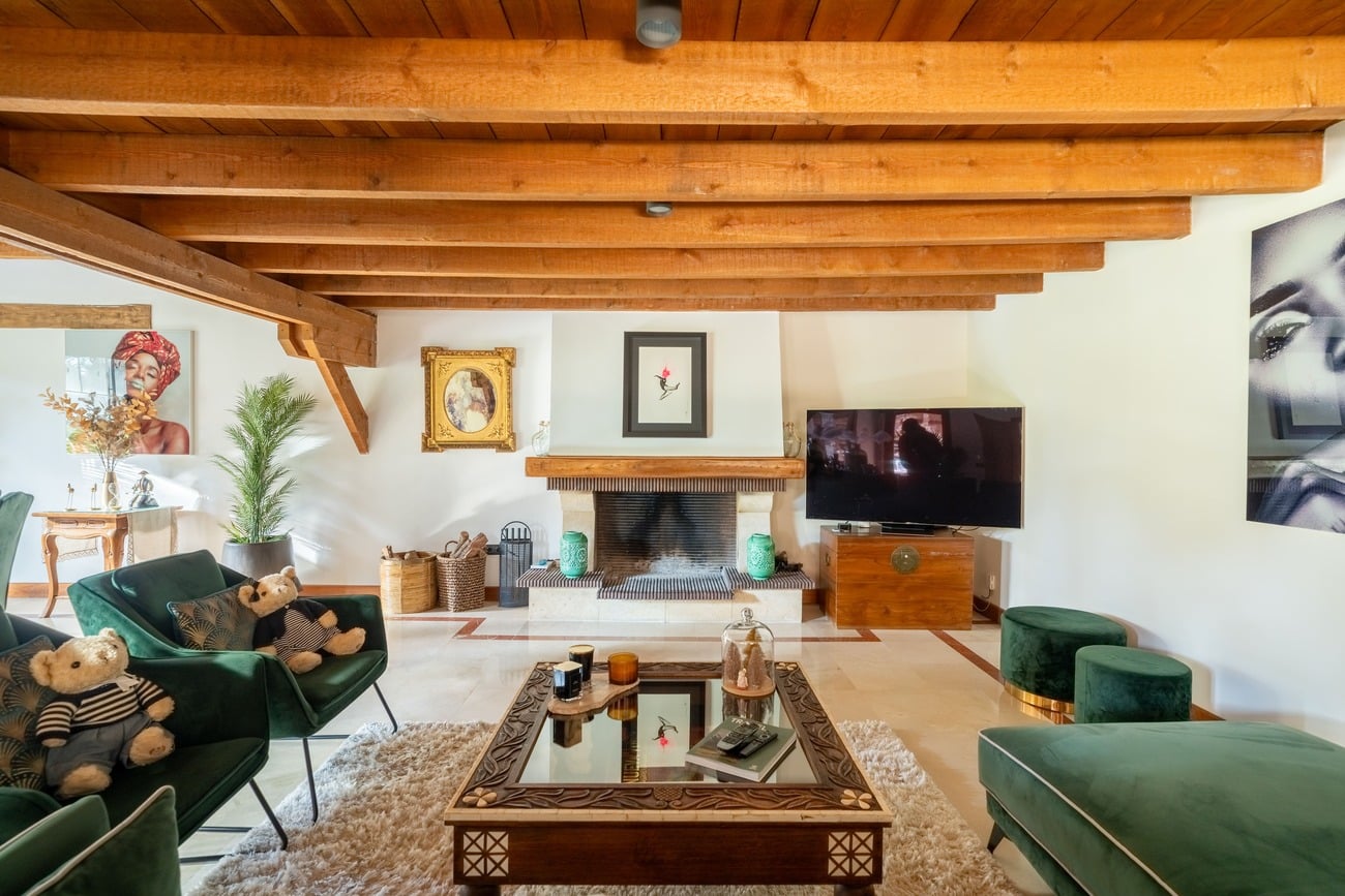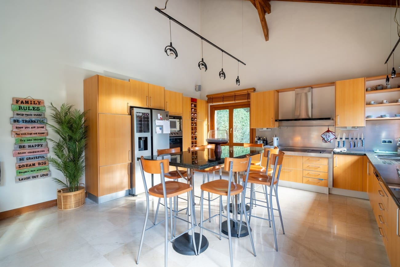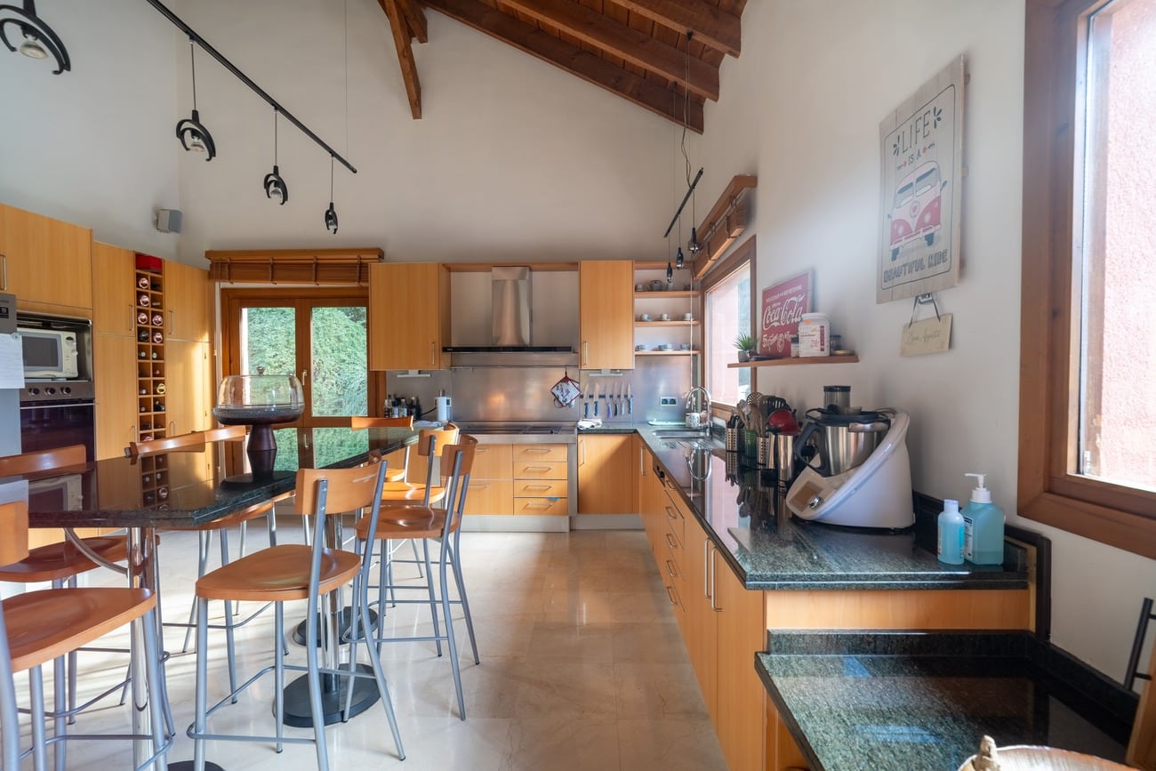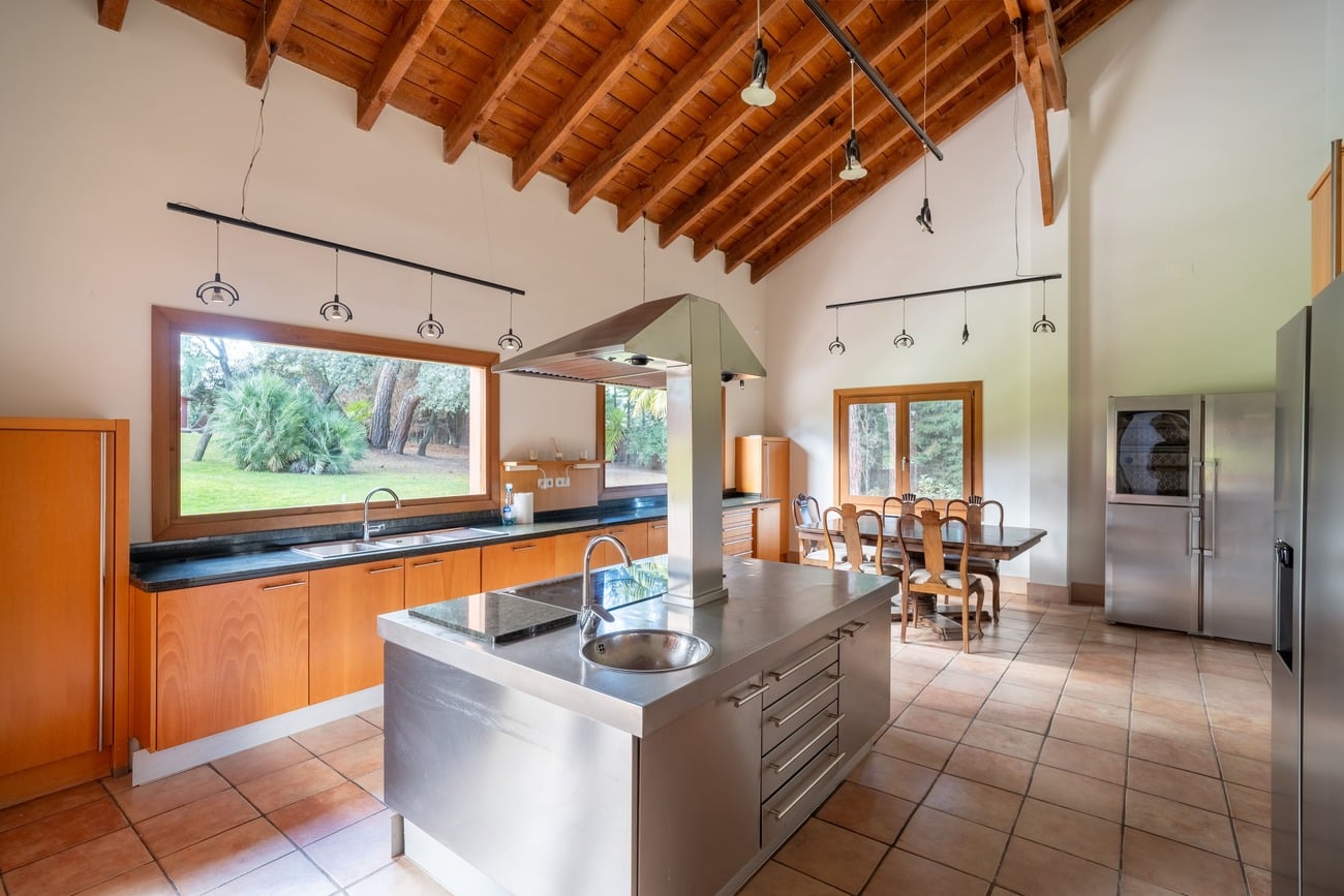 The daytime living area is organized around spacious living rooms with fireplaces, conceived as the central hub of the home. Bright spaces with large windows and direct access to the porches and garden allow for an especially pleasant indoor–outdoor lifestyle. The property features two kitchens, one of which includes a breakfast area, both perfectly sized for everyday use as well as for larger family or social gatherings.