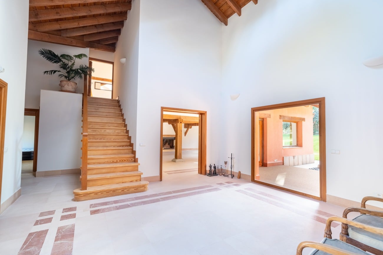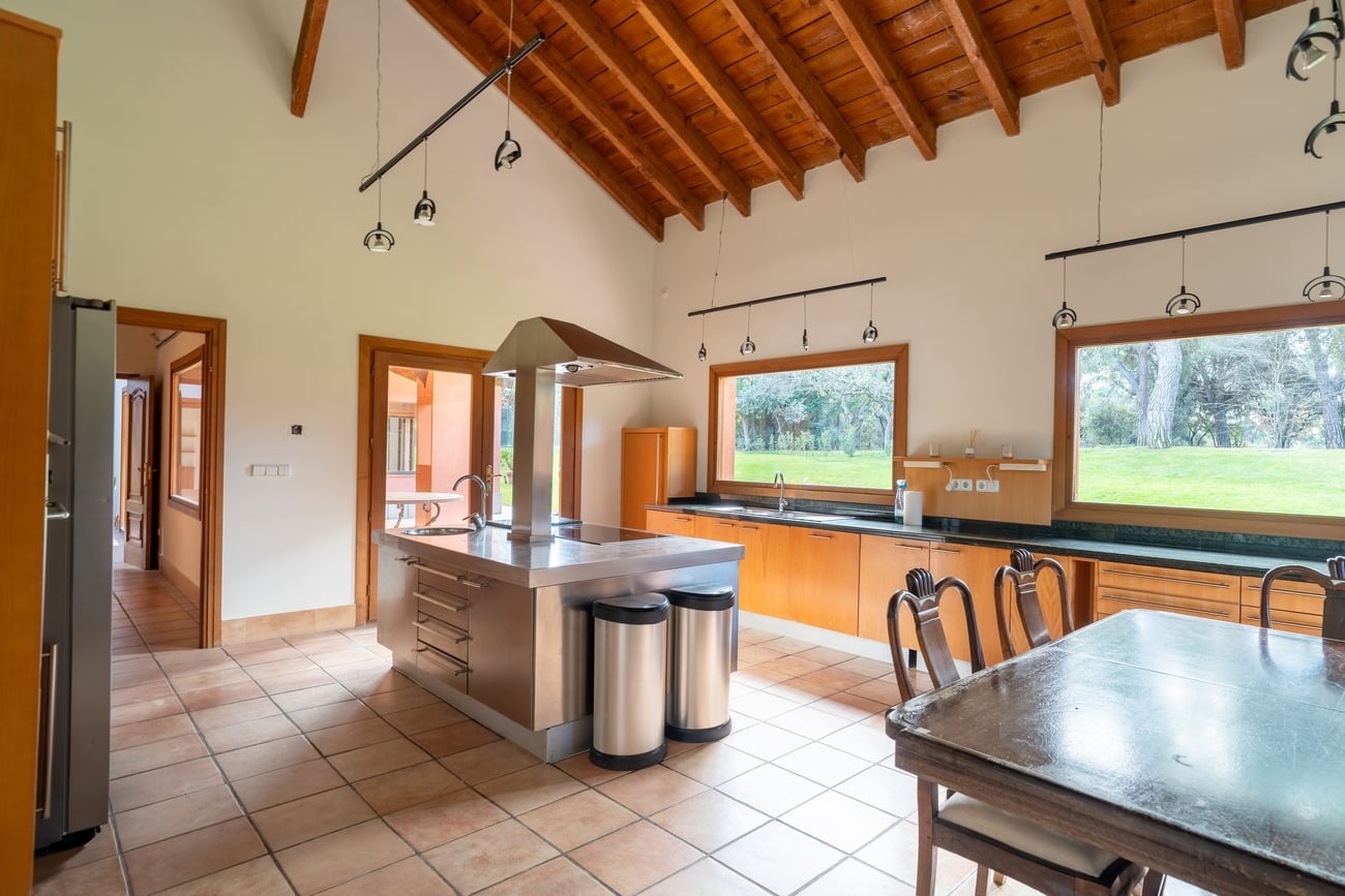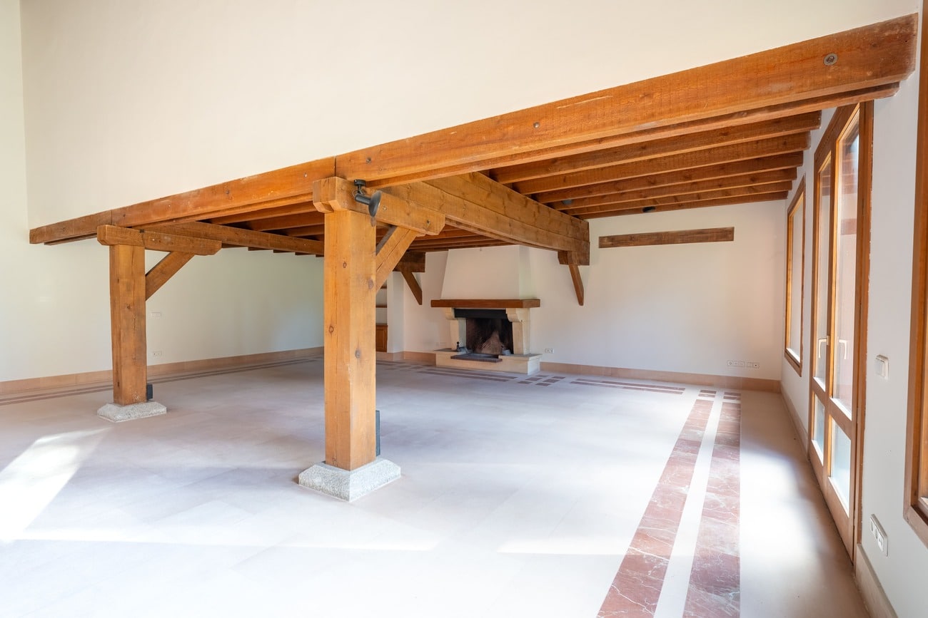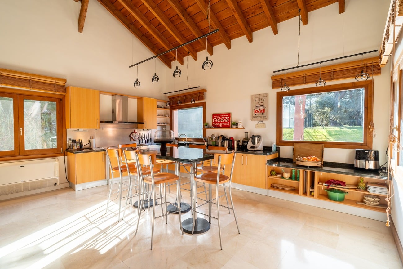 The interior spaces are distinguished by high vaulted ceilings with exposed wooden beams, which add warmth and character, as well as by abundant natural light thanks to large windows that open directly onto the porches and garden.