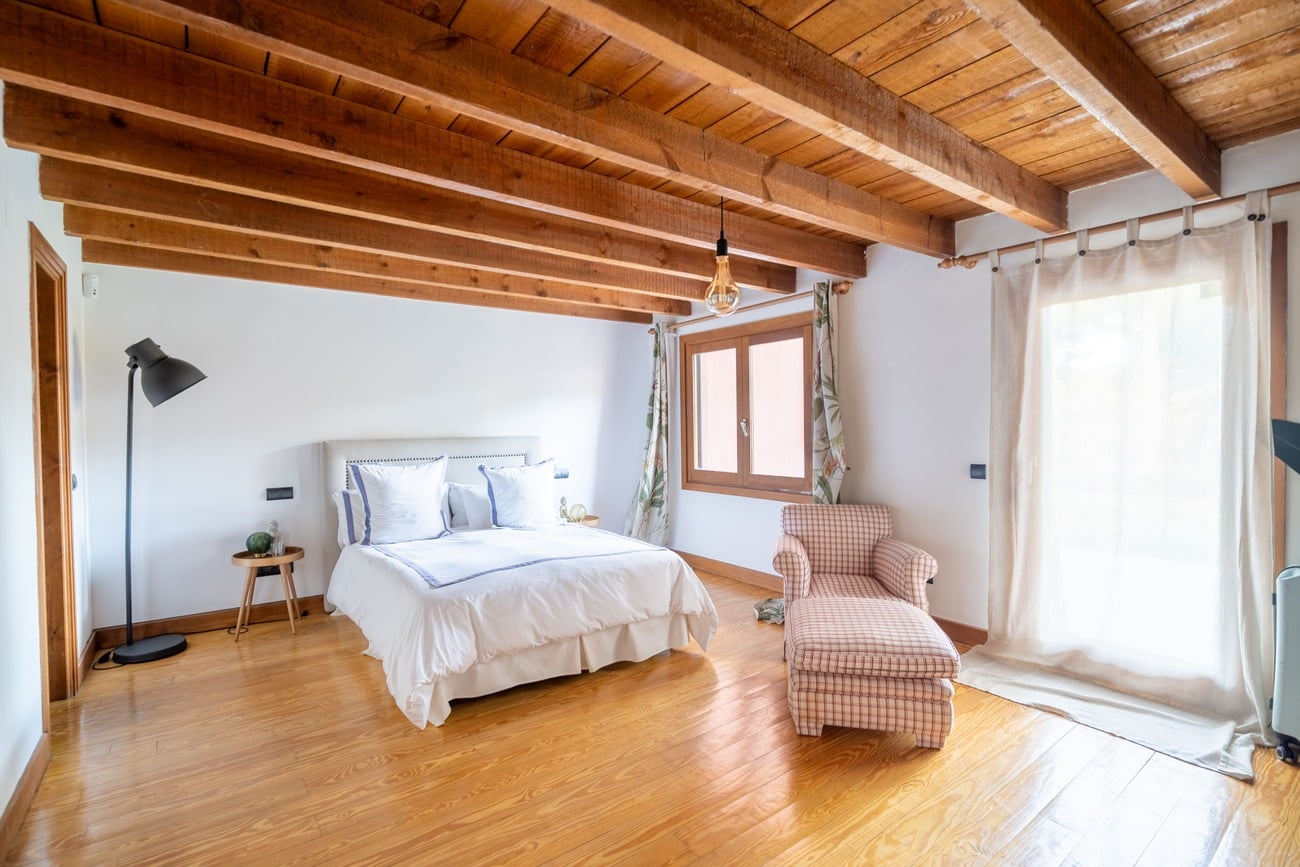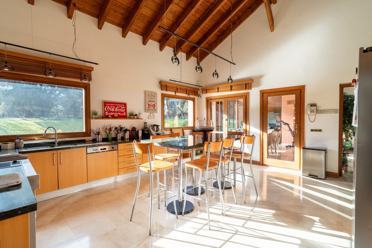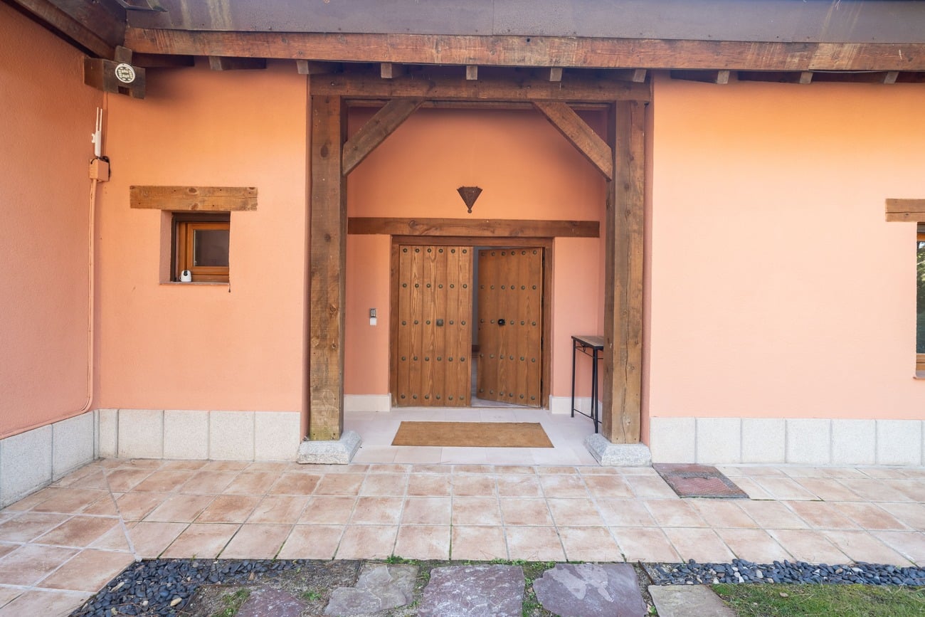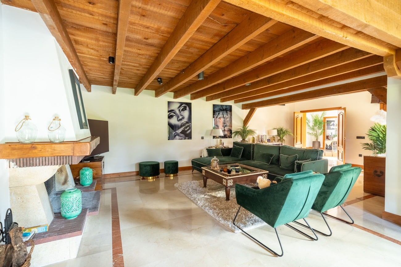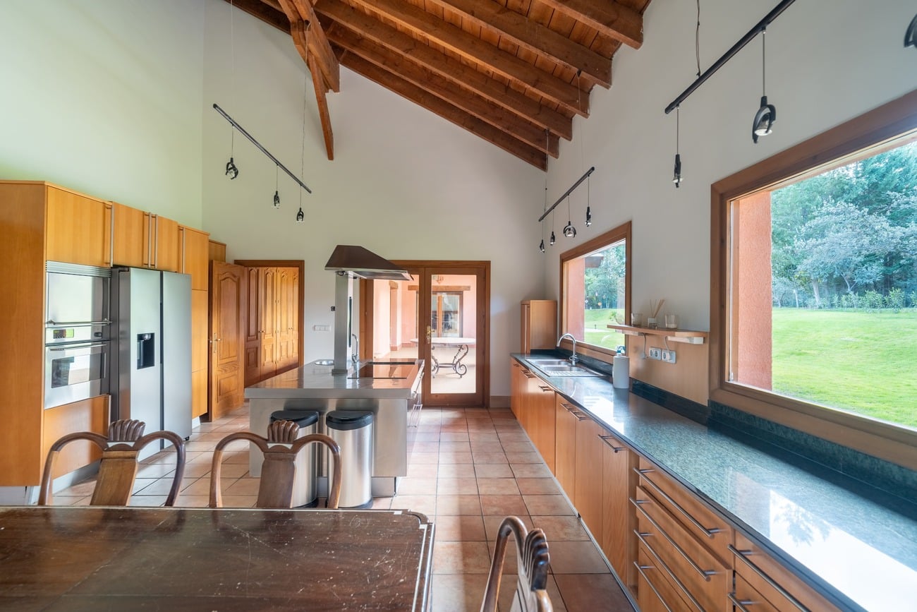 The interior spaces are distinguished by high vaulted ceilings with exposed wooden beams, which add warmth and character, as well as by abundant natural light thanks to large windows that open directly onto the porches and garden.