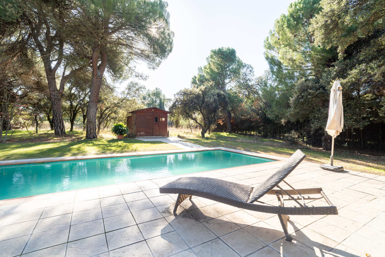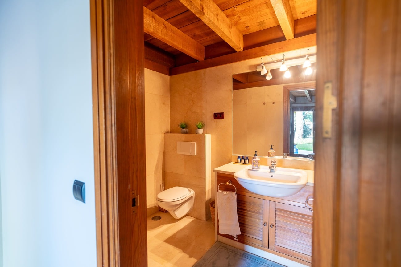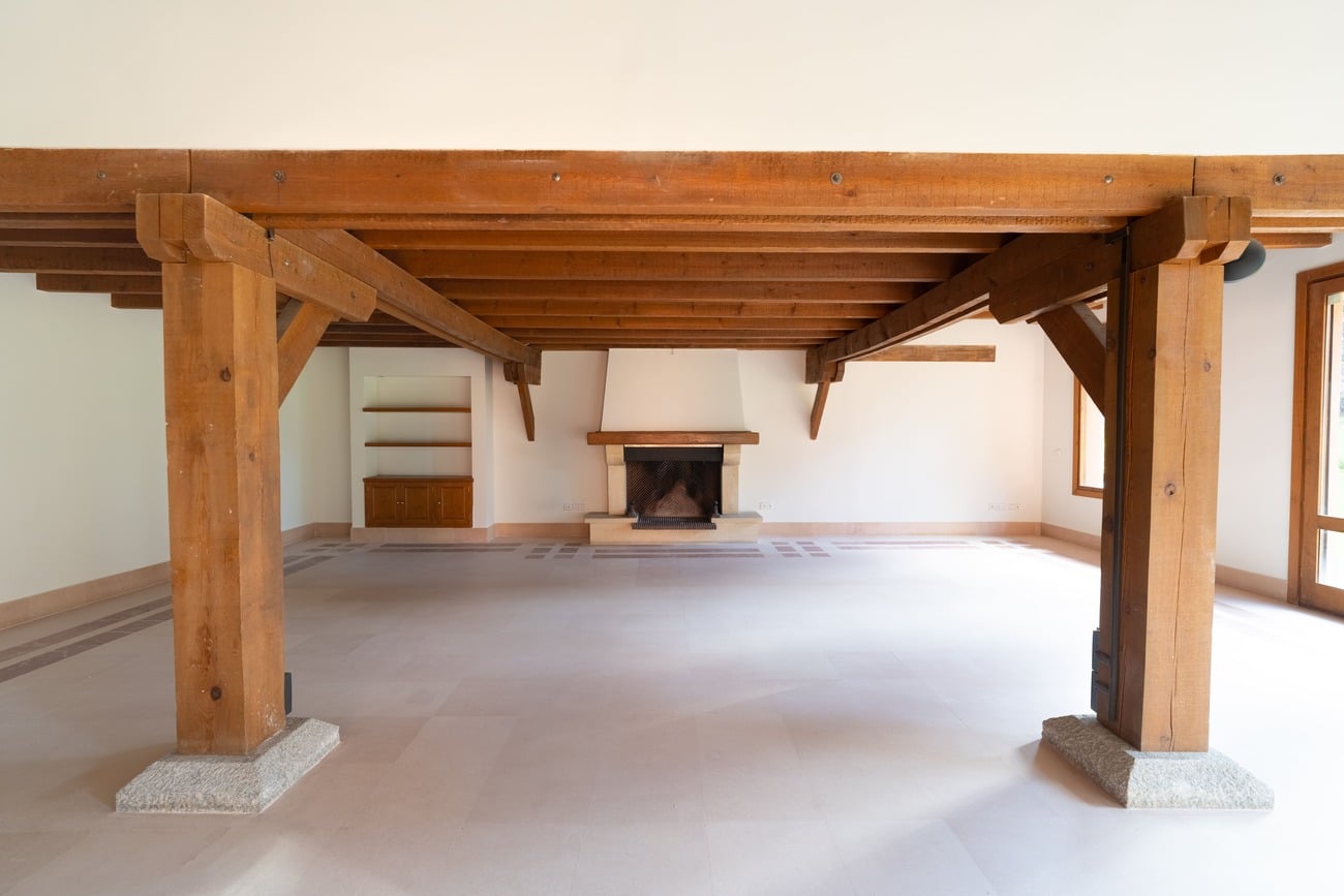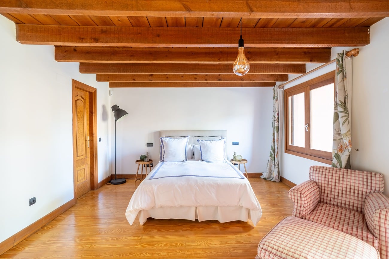 The interior spaces are distinguished by high vaulted ceilings with exposed wooden beams, which add warmth and character, as well as by abundant natural light thanks to large windows that open directly onto the porches and garden.