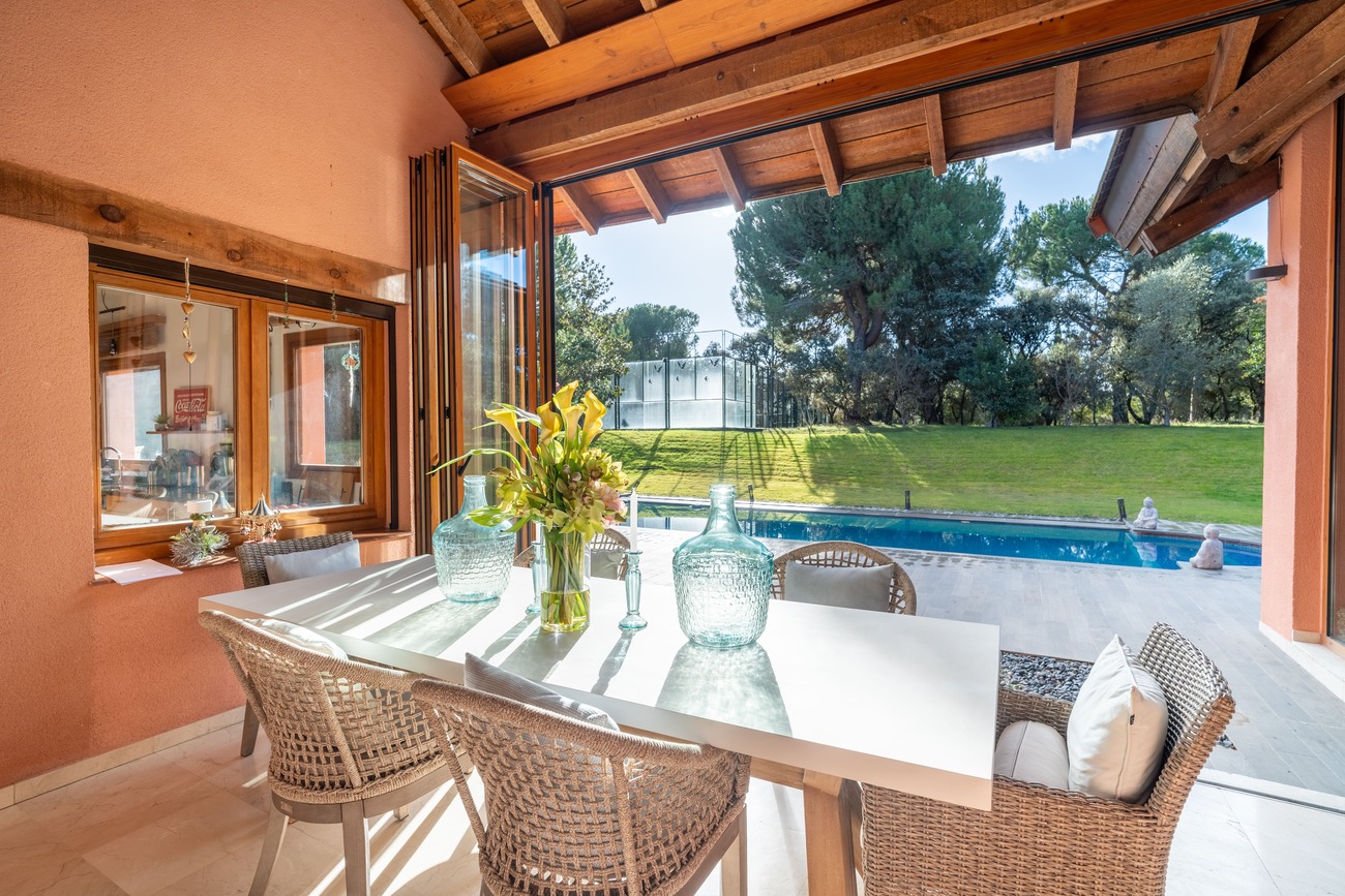 The home is completed by versatile spaces suitable for use as a home office, playroom, or work area; a service quarters with an independent bedroom and bathroom; and an indoor garage with capacity for four vehicles. Outdoors, the established garden features two private swimming pools, a sports court, and a sauna area, turning the plot into a true extension of the living space.