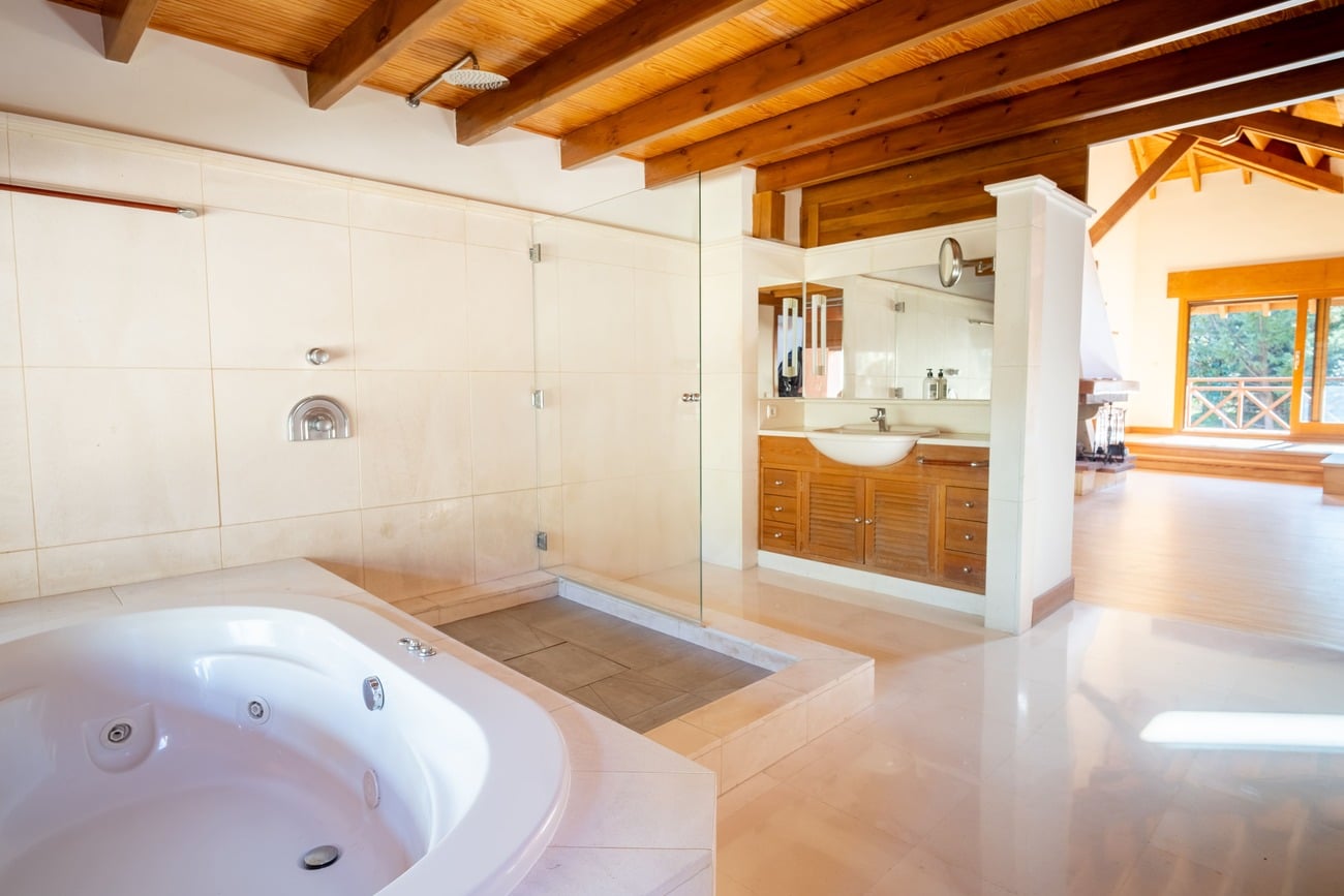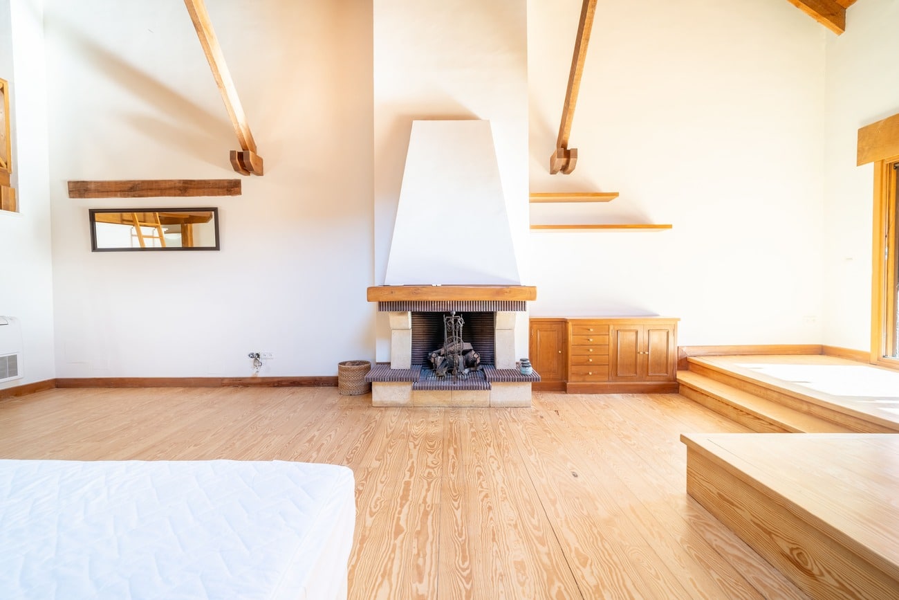 The sleeping area comprises six main bedrooms, several of them en suite, ensuring privacy and comfort. The primary suite features a fireplace, walk-in closet, and access to a private terrace, creating a peaceful and independent retreat within the home. The layout allows family and guests to be accommodated comfortably, while maintaining a clear separation between living areas.
