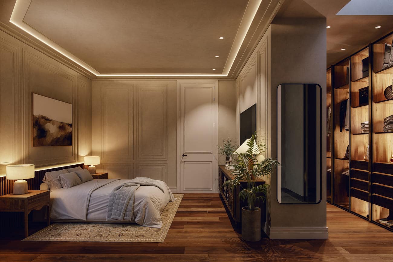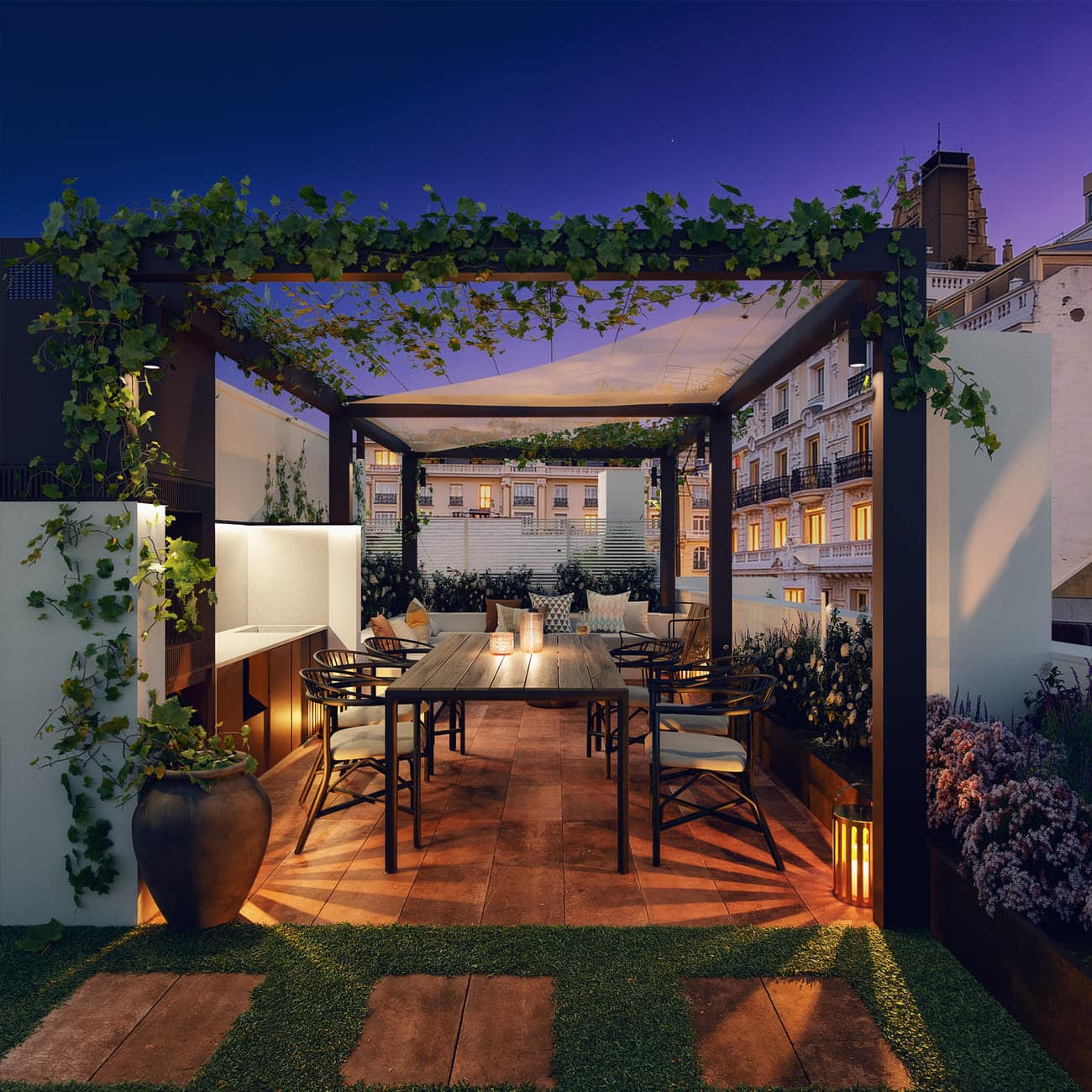 Each penthouse features outdoor terraces conceived as an extension of the social living areas. On the rooftop, expansive private gardens unfold, designed as truly livable landscapes. These spaces include outdoor kitchens, dining and lounge areas, pergolas, water features, chill-out zones, and a swimming pool, creating an intimate and exclusive setting above the city’s rooftops.