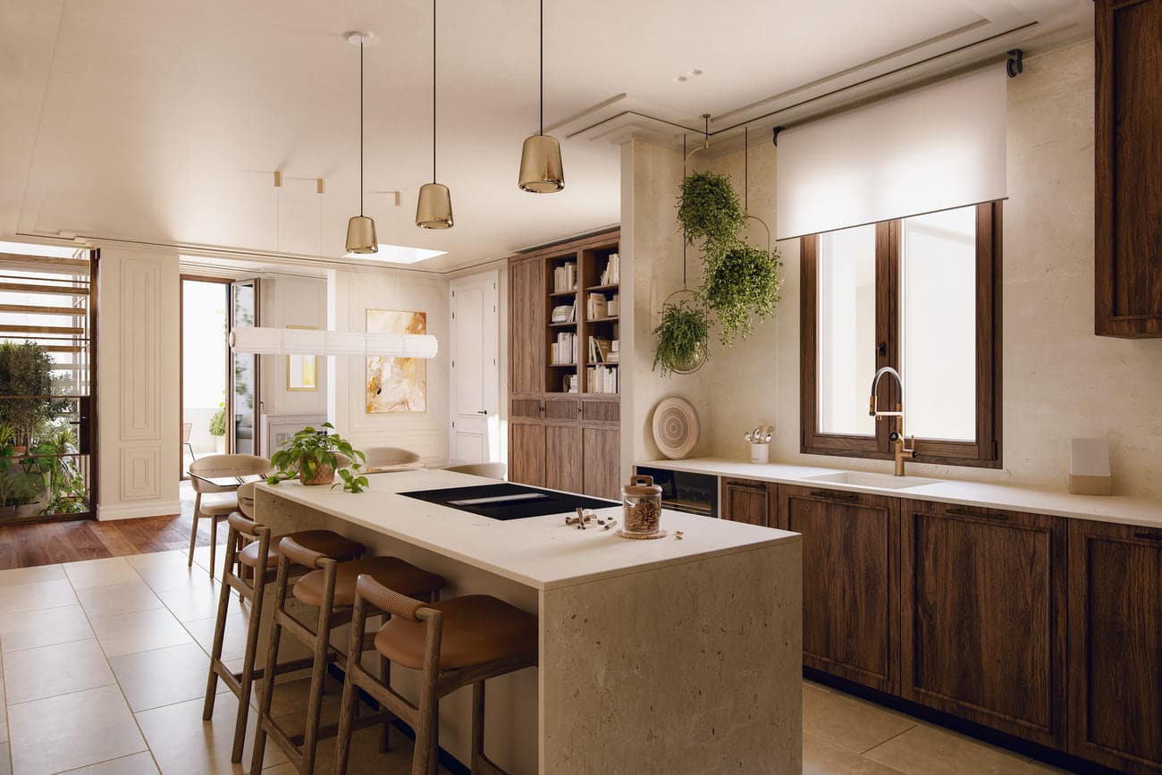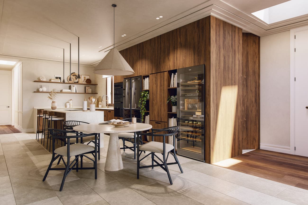A proposal that engages in dialogue with the timeless Madrid through a contemporary, refined, and respectful approach, optimizing every space and highlighting the unique experience of penthouse living.