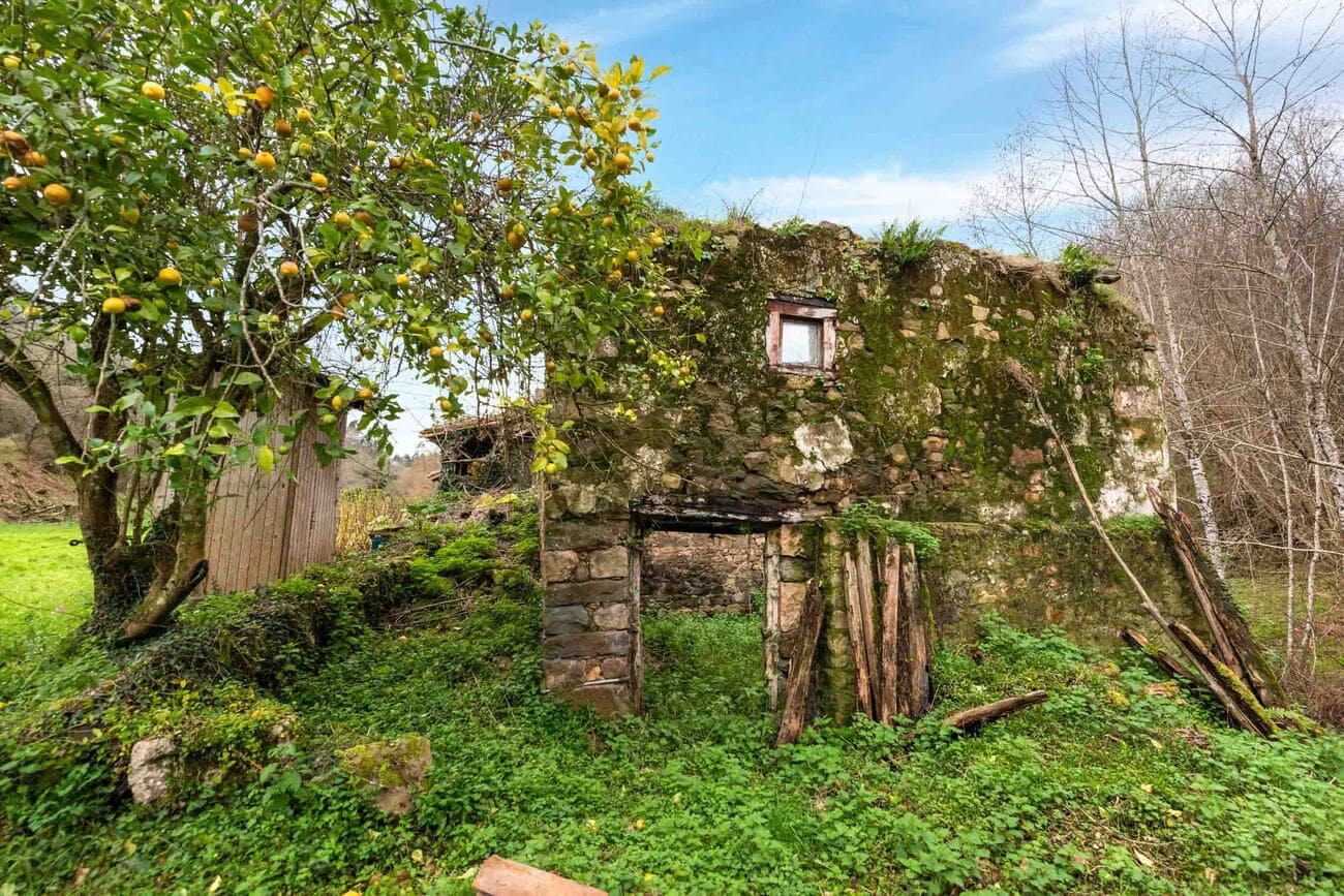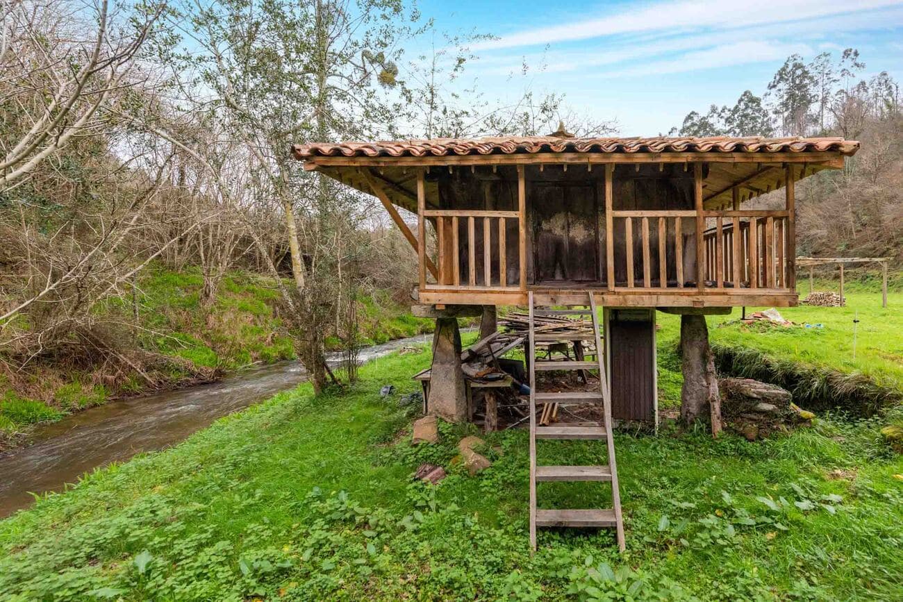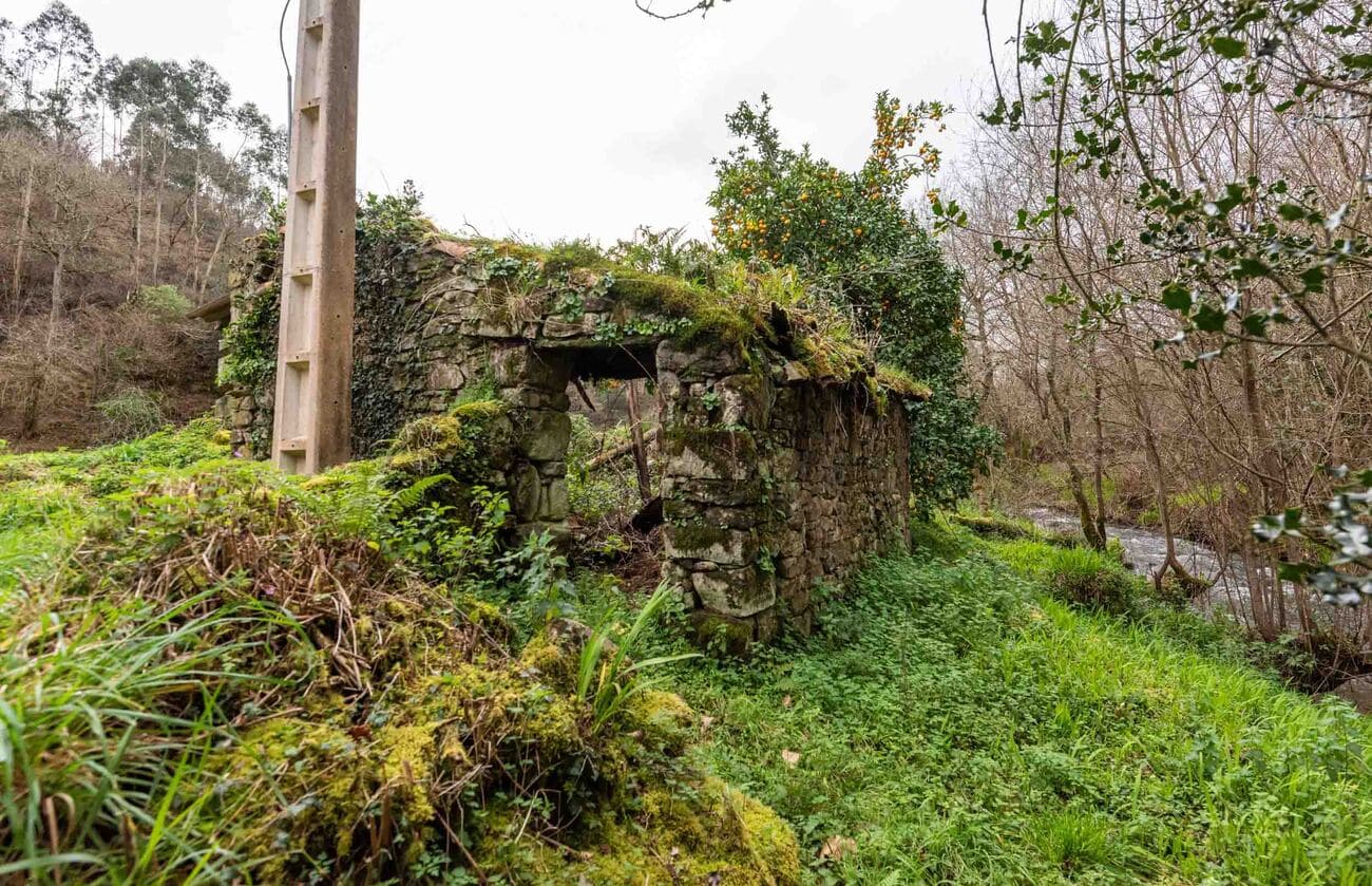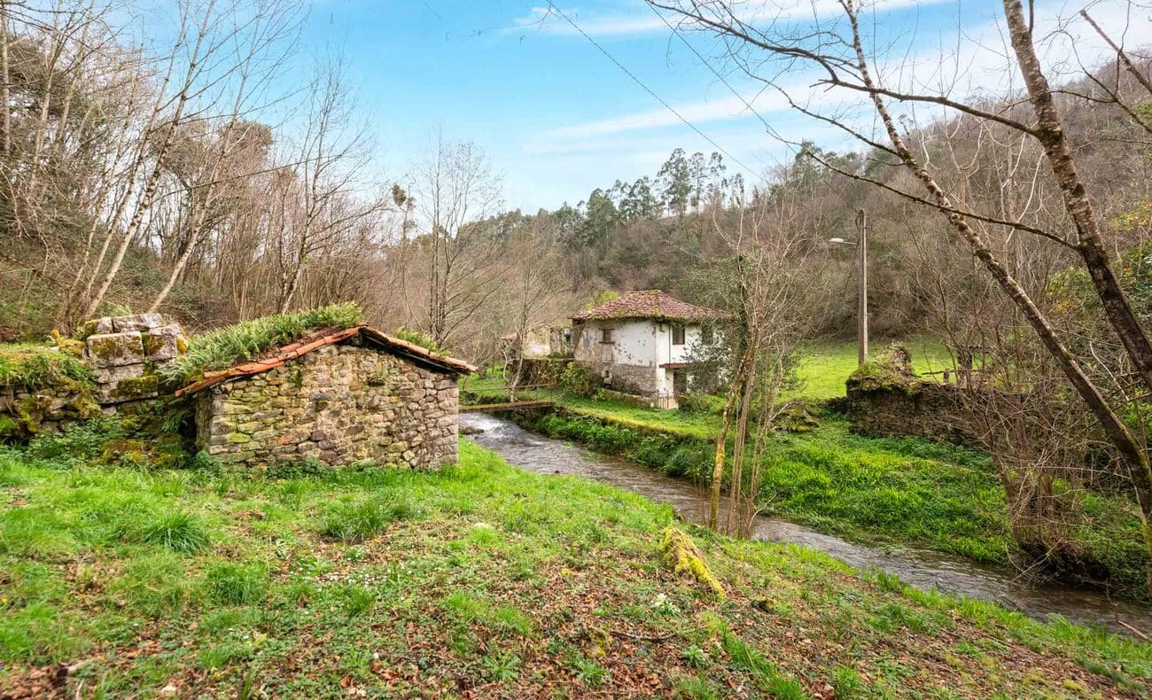 The estate, spanning two hectares, comprises five independent structures that require full renovation: a two-storey main house of 200 m², a recently restored traditional hórreo that preserves the local architecture, a stable, an old mill, and a barn used as an auxiliary annex. Altogether, they offer an approximate buildable surface of 300 m².
