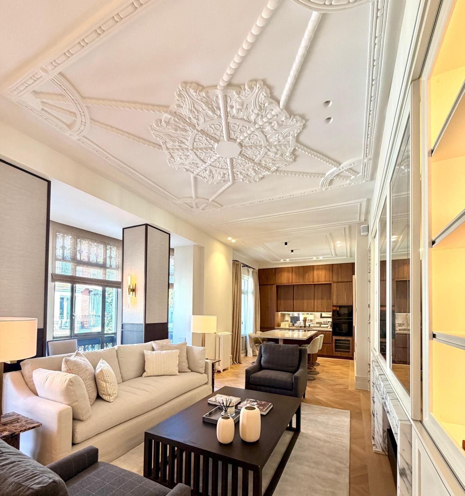 A perfect fusion of a privileged location, historic character, and contemporary design. Situated in the heart of the Golden Mile in the Salamanca district, it occupies the fourth floor of a distinguished building that has been completely renovated with top-quality materials. The meticulous interior design combines classic elements with a modern and functional style, creating bright and elegant spaces.