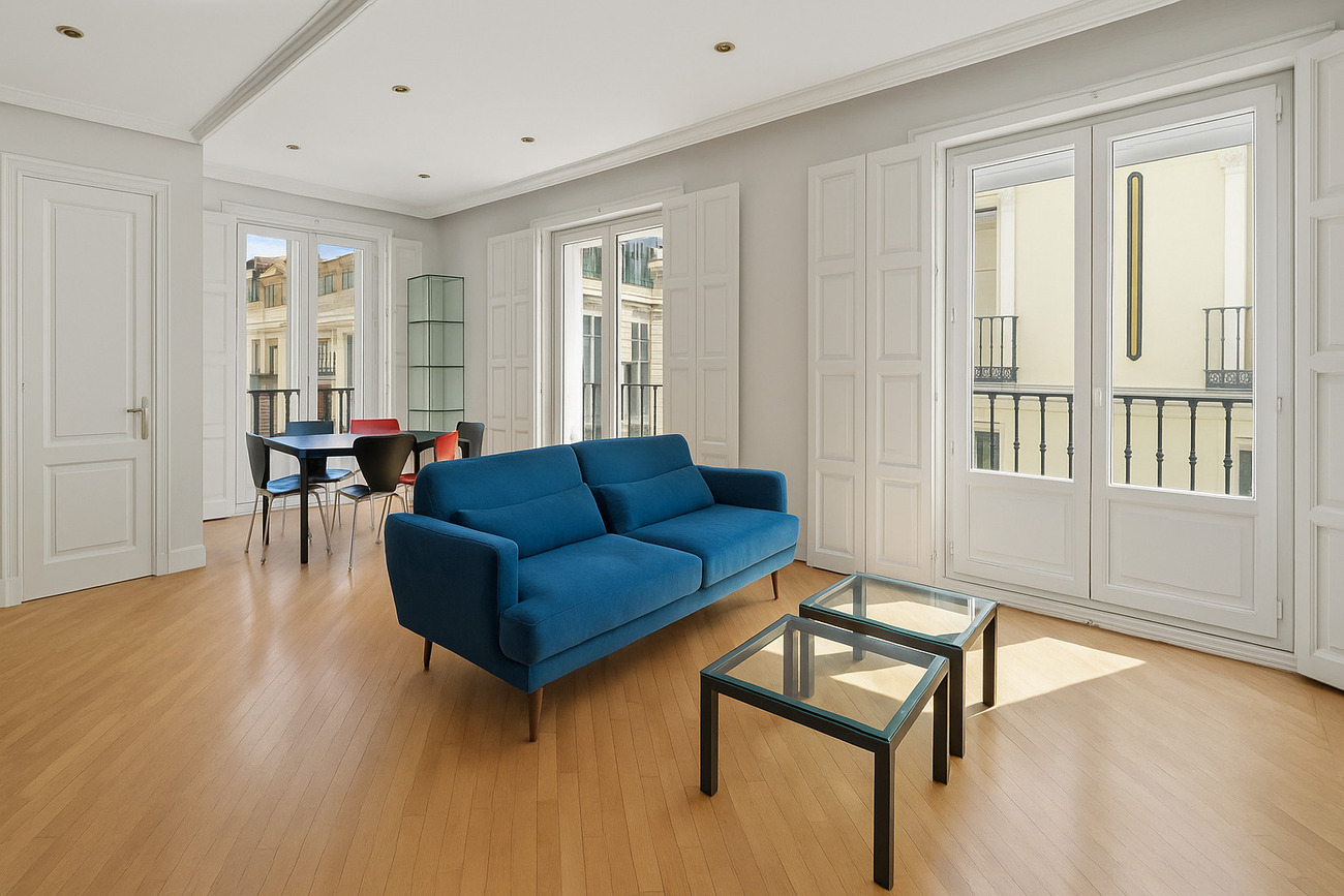 What makes this property truly special is its corner location, which grants it an exceptional architectural presence and a warm, enveloping brightness throughout the day. The six corner balconies offer a direct connection with the outdoors, allowing you to enjoy the rhythm and beauty of the Justicia neighborhood from a privileged vantage point.