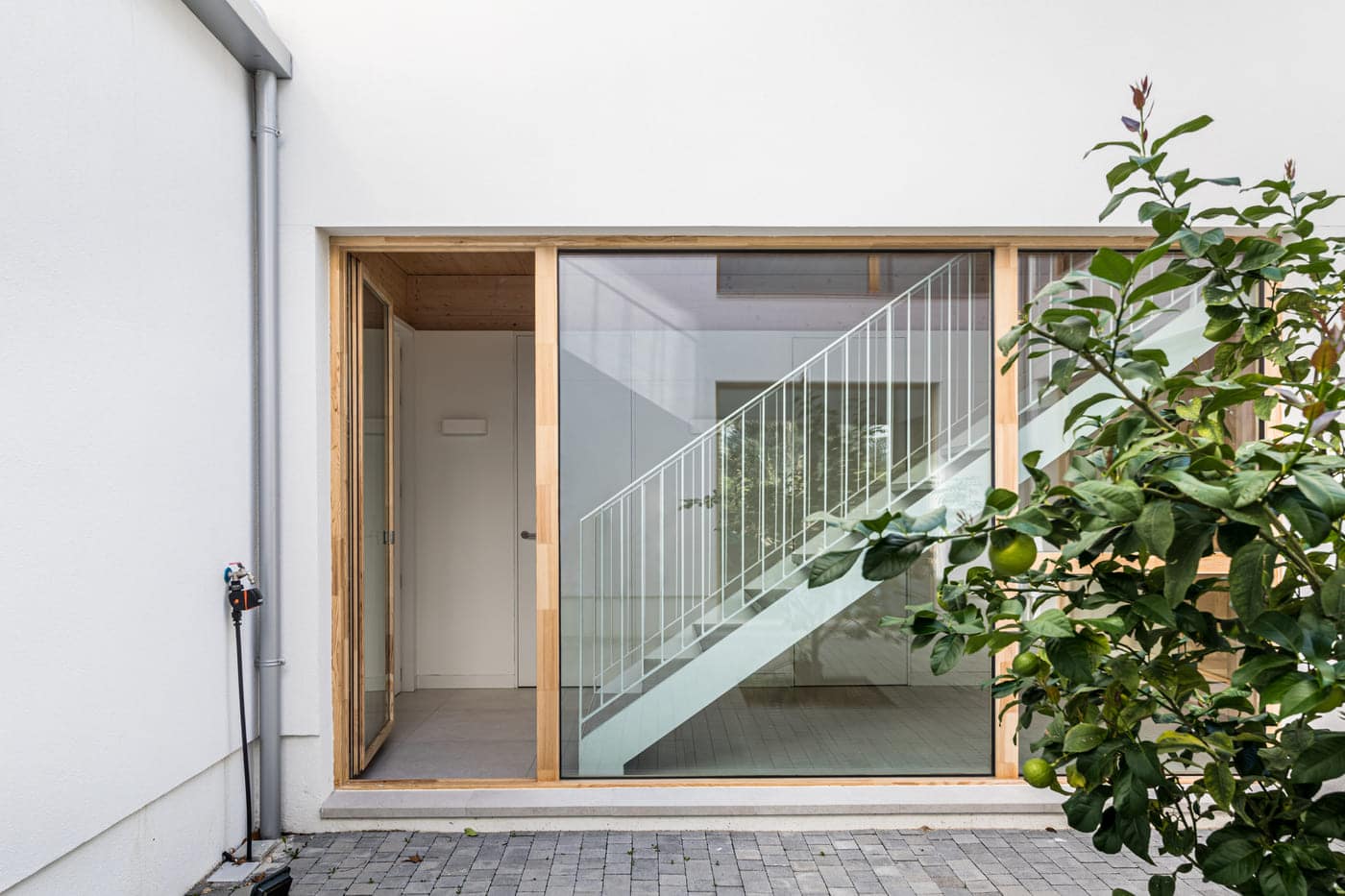 Para conseguir unos altos niveles de eficiencia energética, la vivienda se orienta mayoritariamente al sur, con aperturas más controladas en este y oeste evitando las aperturas al norte. Tan solo se tiene una licencia en la fachada norte de la planta baja que linda con el patio para darle continuidad al jardín hacia el interior. “Queríamos incorporar el exterior en el interior, de ahí el diseño del patio. La percepción del jardín llega hasta el final de la casa. Orientamos la casa al sur, ya que queríamos que el sol llegara a todas las estancias de la vivienda”, cuenta Luis Javier Aguilar, otro de los arquitectos.