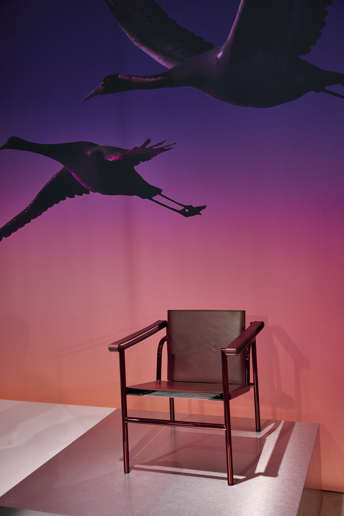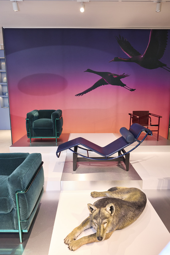 El arraigo de la obra de Le Corbusier®, Jeanneret® y Perriand® a la filosofía de la racionalidad y el progreso, ha sido reinterpretado por el estudio Formafantasma “no como una visión prístina de perfección industrial, sino como algo más abierto y poroso. El espacio se puebla de reproducciones animales, derribando la división entre lo “humano” y lo “no humano”, o entre lo moderno y lo salvaje”, indican desde la marca. De ahí que en la puesta en escena destaquen la presencia de reproducciones de aves y mamíferos.