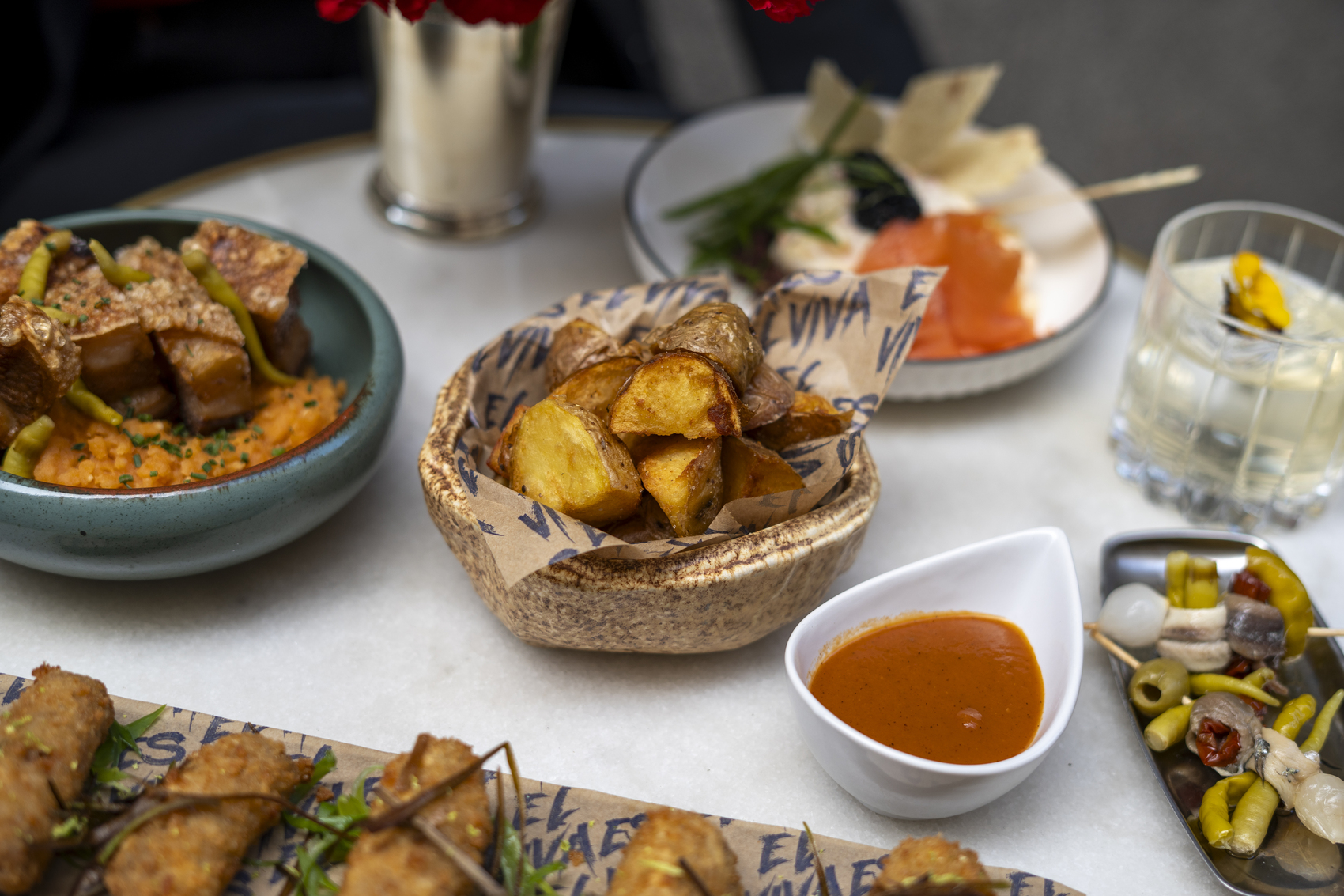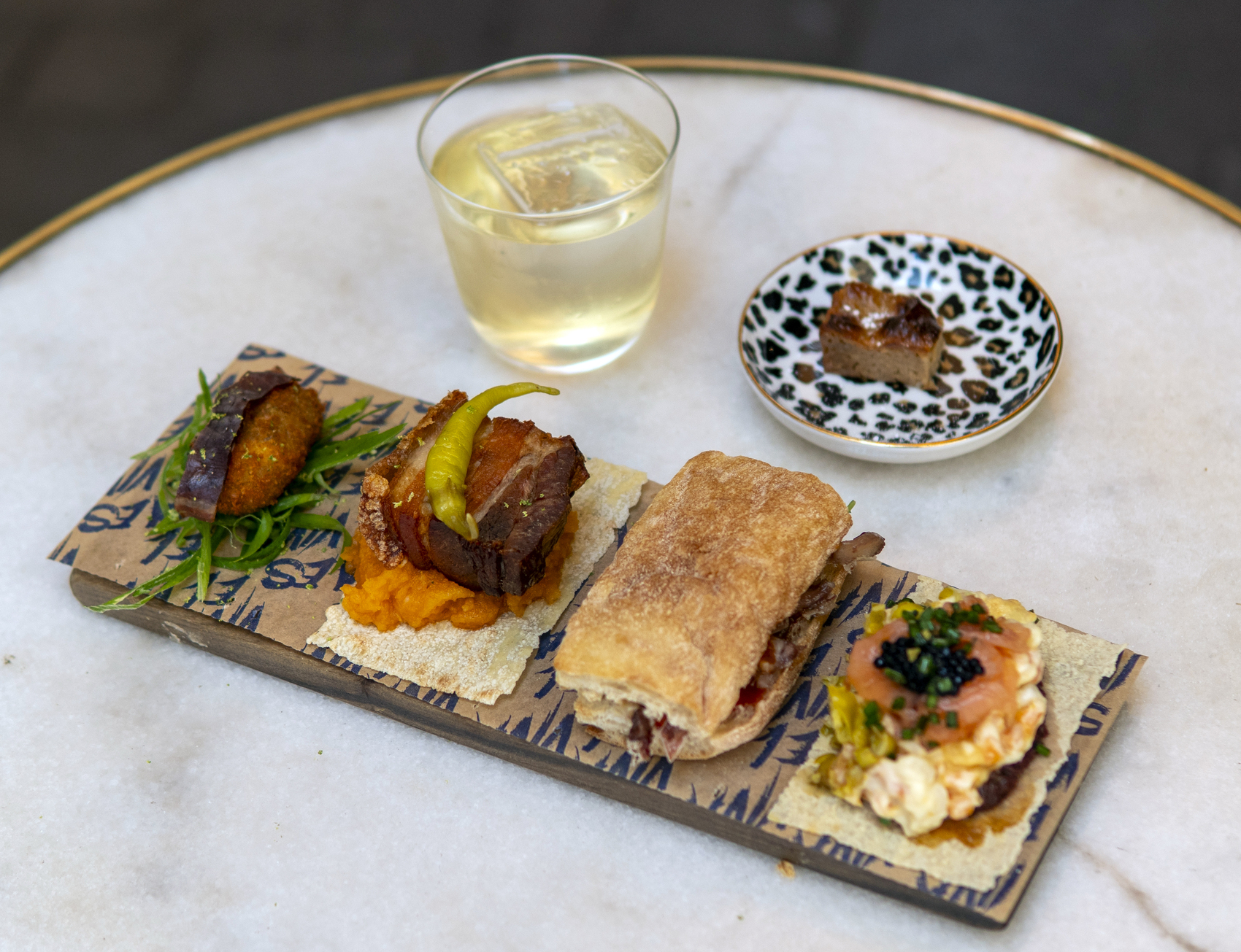 Para acompañar al cóctel, una selección de bocados que reinterpretan el espíritu castizo. Un mini bocata de oreja brava en brioche, croqueta de cocido con todo su compango, torrezno confitado y frito con piparra y ensaladilla rusa con salmón ahumado sobre pan sardo. Un recorrido sensorial por los sabores más reconocibles de Madrid, transformados con técnica y sensibilidad contemporánea.