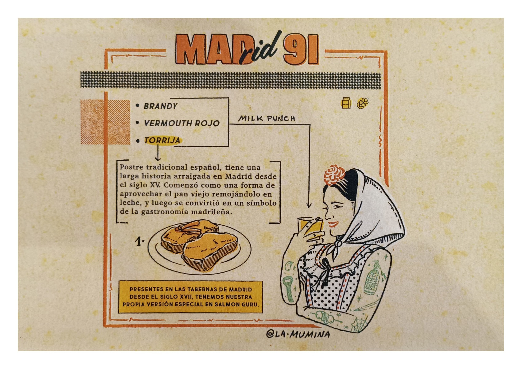 El MADrid-91 es un manifiesto líquido, un cóctel que sabe a Madrid. Inspirado en la torrija madrileña y elaborado mediante la técnica del Milk Punch, que logra una textura sedosa y un sabor sorprendentemente profundo. Combina leche infusionada con especias, miel, pan de leche, brandy de Jerez y vermut rojo. Se sirve con un pequeño plato que homenajea la antigua tradición de “la tapa” y coronado con una mini torrija caramelizada.