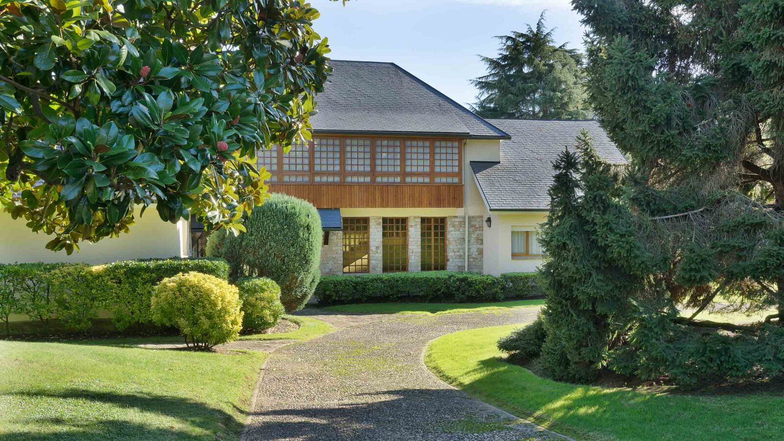 Un elegante camino de canto rodado, dispuesto como adoquín artesanal, conduce desde la entrada principal hasta la casa, invitando a un recorrido que puede hacerse tanto a pie como en coche.