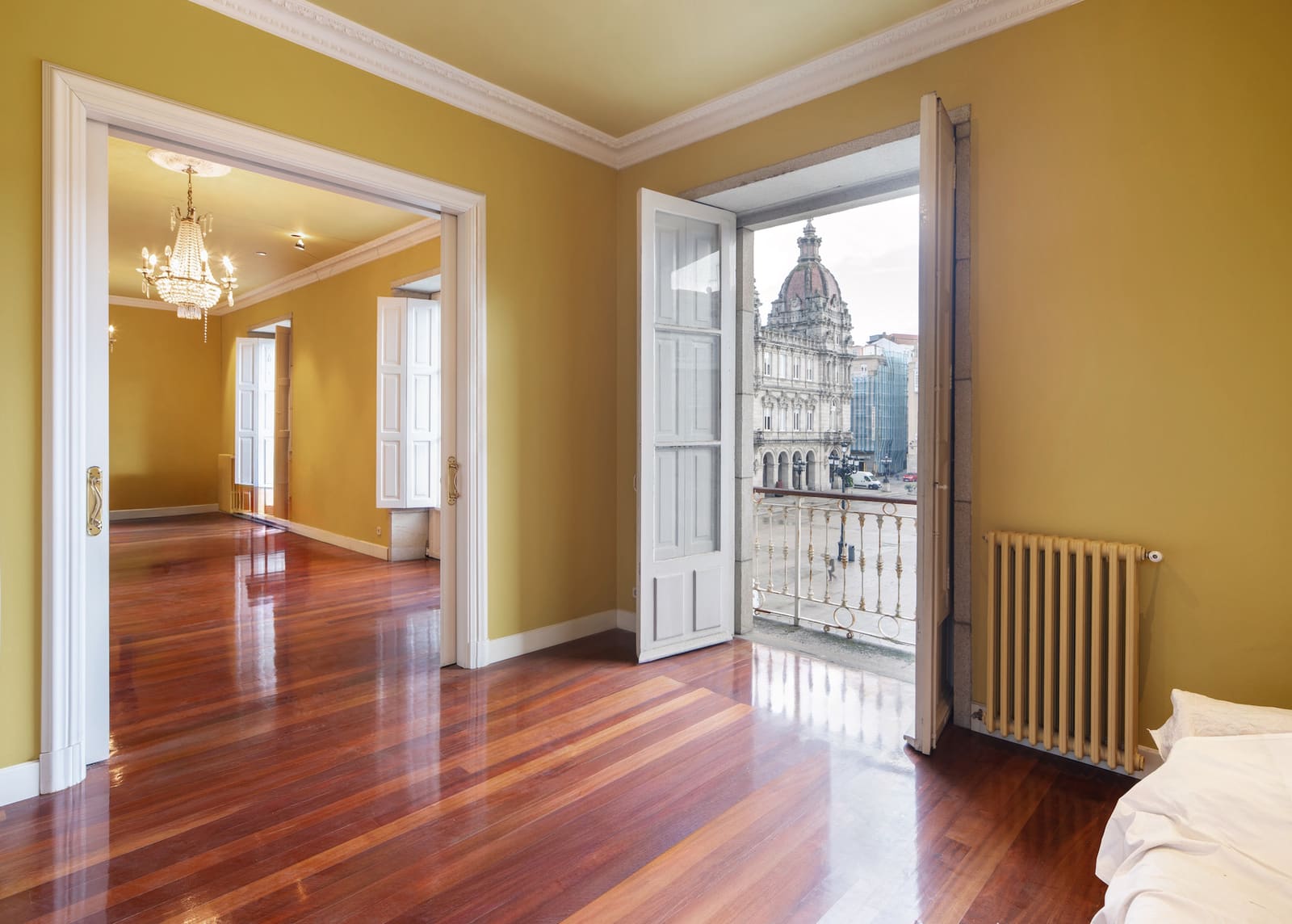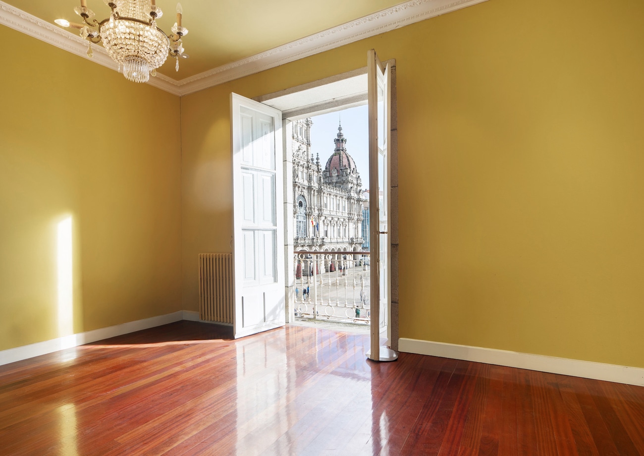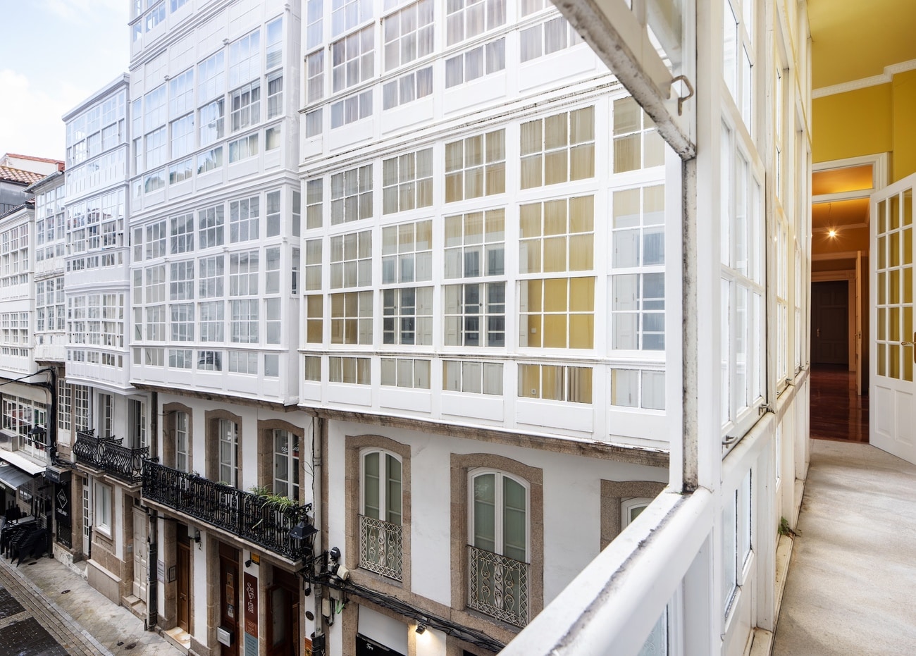 Situada en uno de los enclaves más representativos de la ciudad, la vivienda forma parte de un edificio histórico porticado que conserva elementos característicos de la arquitectura coruñesa de finales del siglo XIX. Balcones, galerías y techos altos construyen una experiencia espacial difícil de reproducir en la vivienda contemporánea, donde la escala, la luz y la relación con la ciudad adquieren un valor diferencial.