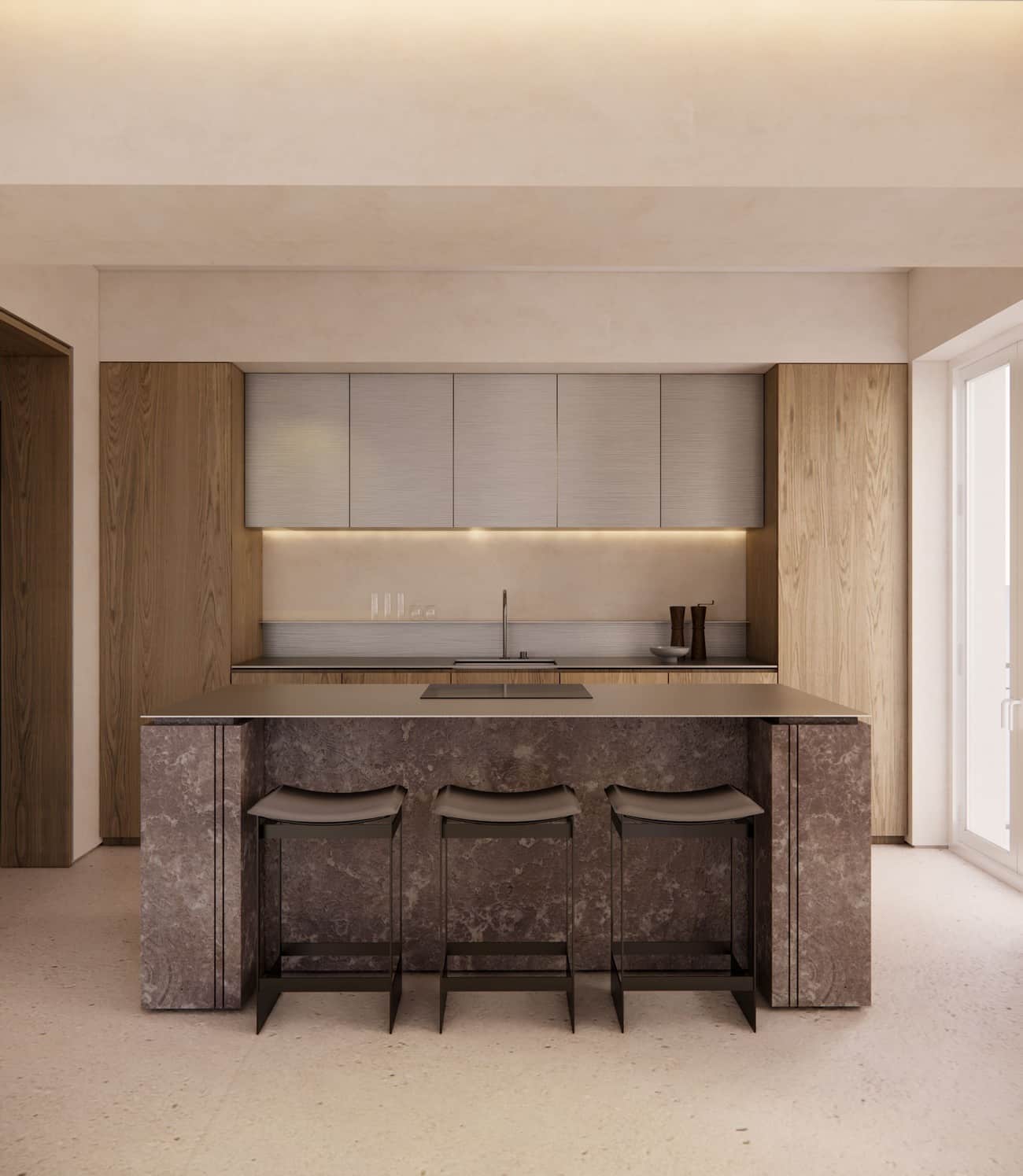La zona social se concibe como un gran ambiente continuo donde cocina, comedor y salón se integran con naturalidad, pensados para una forma de vida contemporánea, cómoda y fluida.