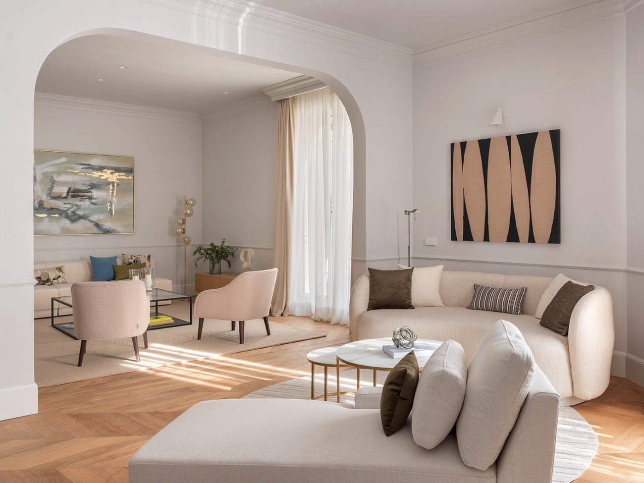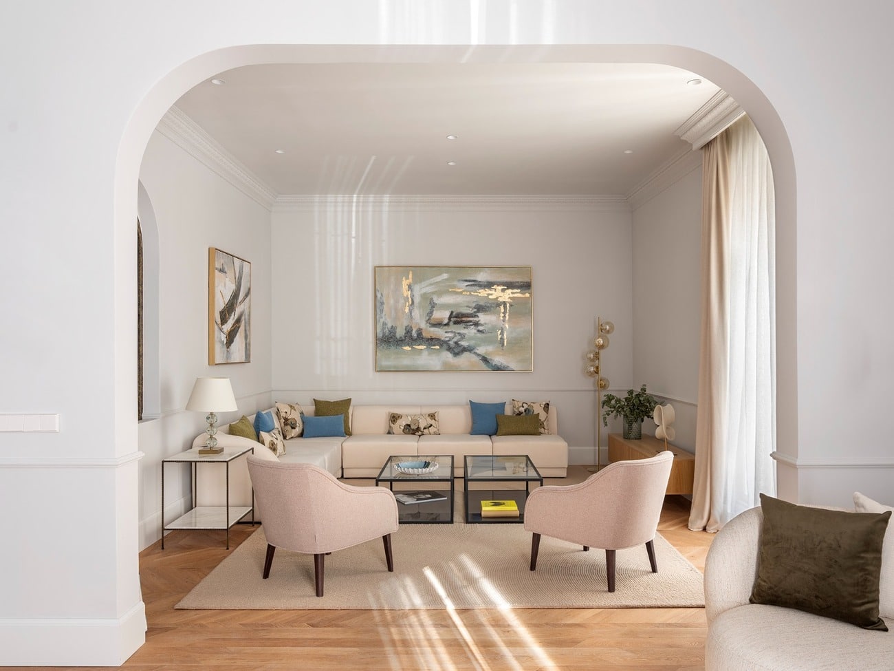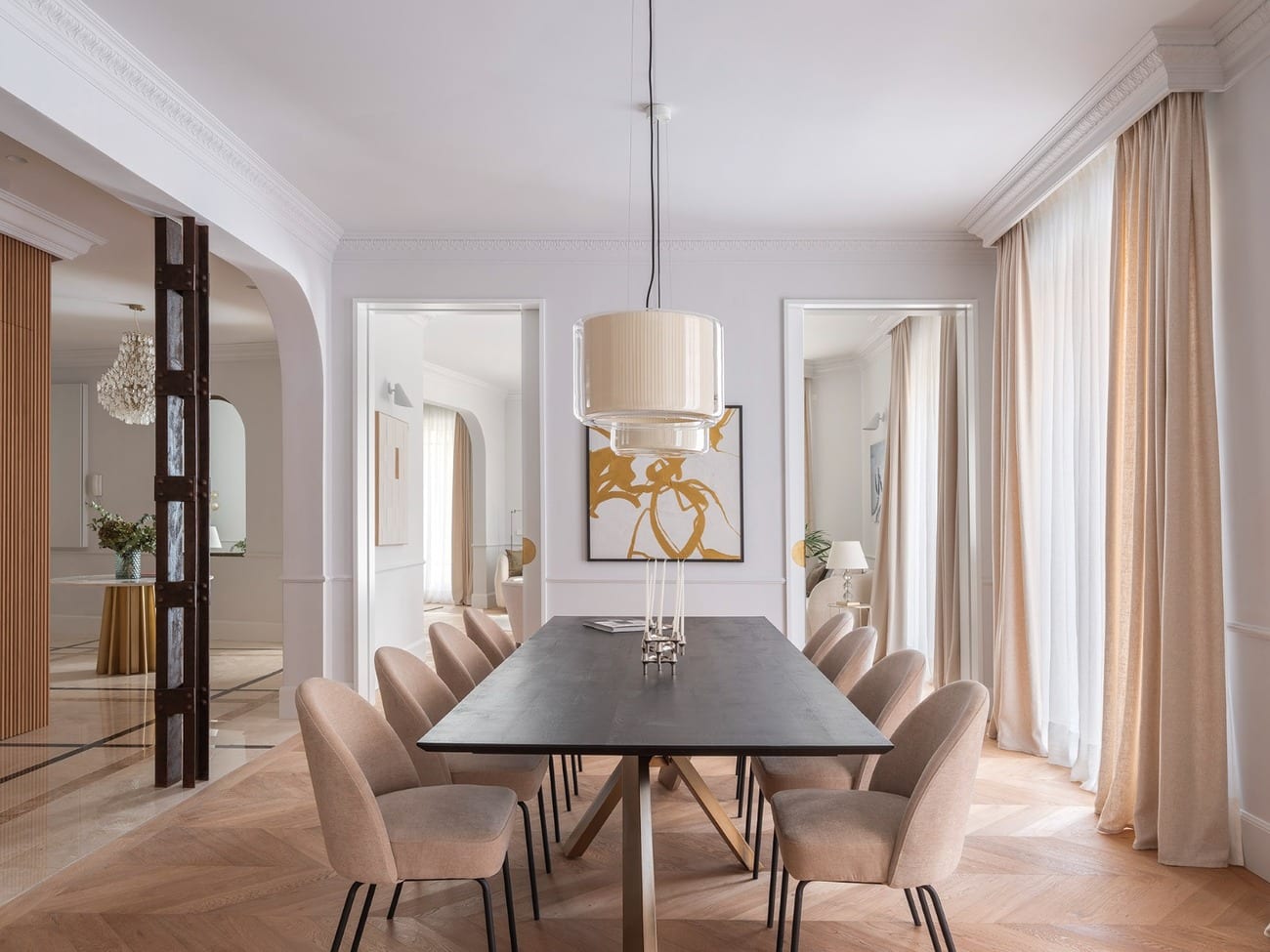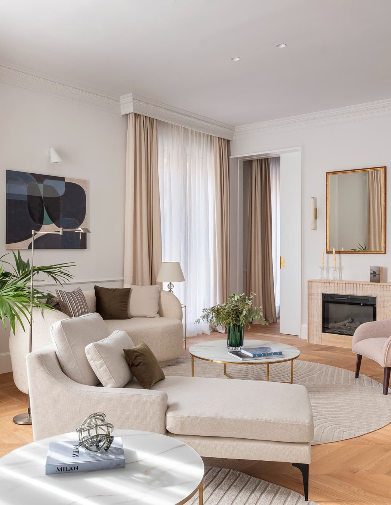 El salón principal, amplio y sereno, se abre a grandes ventanales vestidos creando una atmósfera cálida y envolvente. Las piezas de mobiliario, de diseño contemporáneo y formas orgánicas, conviven en perfecta armonía con la arquitectura clásica, generando un equilibrio refinado entre tradición y modernidad.