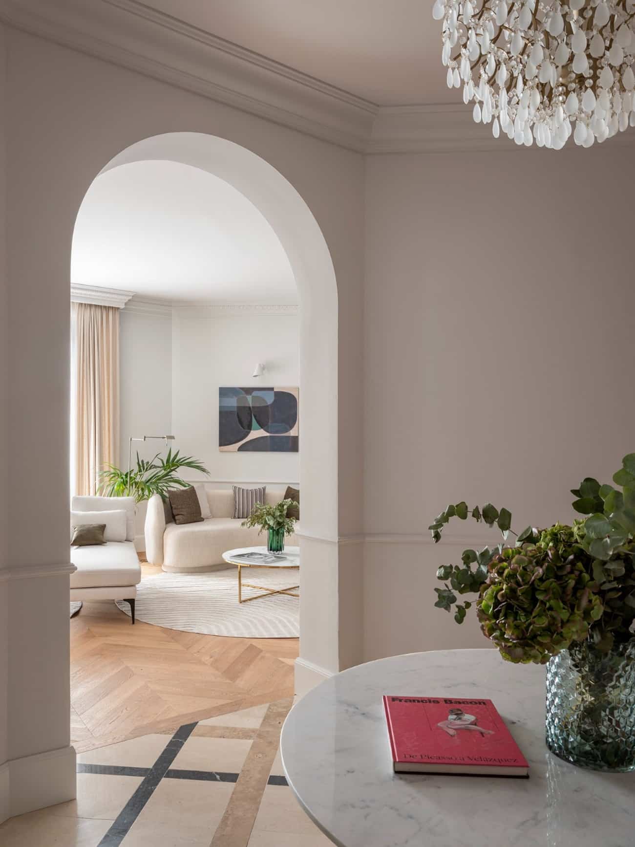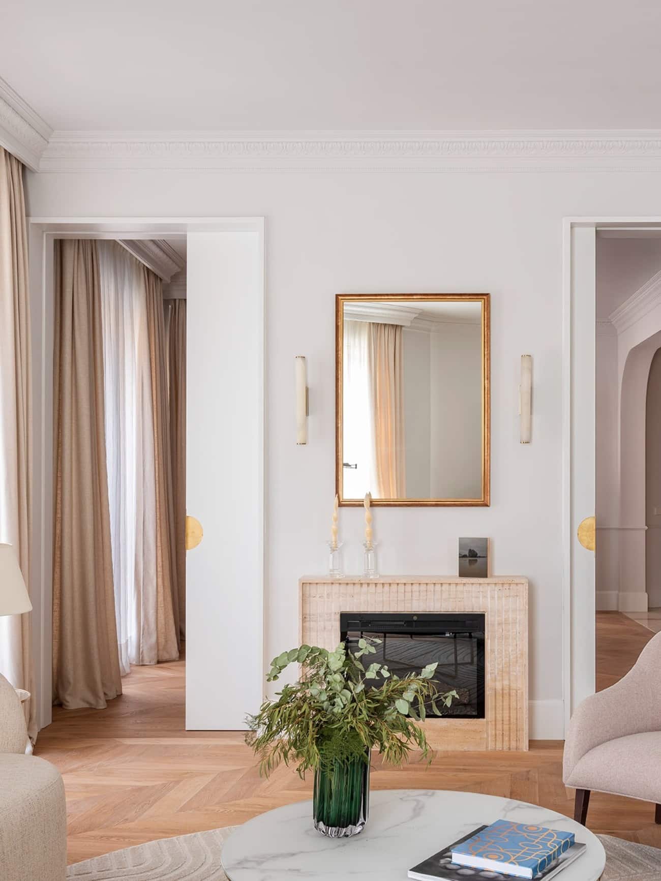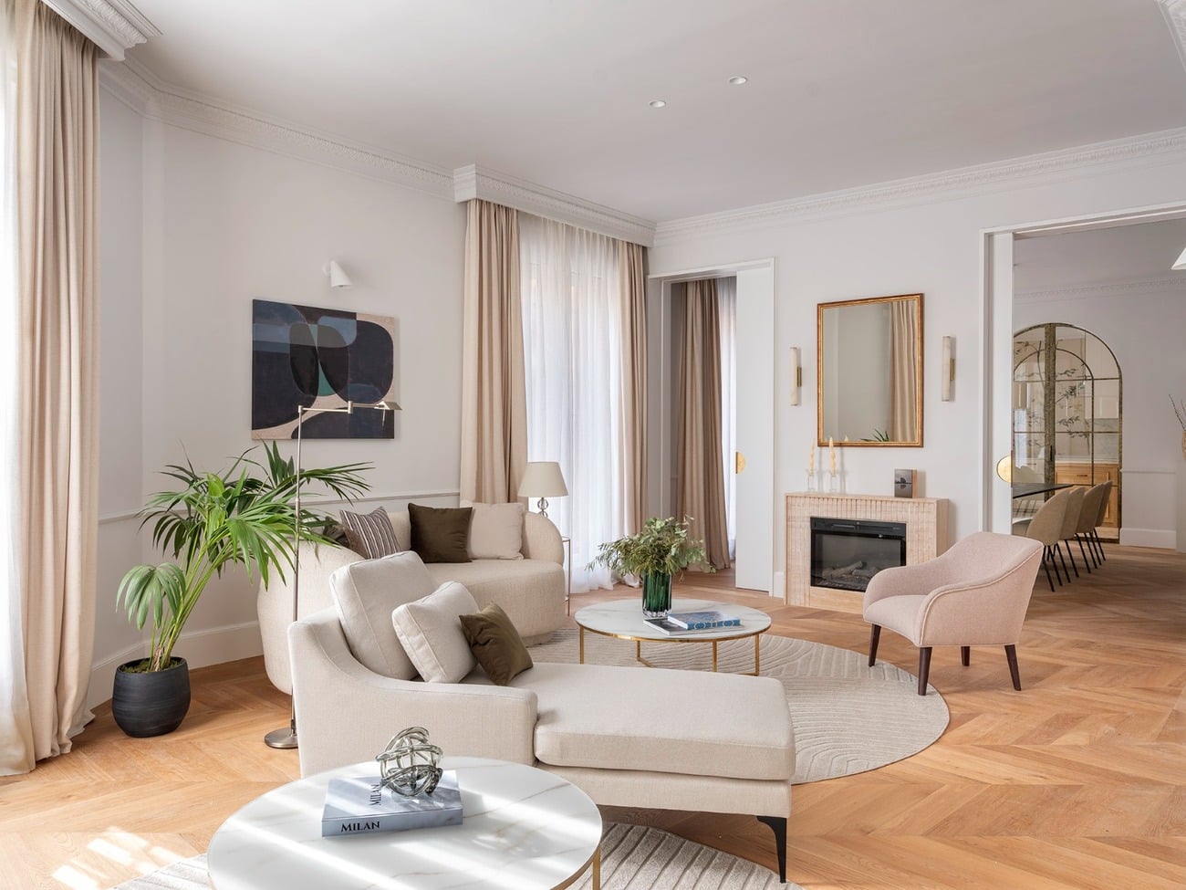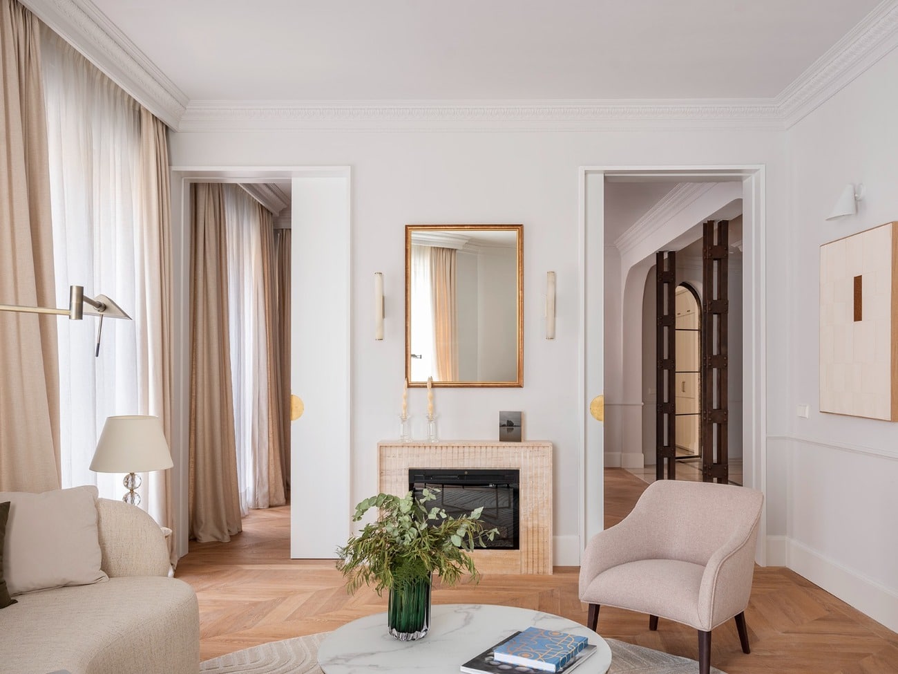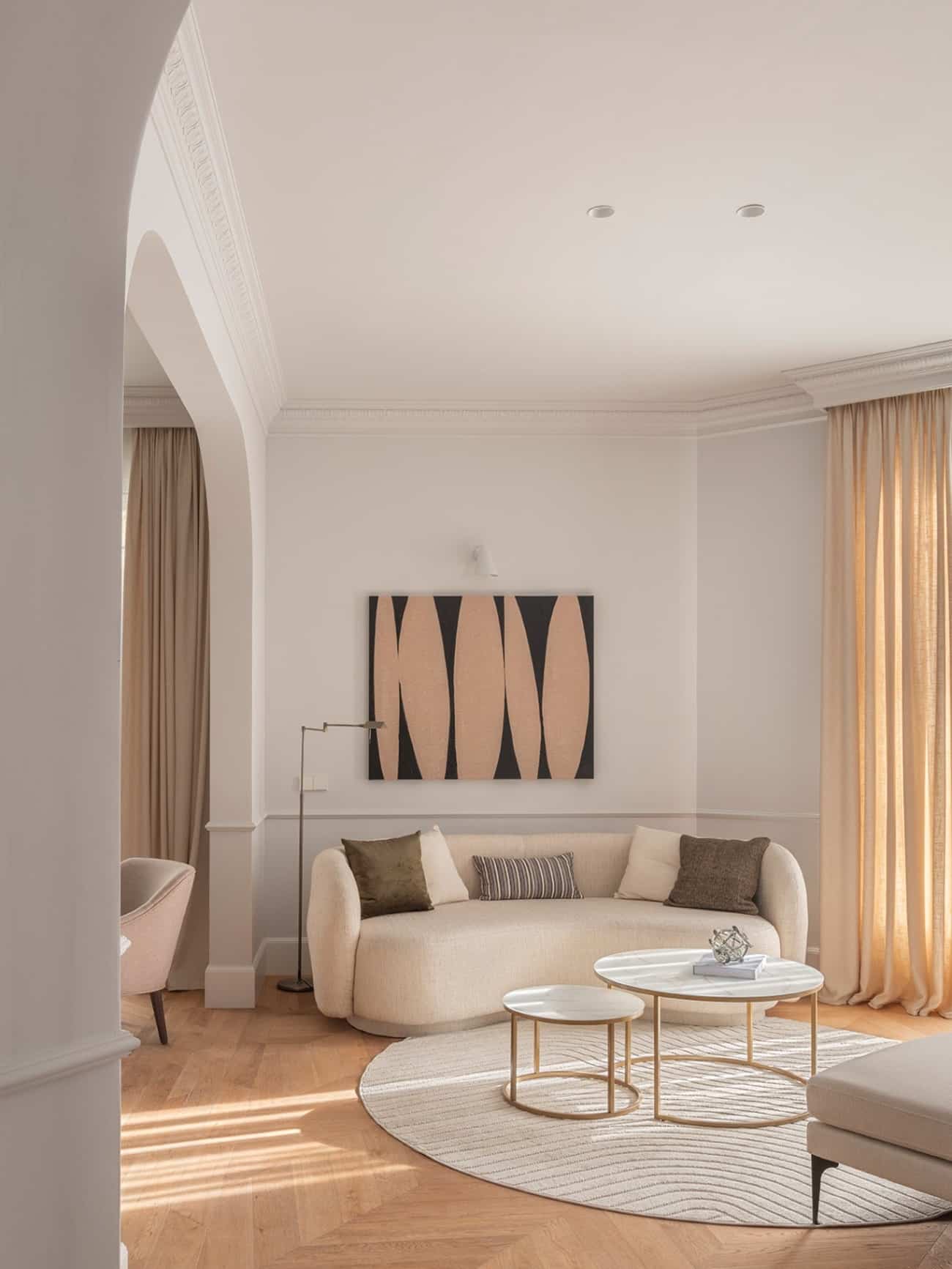 El salón principal, amplio y sereno, se abre a grandes ventanales vestidos creando una atmósfera cálida y envolvente. Las piezas de mobiliario, de diseño contemporáneo y formas orgánicas, conviven en perfecta armonía con la arquitectura clásica, generando un equilibrio refinado entre tradición y modernidad.