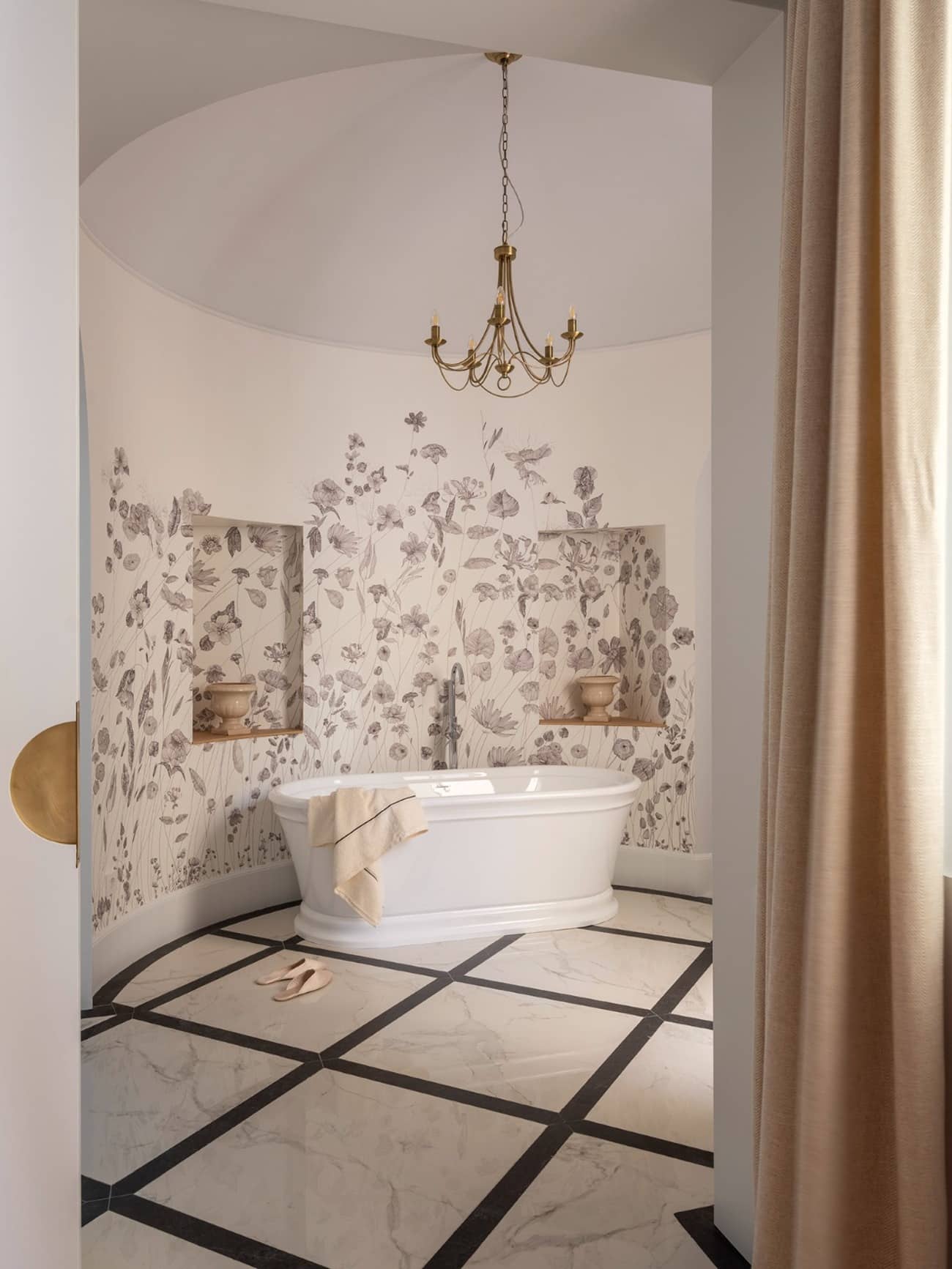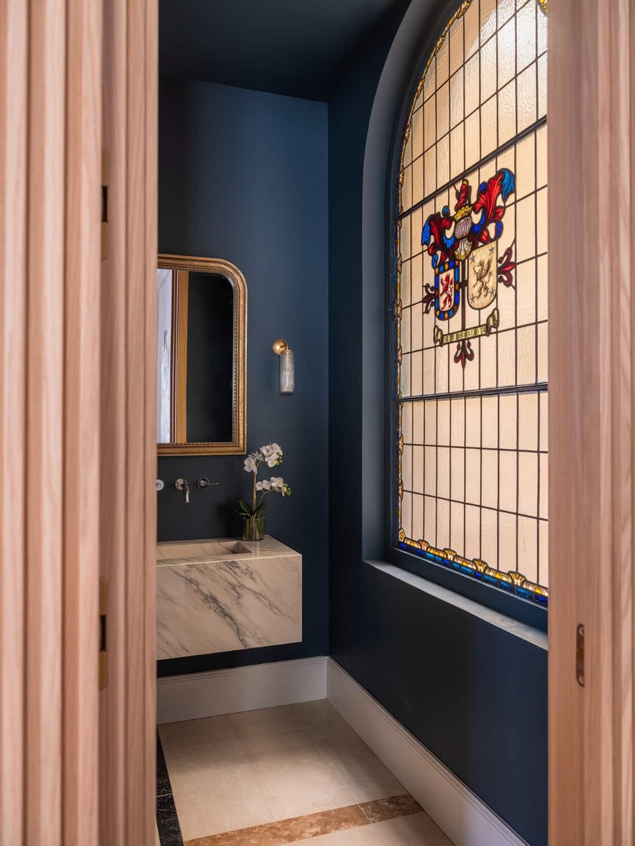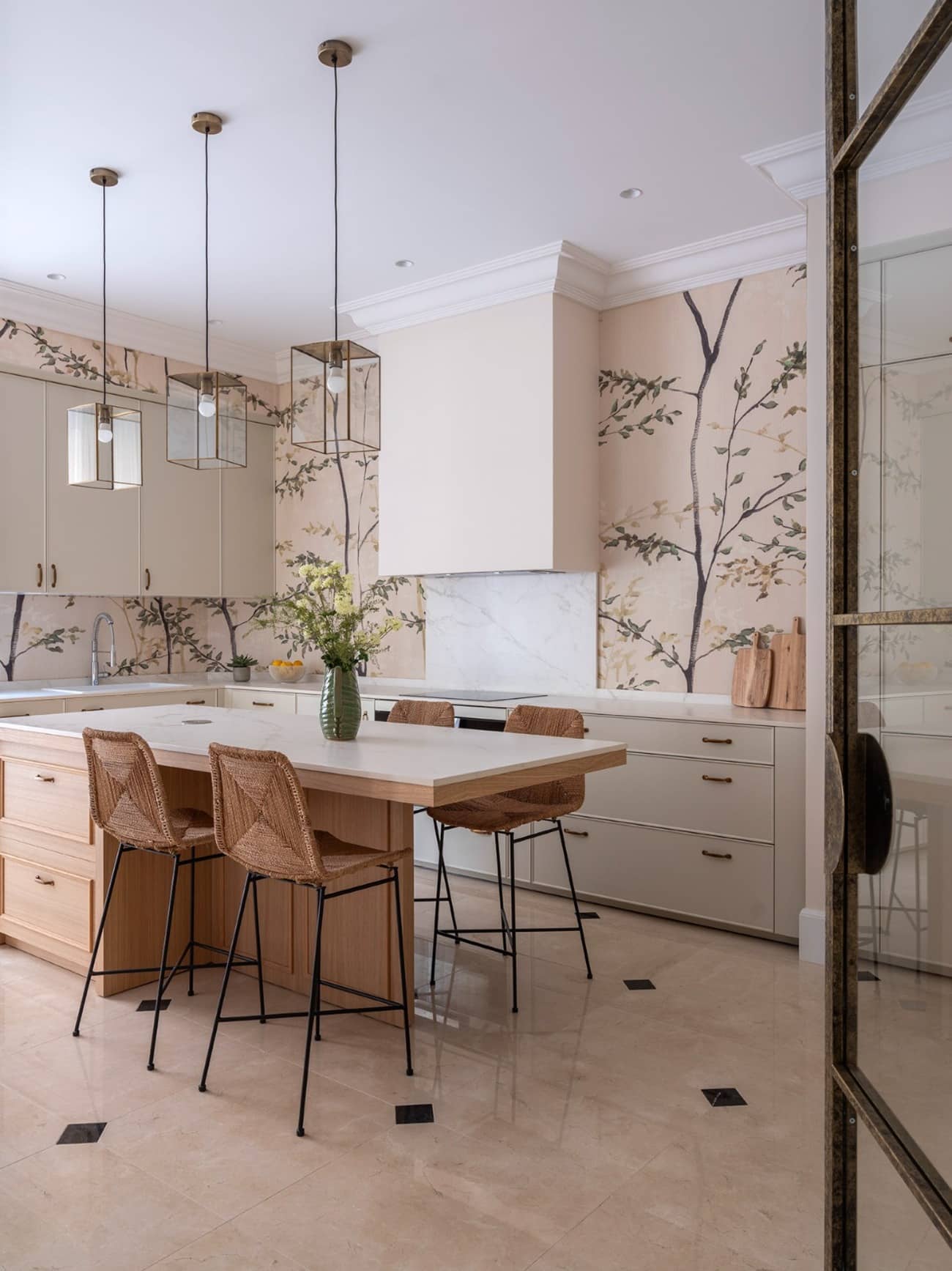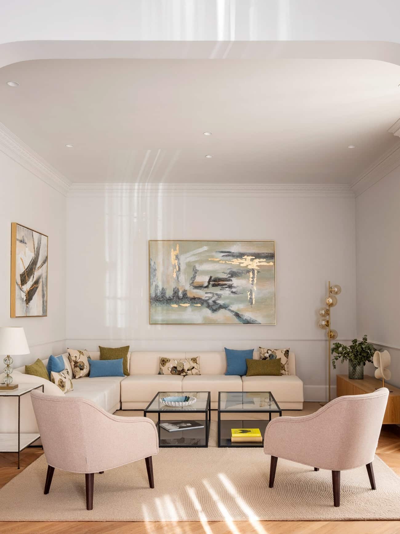 El salón principal, amplio y sereno, se abre a grandes ventanales vestidos creando una atmósfera cálida y envolvente. Las piezas de mobiliario, de diseño contemporáneo y formas orgánicas, conviven en perfecta armonía con la arquitectura clásica, generando un equilibrio refinado entre tradición y modernidad.