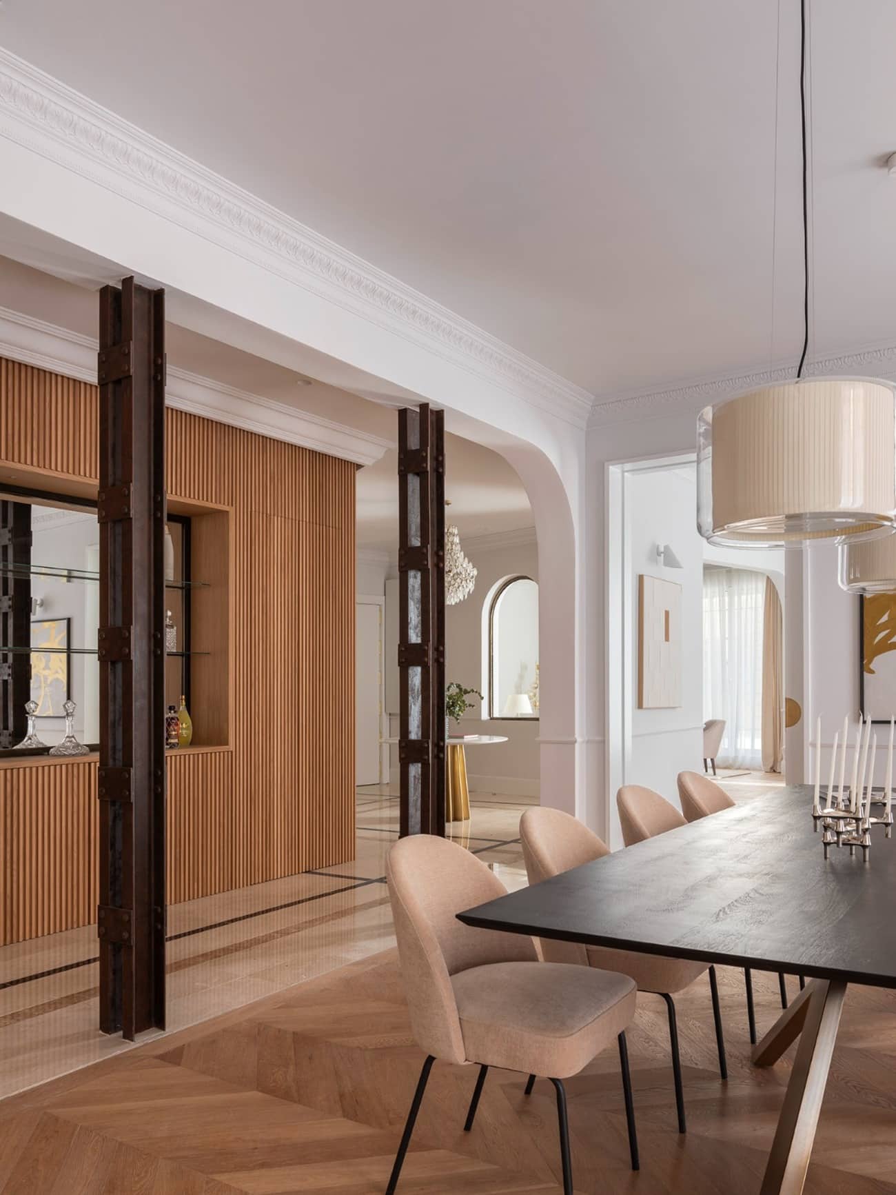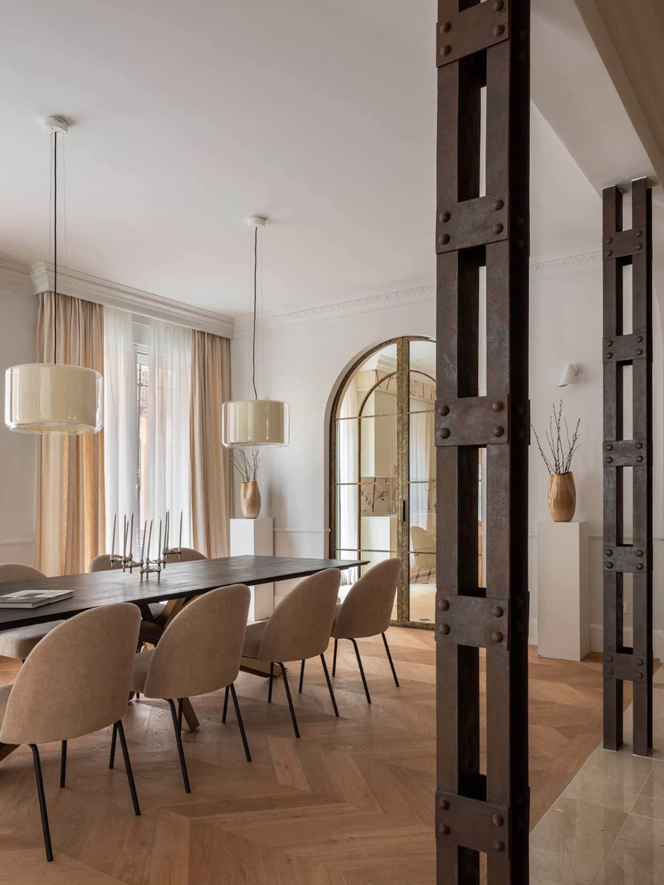 El comedor dialoga con elementos estructurales originales y panelados de madera que añaden textura y sofisticación al conjunto.