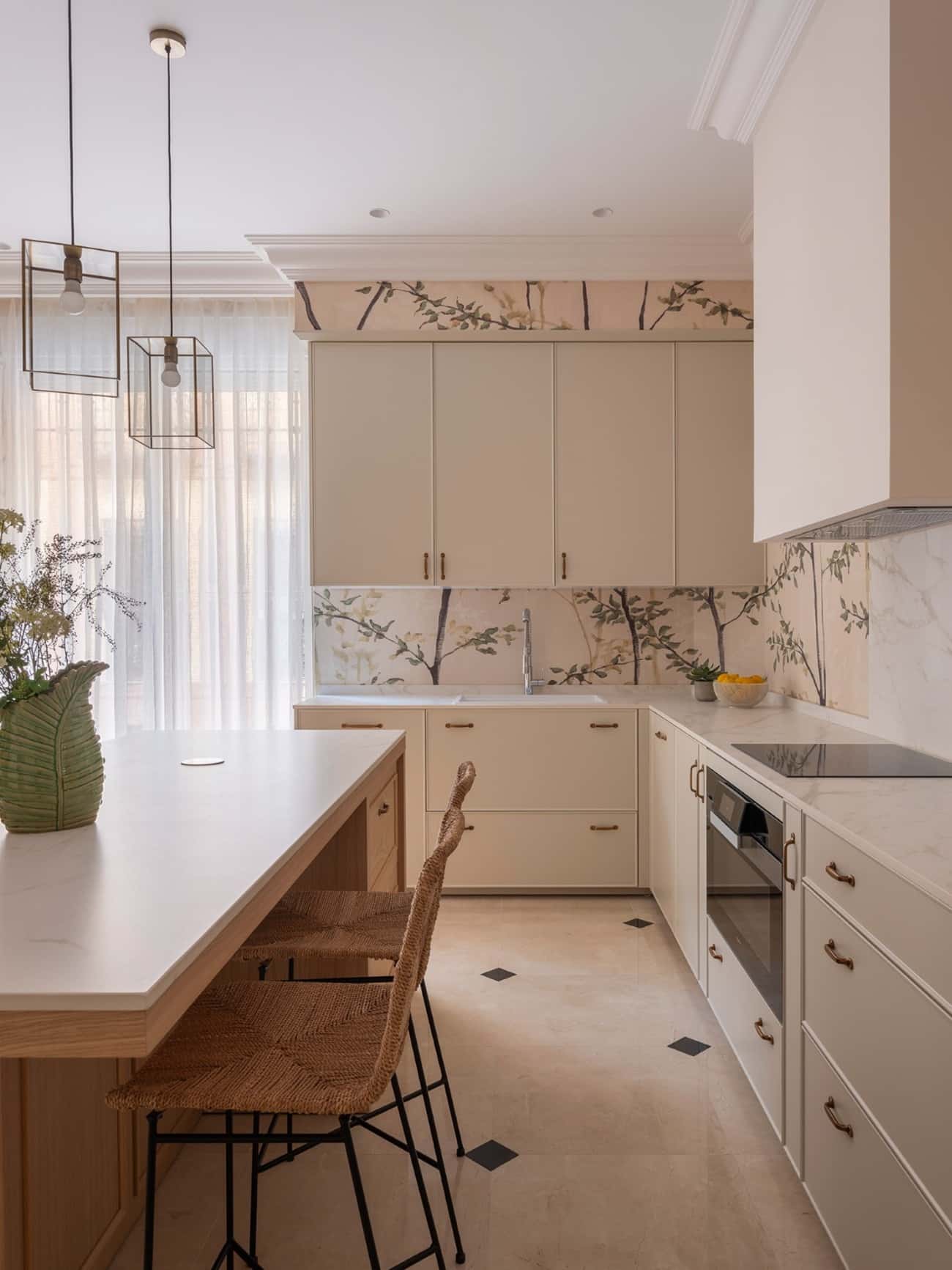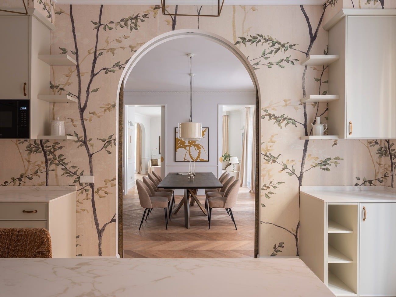 La zona social se articula en diferentes ambientes conectados entre sí a través de elegantes arcos arquitectónicos que aportan carácter y profundidad visual. La cocina, equipada con electrodomésticos de alta gama, se integra con elegancia en la vivienda ofreciendo confort y estilo.