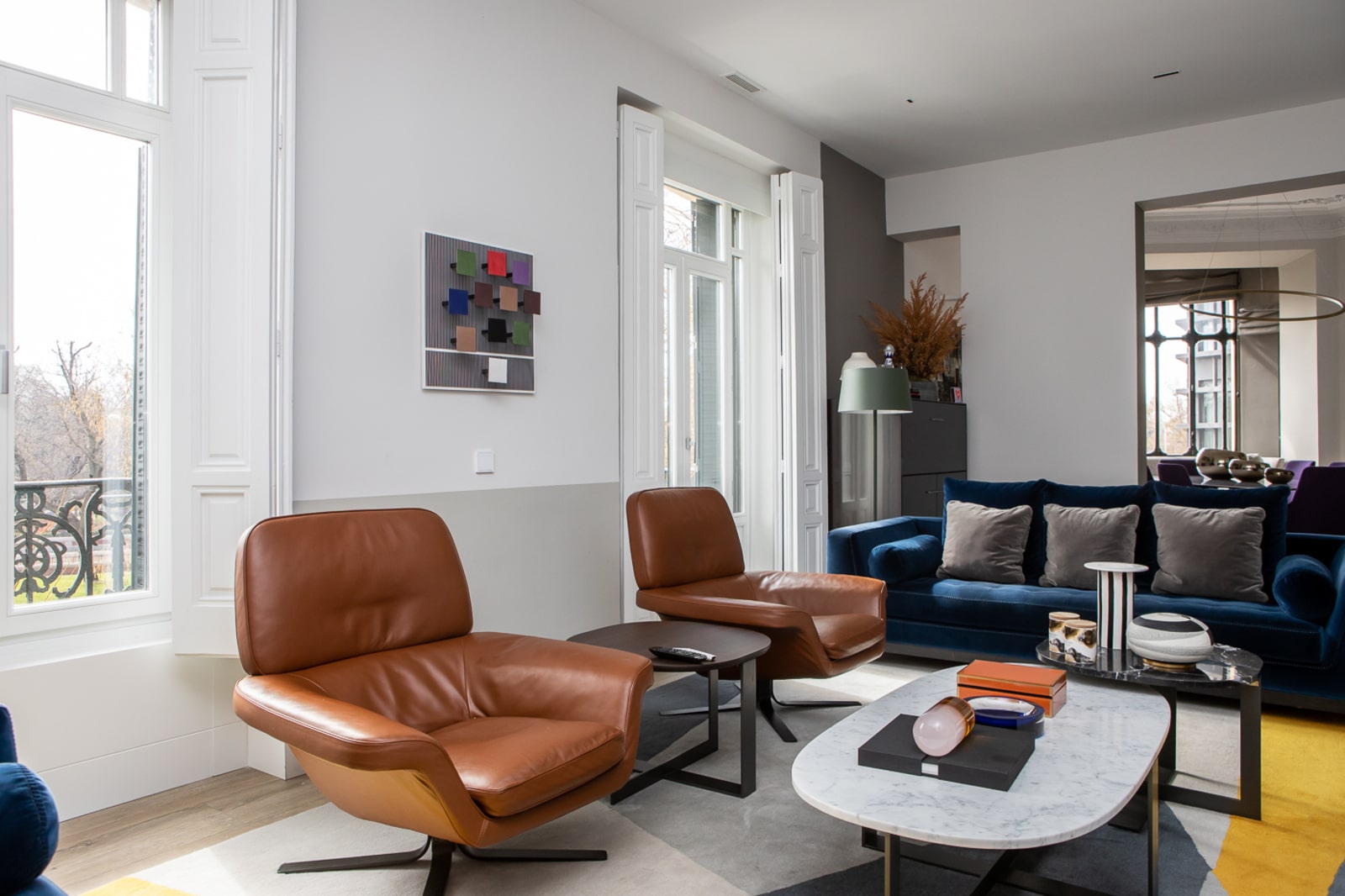 Accedemos a la propiedad, a través de un soberbio hall, que se abre al gran salón, y al comedor, en espacios comunicados independientes, con vistas frontales al Parque de El Retiro.