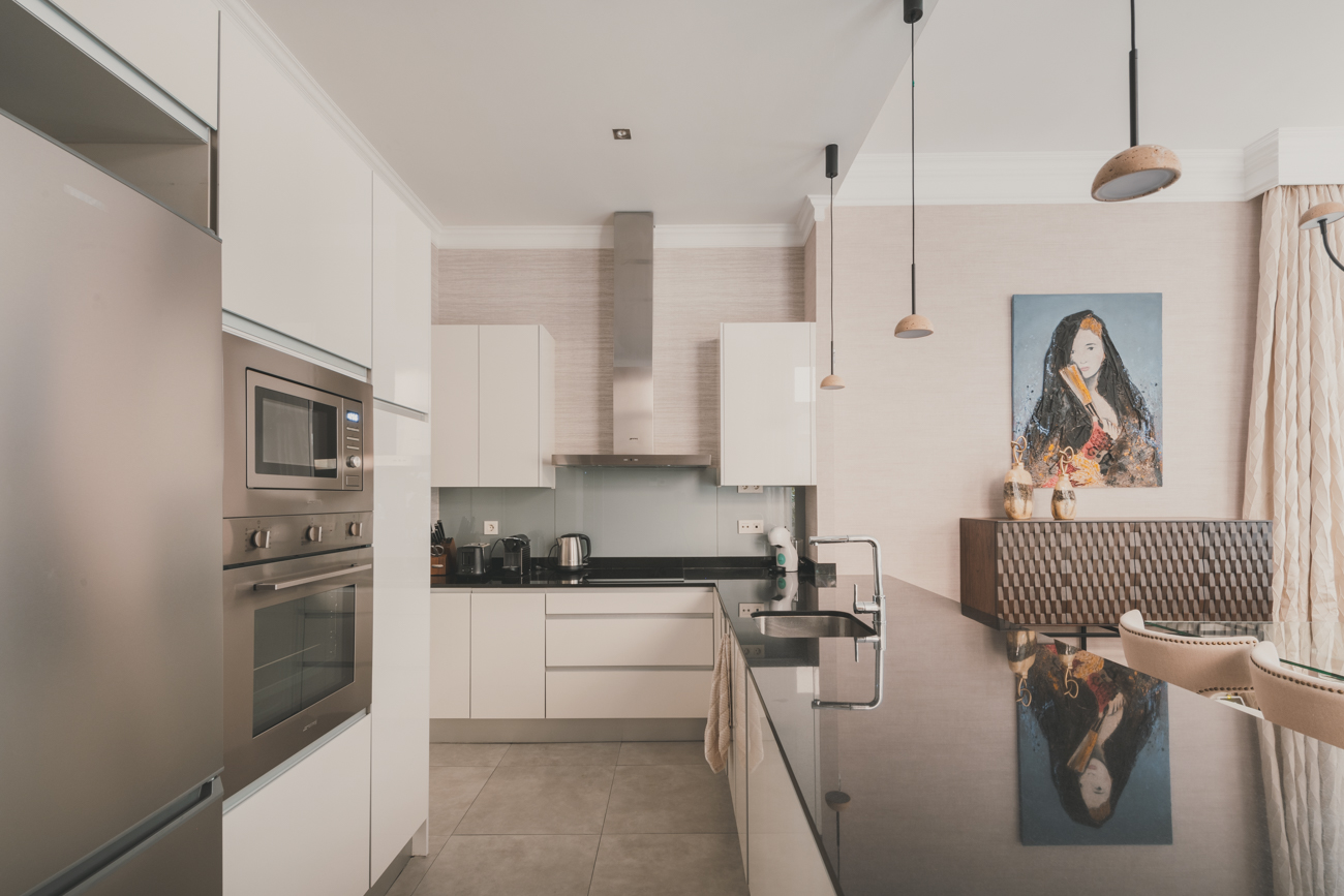 La cocina, abierta al salón, combina diseño y funcionalidad y está equipada con electrodomésticos de alta gama e incorpora una práctica zona de lavandería y almacenaje, integrándose con naturalidad en el conjunto.