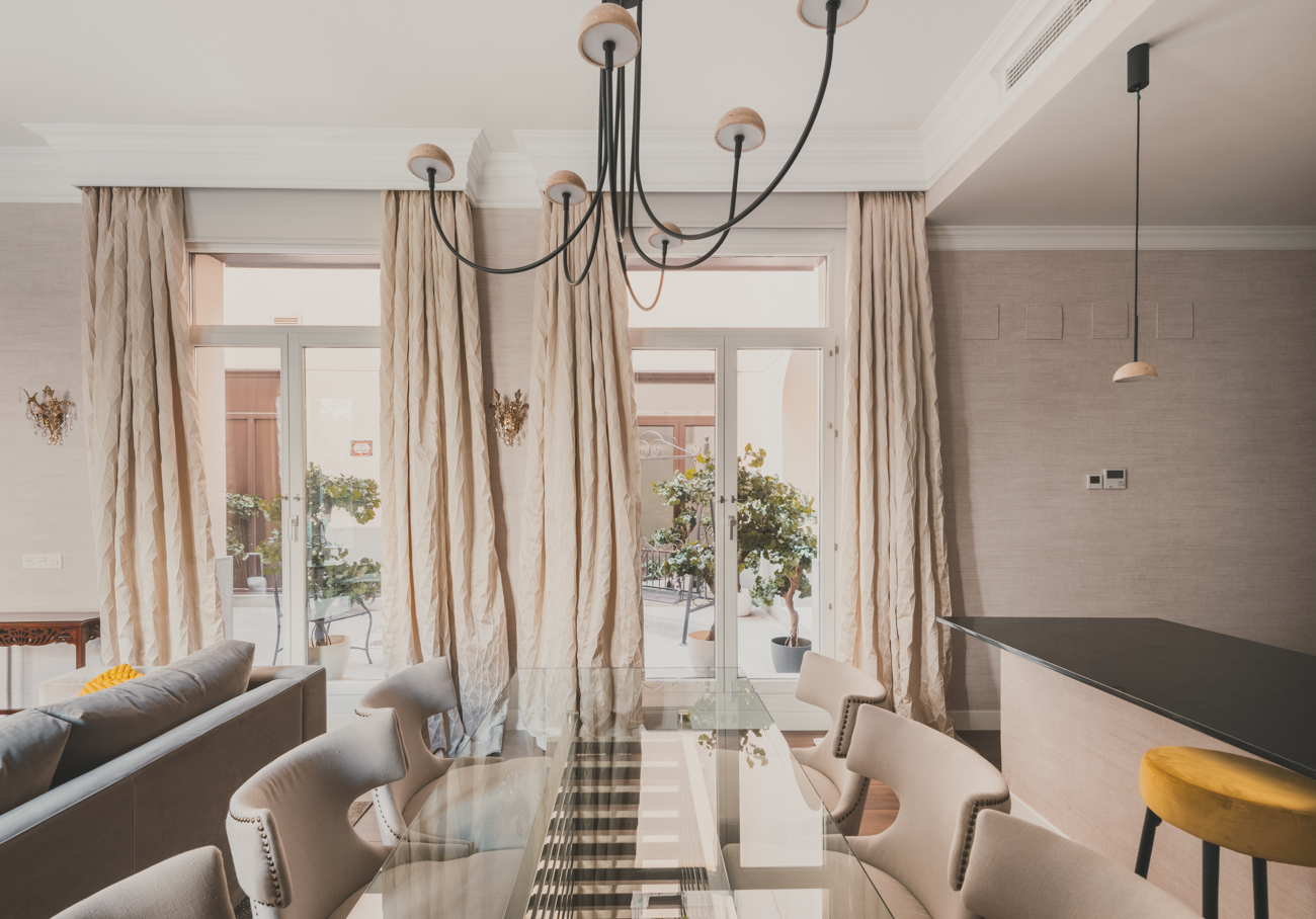 Desde él se accede al amplio salón-comedor de planta rectangular, bañado por la luz que entra a través de sus cuatro ventanales: dos orientados al jardín y dos al patio.