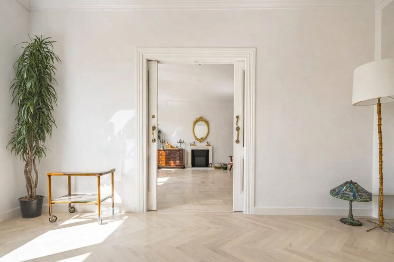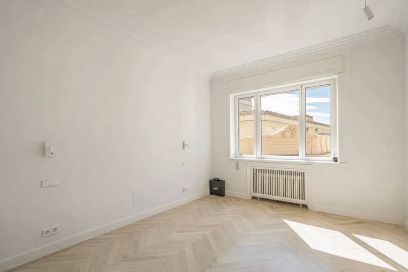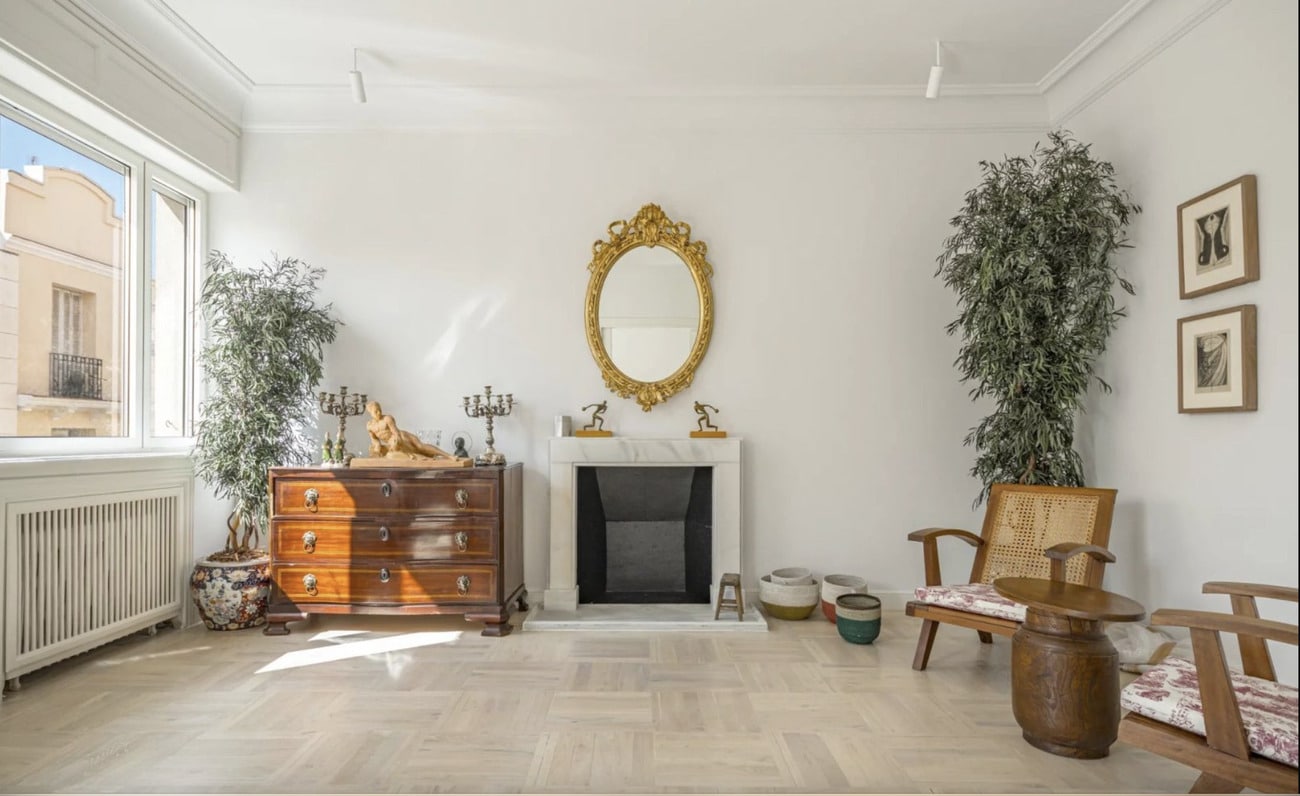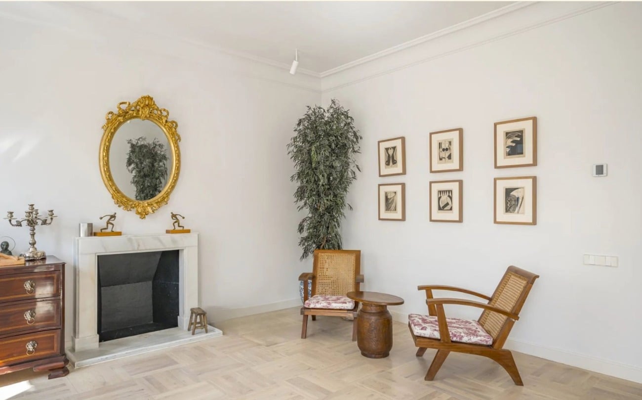 Situado en una tranquila calle donde confluyen los barrios de Trafalgar, Justicia y Almagro, este elegante piso se encuentra en un edificio señorial de 1949 que conserva intacto el carácter de la arquitectura clásica madrileña.