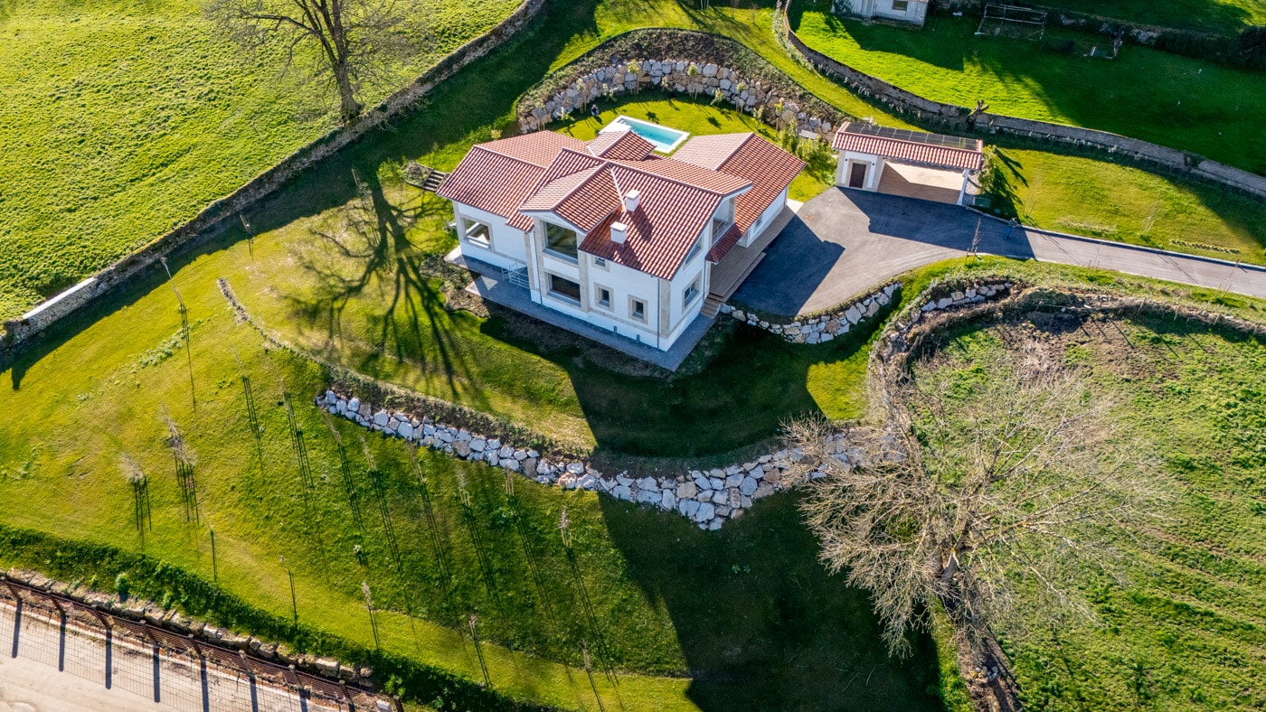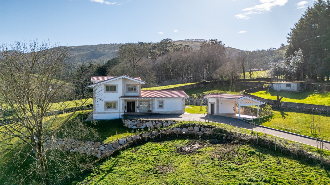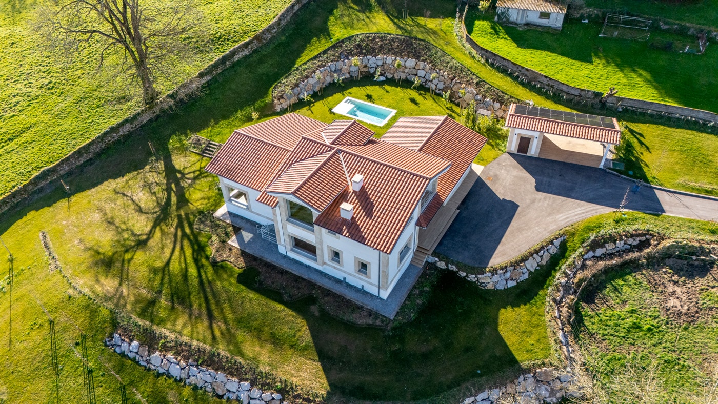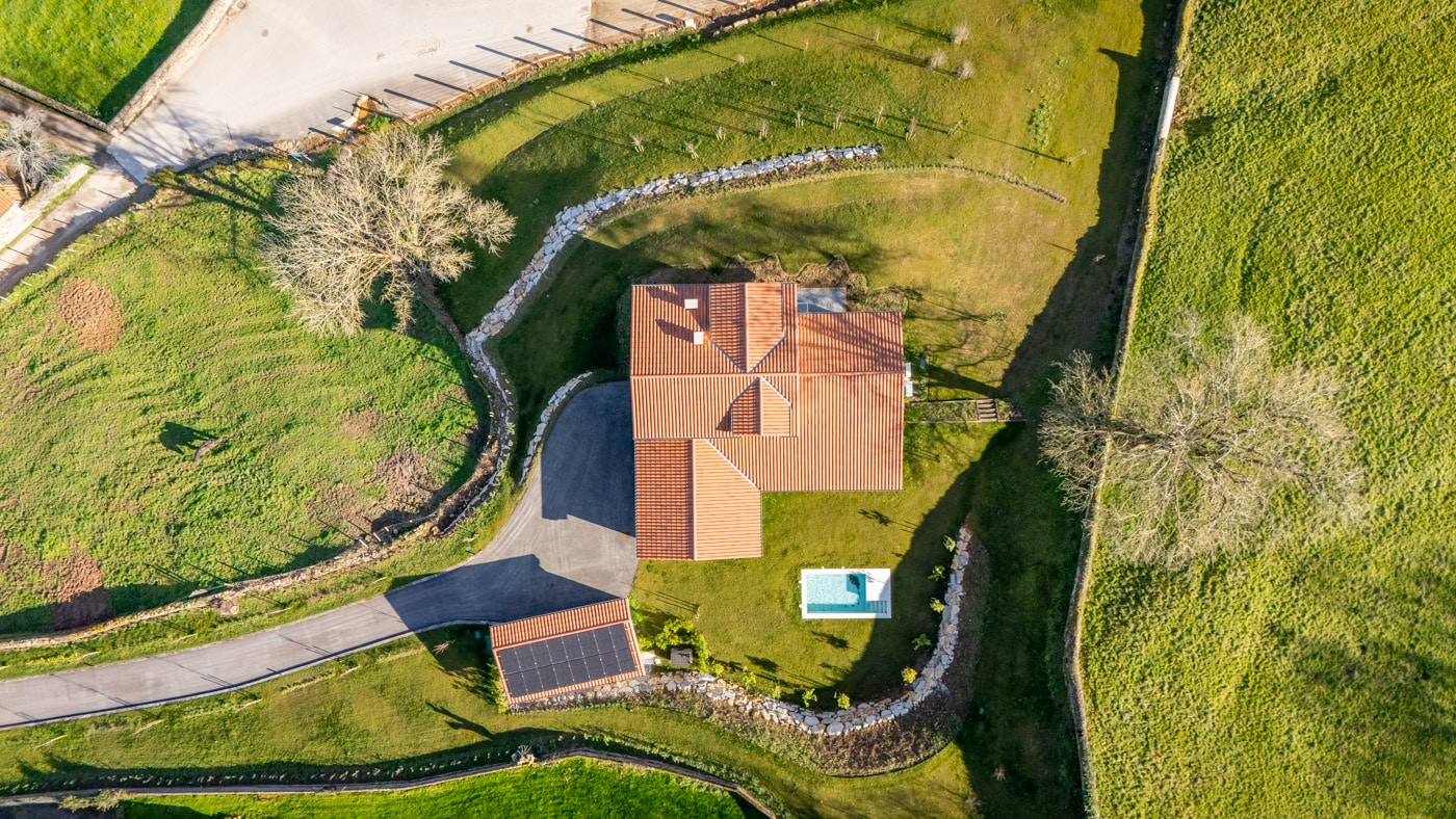 La casa se levanta sobre una parcela de 4.327 m², dominando el valle desde una posición elevada que invita a contemplar el entorno.