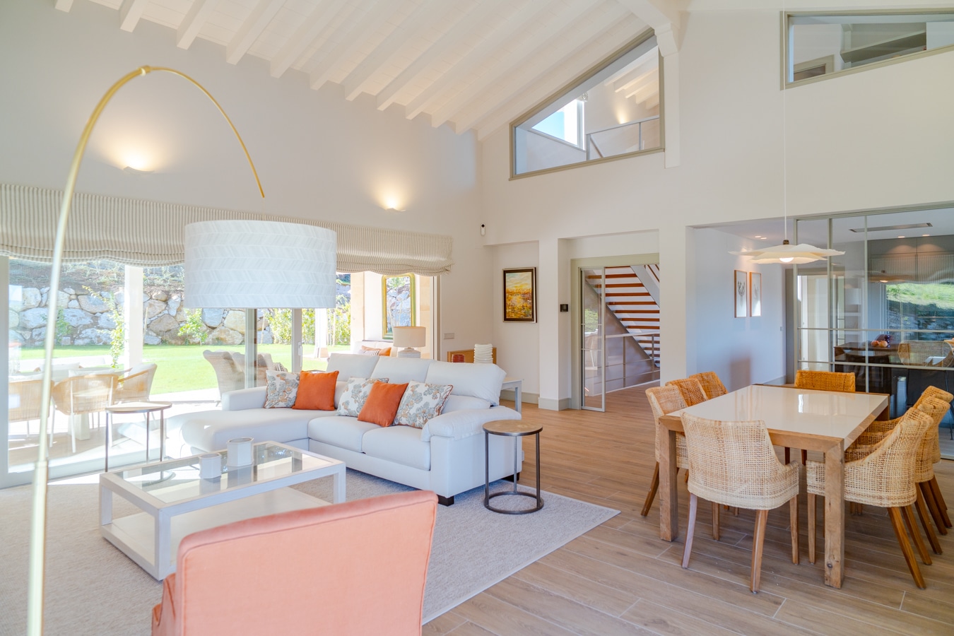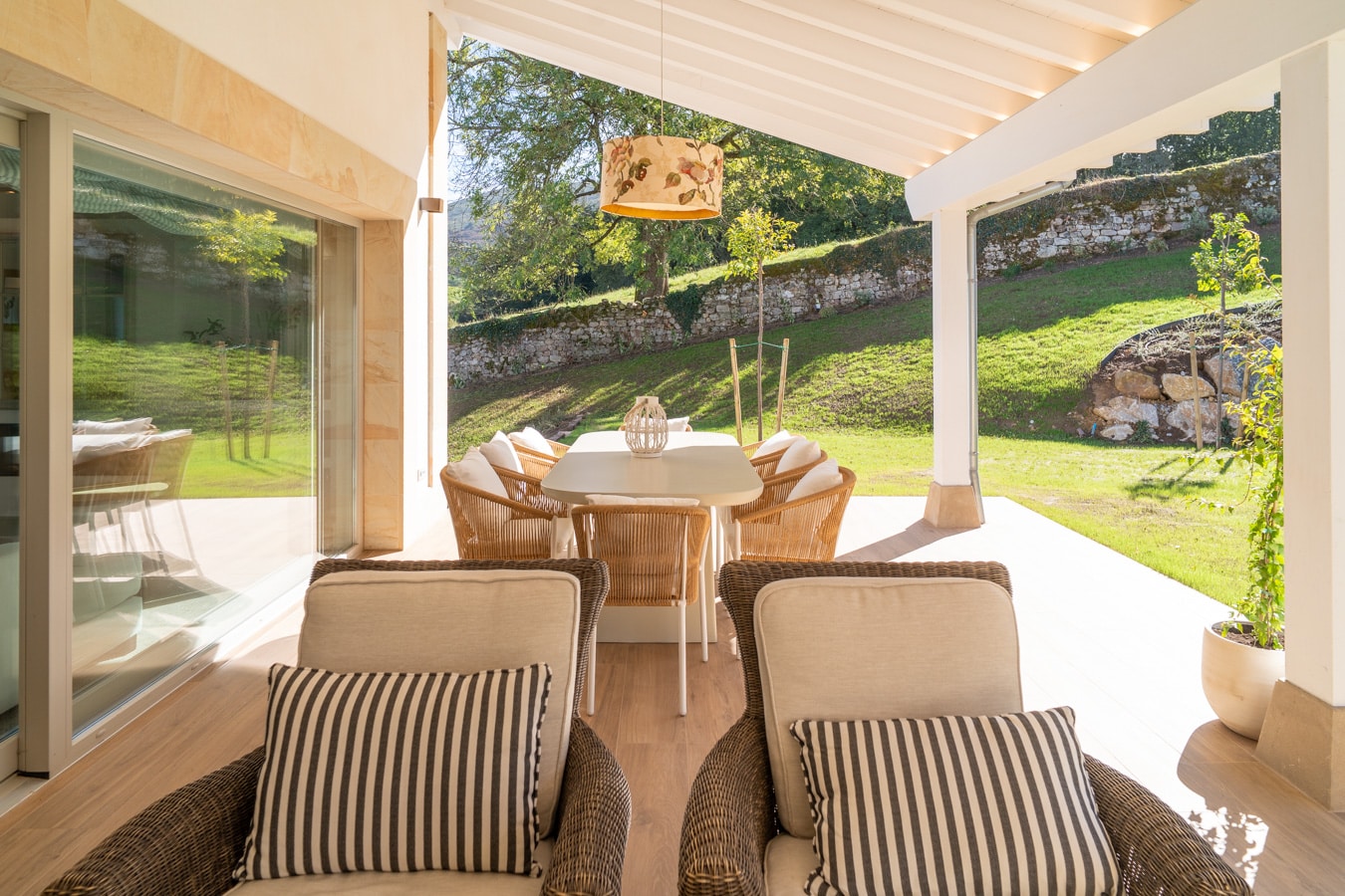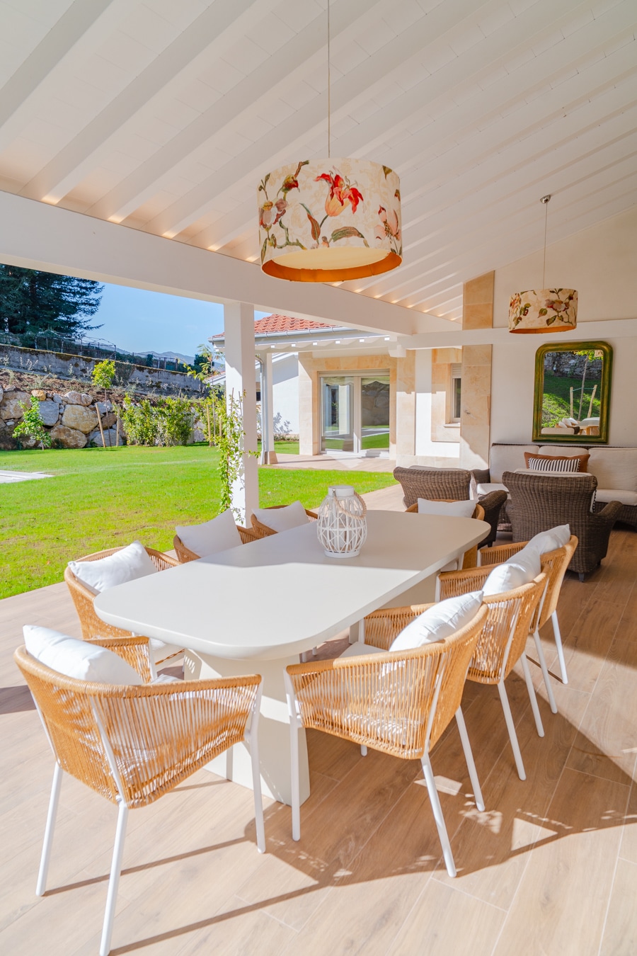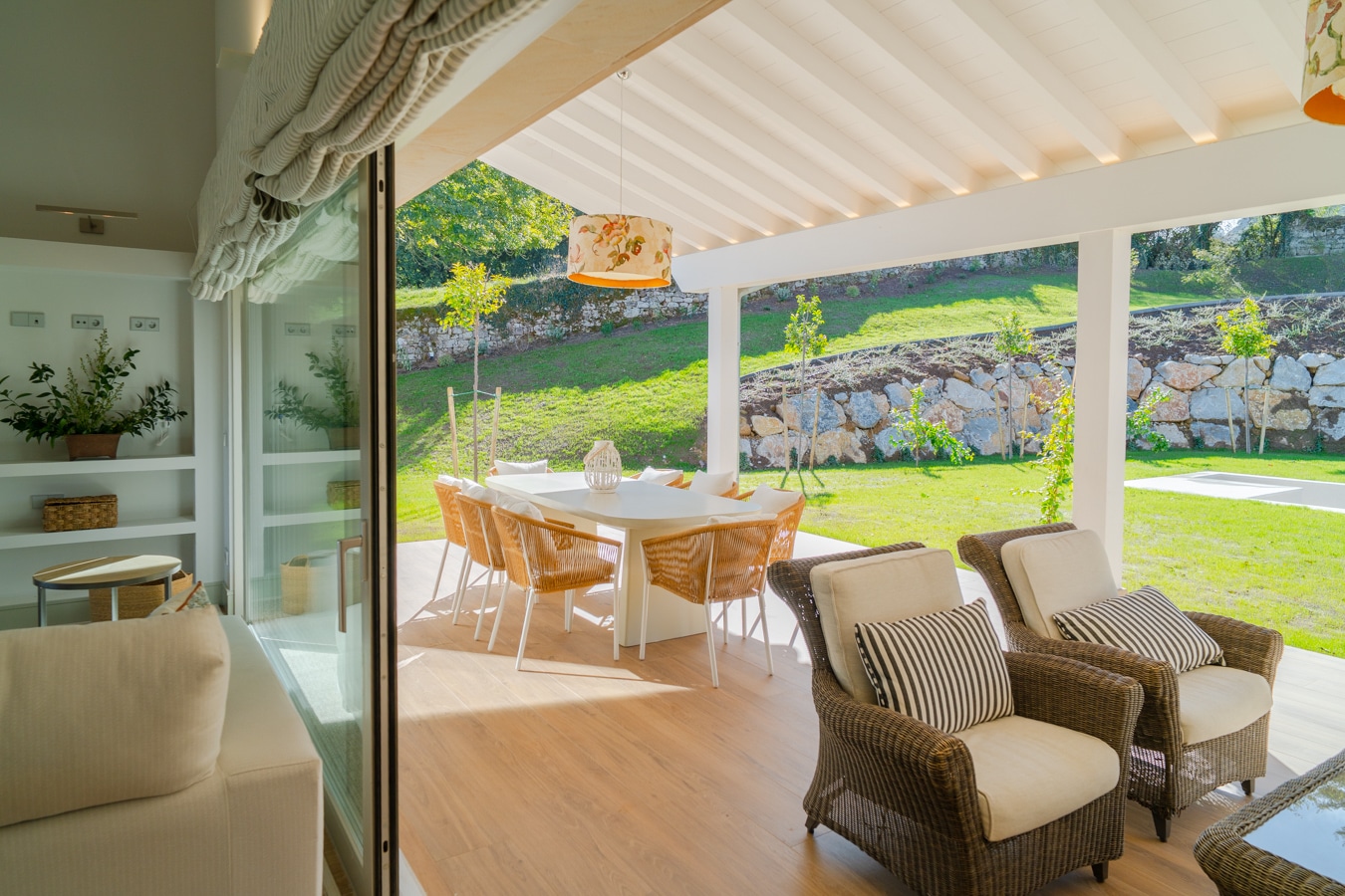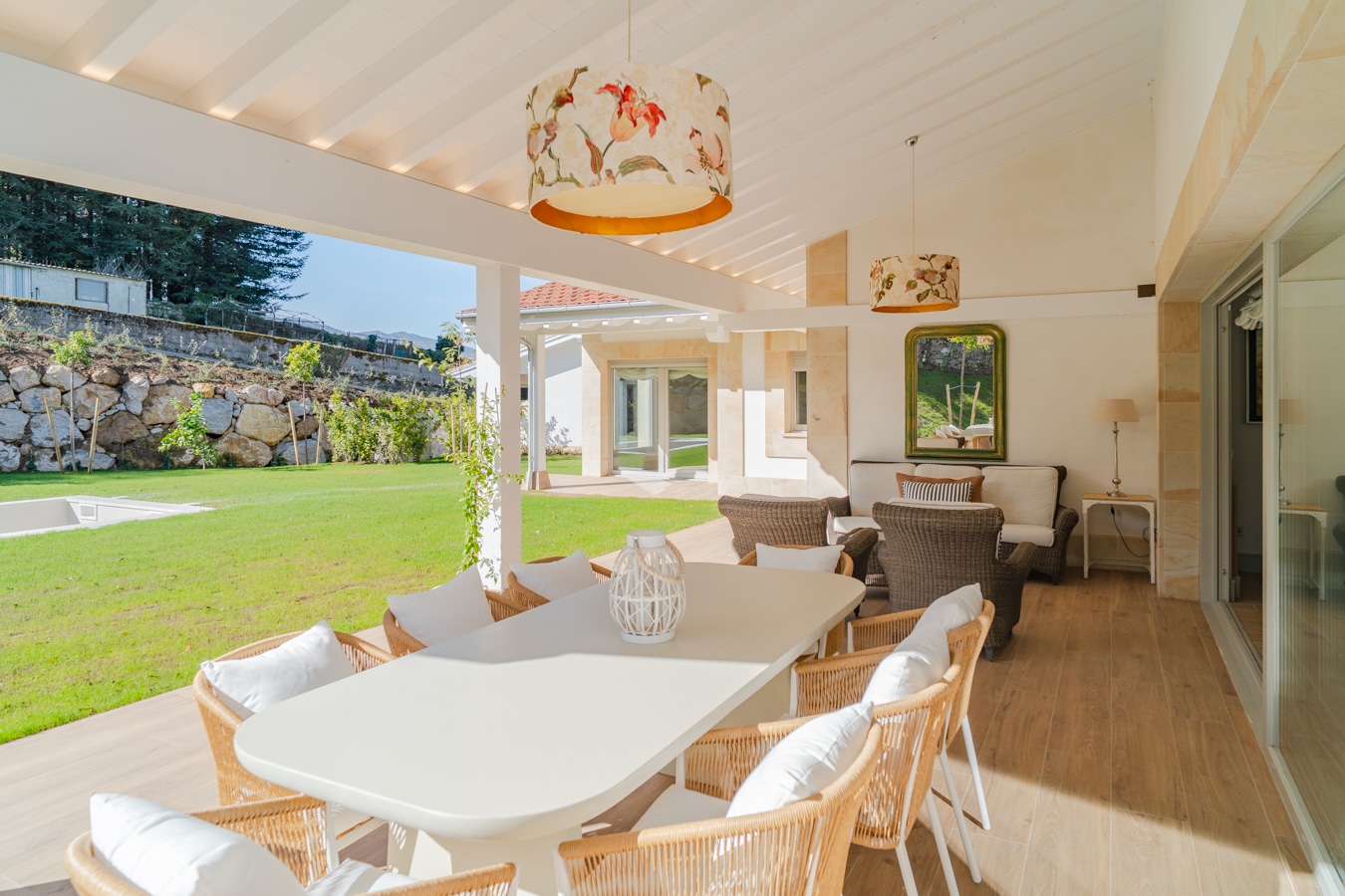 En el exterior, el jardín paisajista se articula en torno al porche principal, donde una piscina se integra como una prolongación natural del salón.