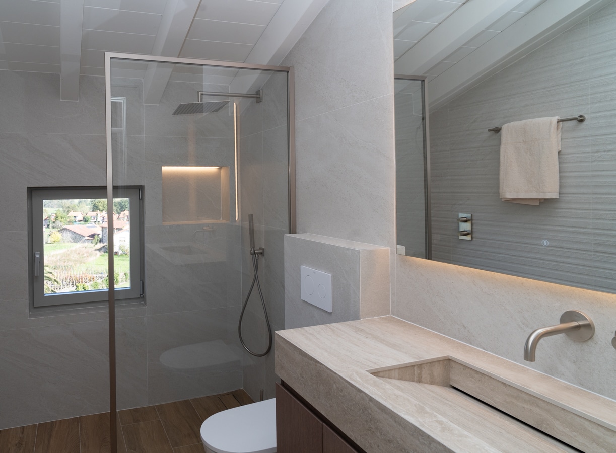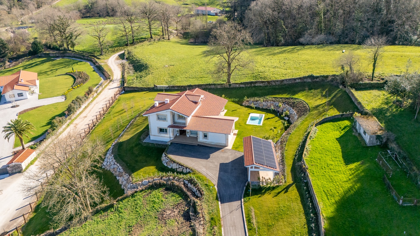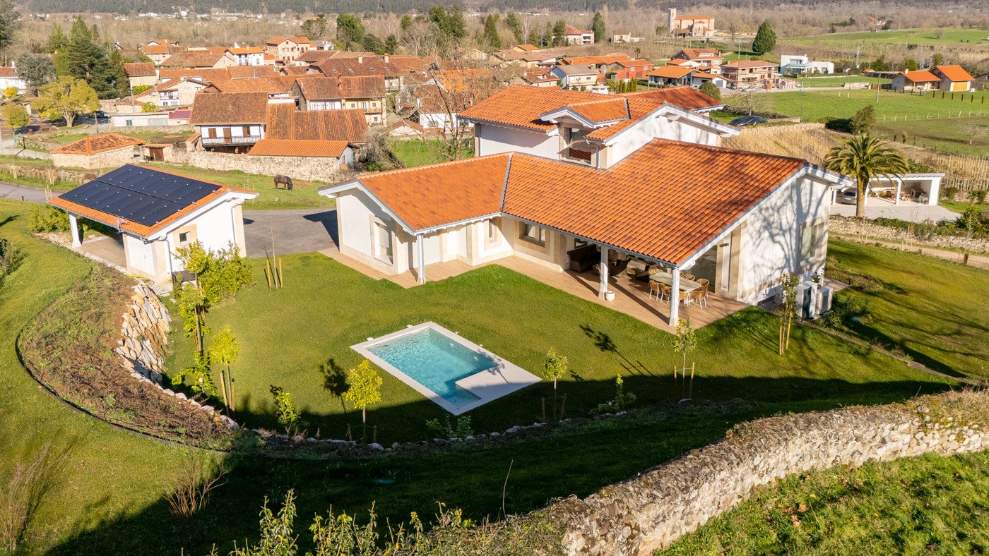 Una casa con alma cántabra reinterpretada con elegancia contemporánea. Su posición elevada, rodeada de vegetación y silencio, le otorga una presencia serena y poderosa a la vez. La arquitectura combina piedra natural, madera y cal, con una ejecución artesanal impecable. El interior se abre al exterior con naturalidad: los grandes ventanales inundan las estancias de luz y prolongan la vida hacia el porche, donde el agua de la piscina refleja el cielo y la casa. La bodega, con su estética industrial, añade carácter y sofisticación, ofreciendo un espacio para el ocio, el vino o el cine en casa. Los techos altos, las suites con vestidor y la domótica total consolidan una sensación de bienestar absoluto. El hogar responde a la naturaleza: la luz, la temperatura y el riego se regulan de forma automática según el clima, haciendo que la casa viva en sintonía con su entorno