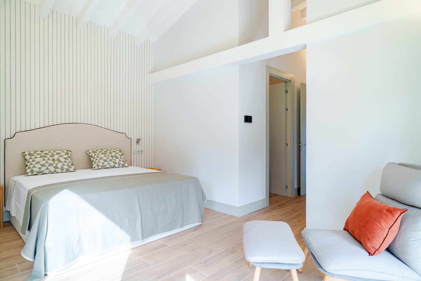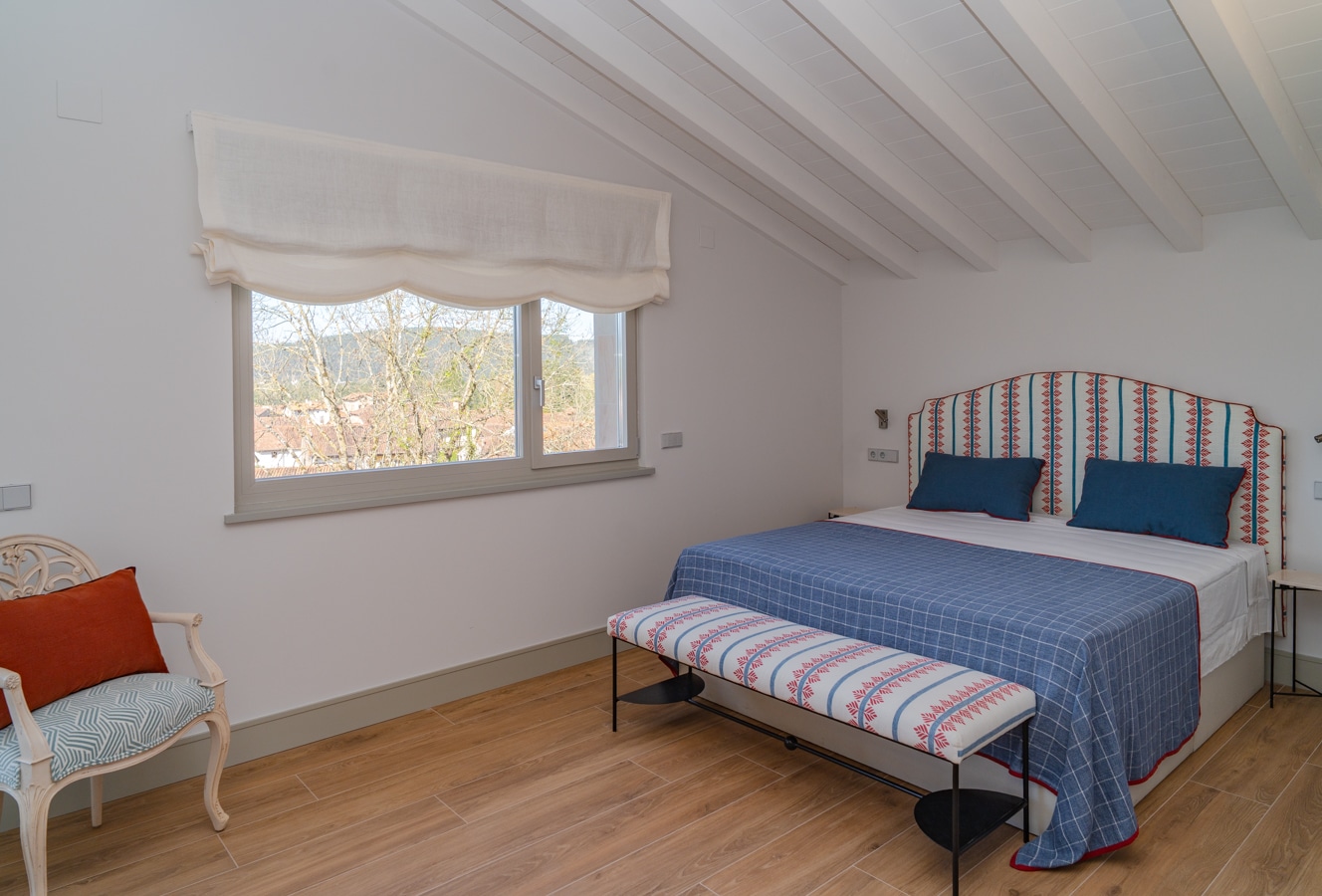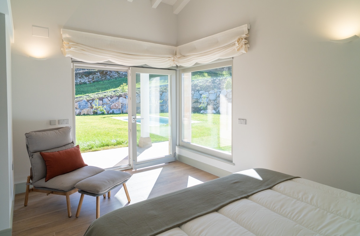 En la planta superior, una biblioteca abierta actúa como distribuidor y conduce a otro dormitorio y vestidor; una de ellas con balcón sobre el paisaje, enmarcando la naturaleza como parte de la vida cotidiana.