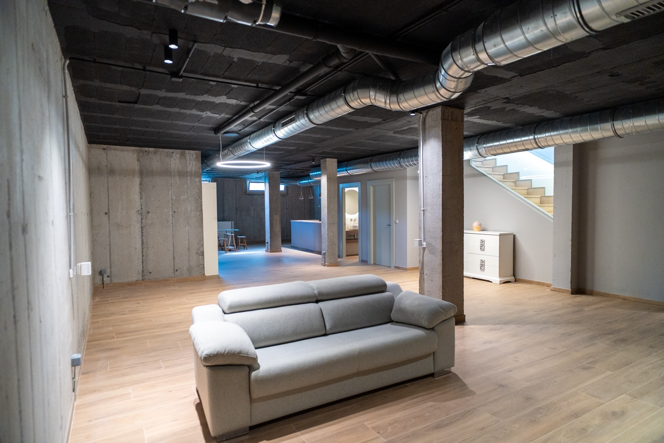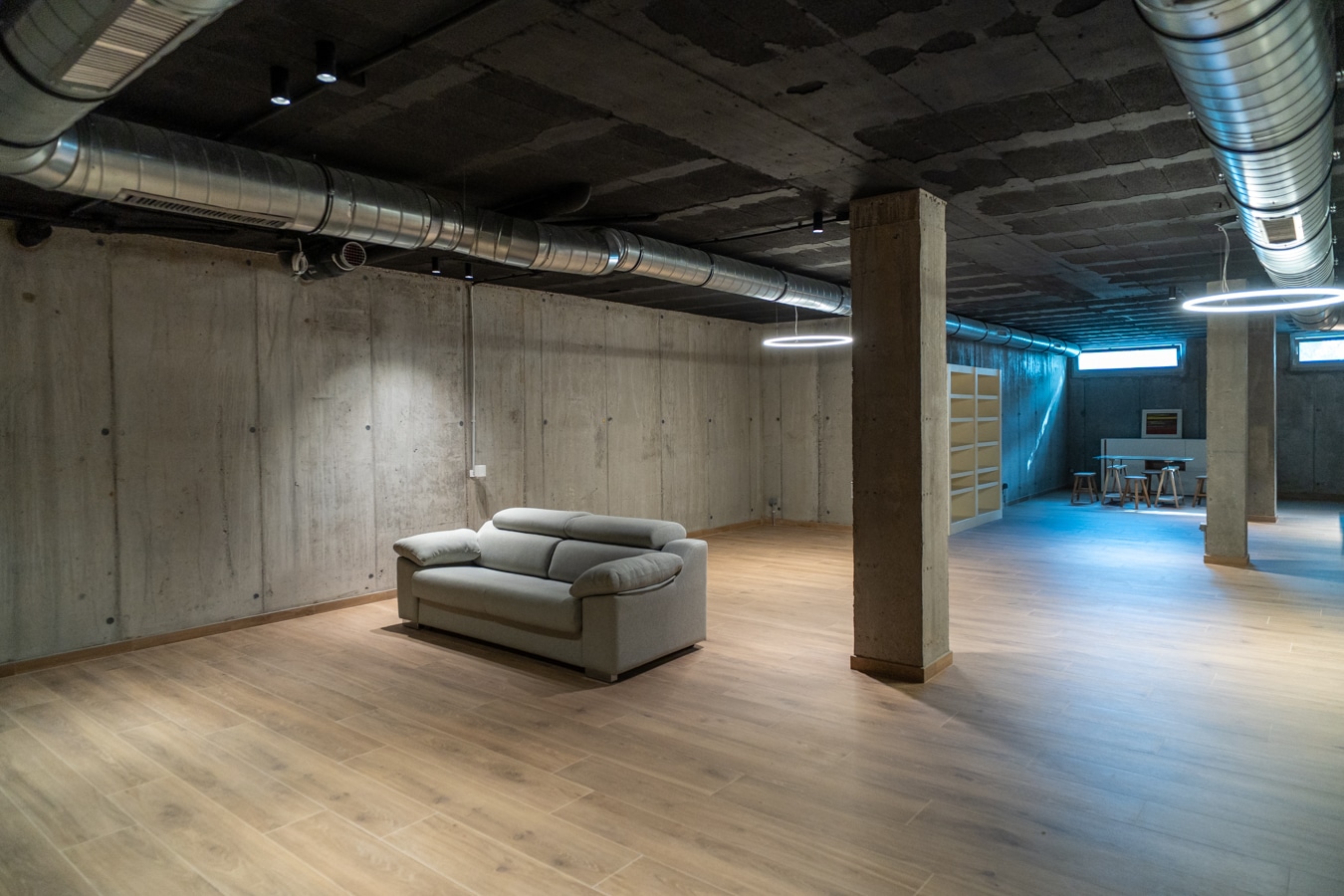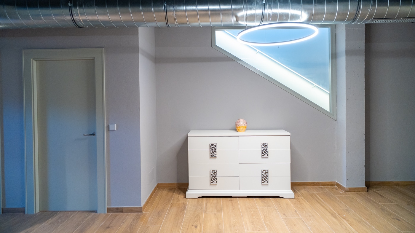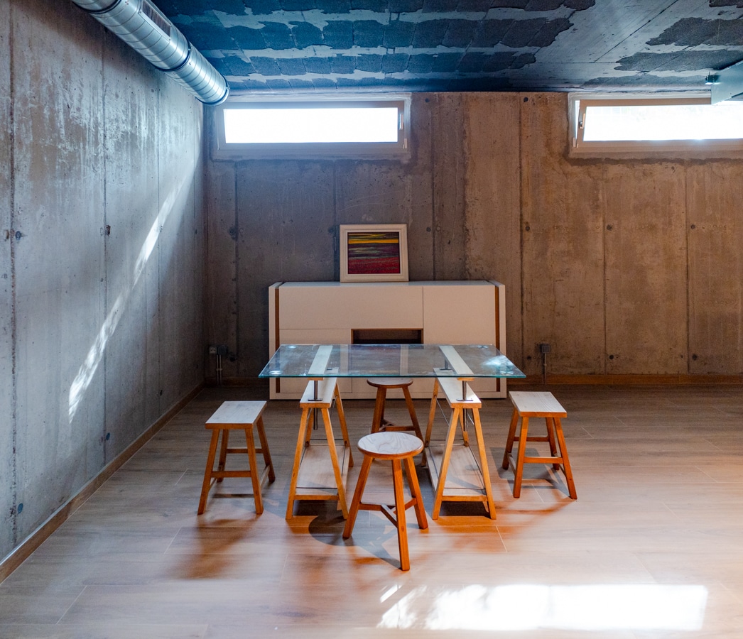 El nivel inferior sorprende por su estética de inspiración industrial: una gran bodega con sala de cine, zona de ping pong, barra para copas con nevera y lavavajillas, aseo de cortesía y cuarto de instalaciones. Un espacio cálido, versátil y con carácter, diseñado para disfrutar todo el año.