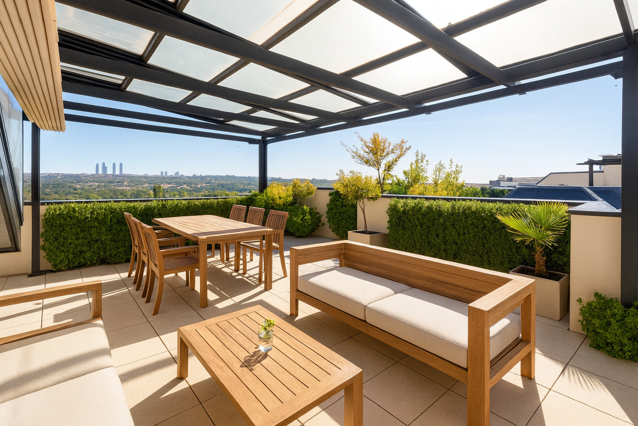 Este espacio exterior combina una sofisticada zona acristalada de 40 m2, perfectamente climatizada para su uso durante todo el año, con una amplia área cubierta por pérgola, donde la luz se filtra suavemente creando una atmósfera serena y acogedora.