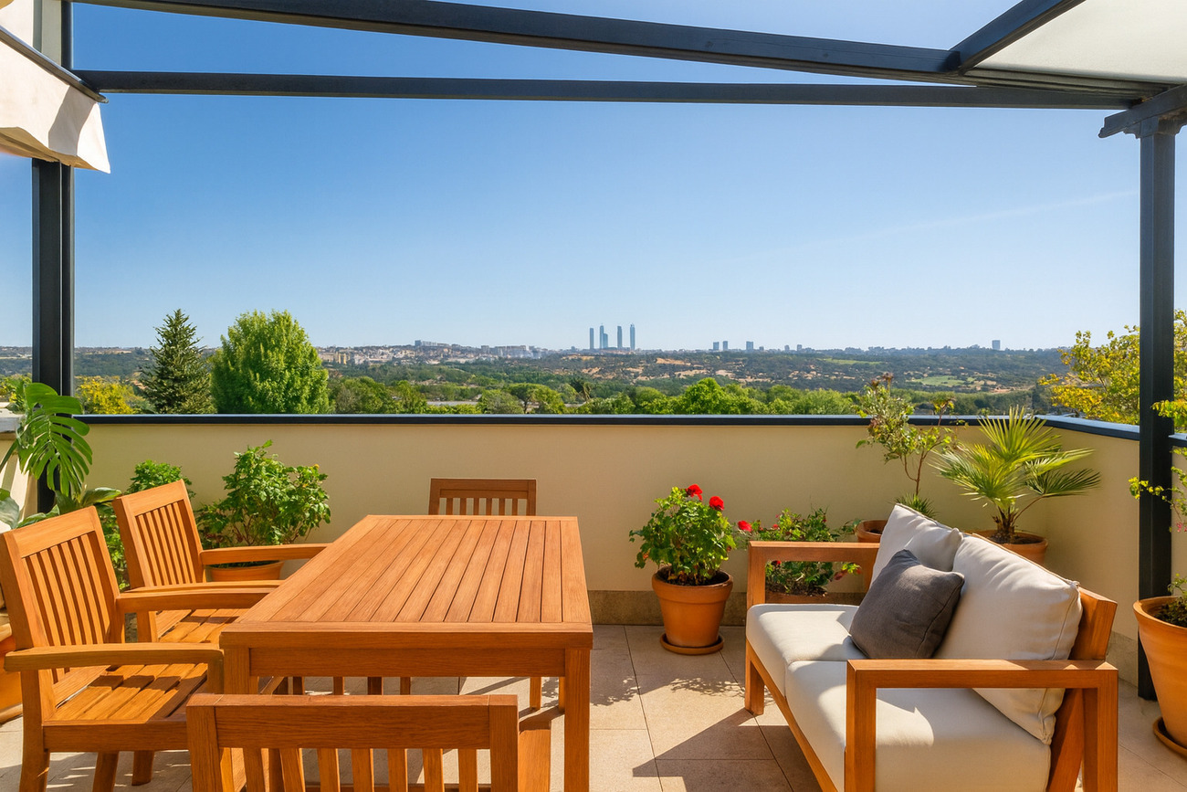 Espectacular dúplex ubicado en una de las urbanizaciones más exclusivas de Valdemarín, con vistas infinitas al Hipódromo de Madrid, el Monte del Pardo y el skyline de la ciudad.