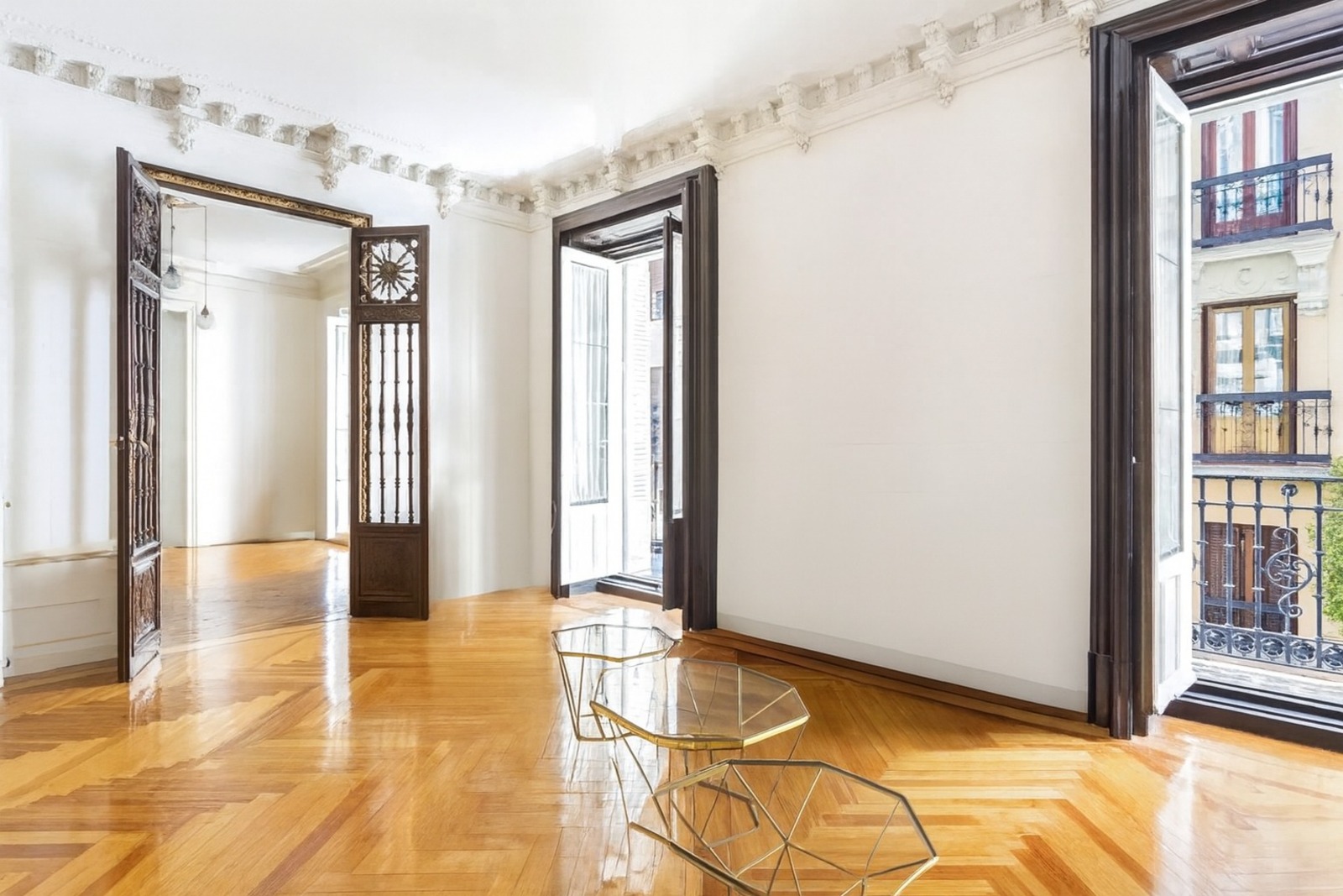 Tres amplias estancias se suceden de manera continua, generando una sensación de fluidez y amplitud. La zona de recibo destaca con sus cuatro balcones franceses, que se abren a una calle tranquila, proporcionando abundante luz natural y elegancia.