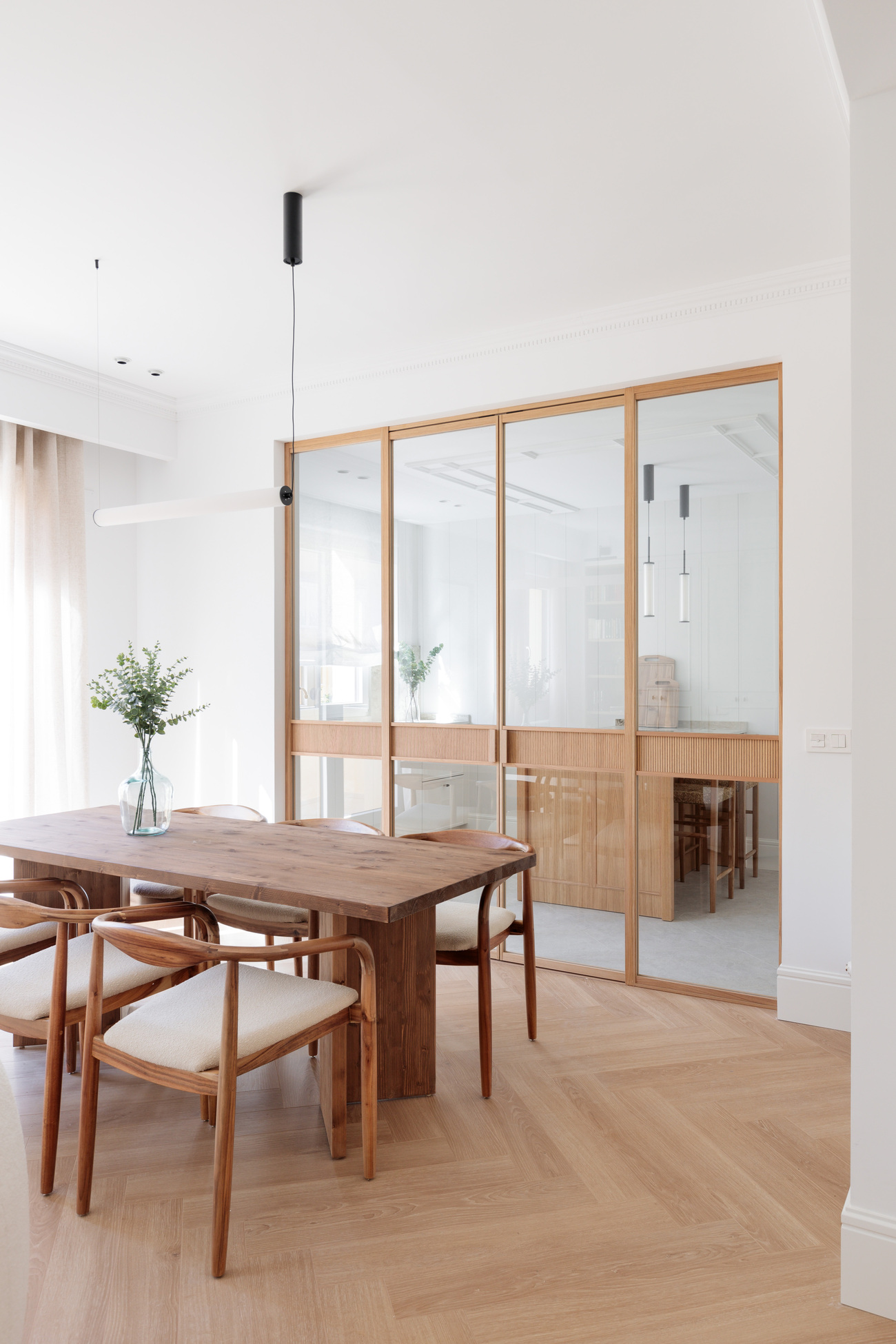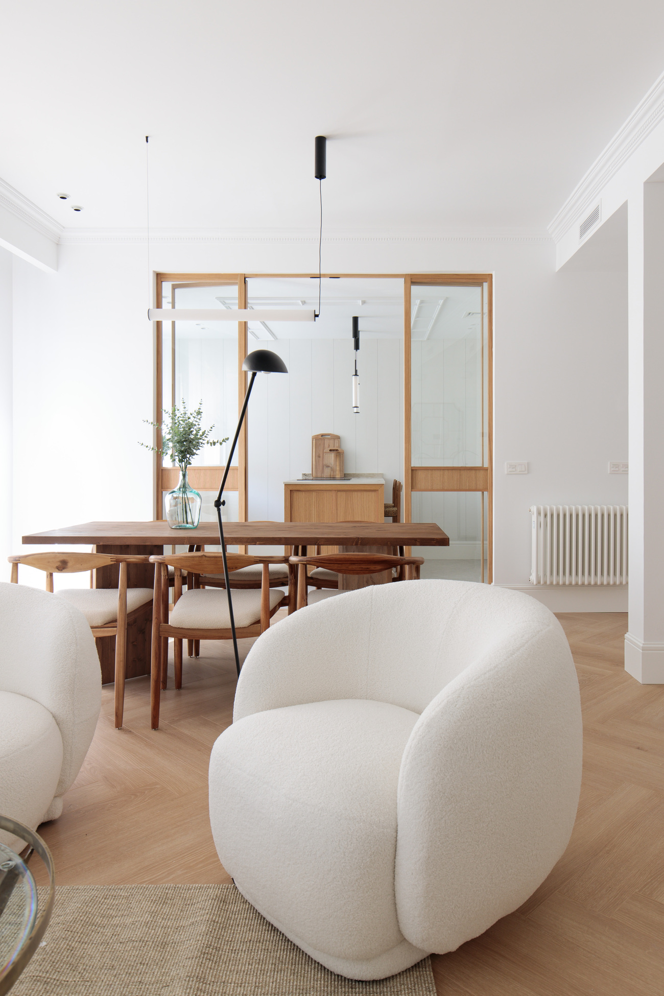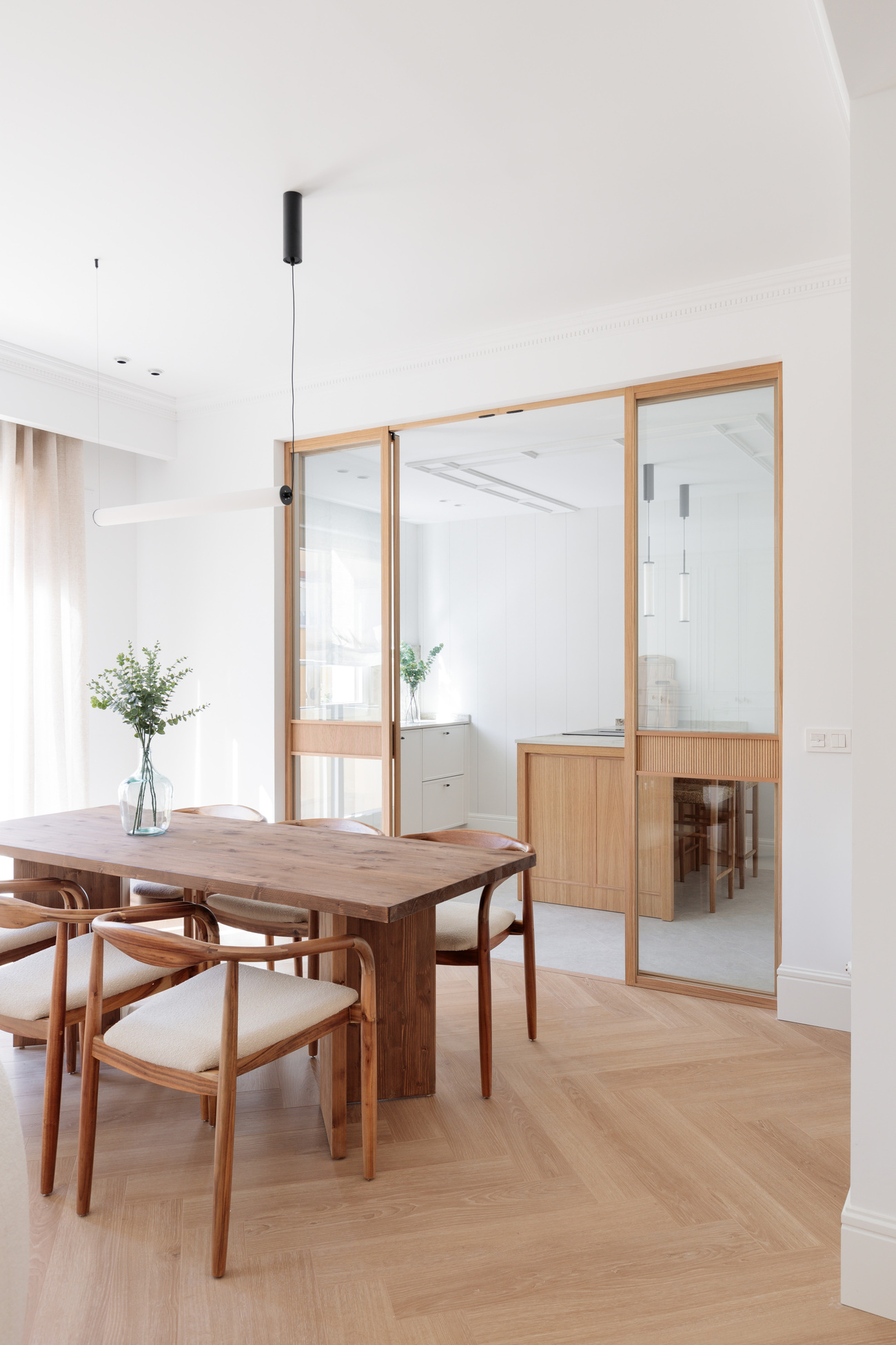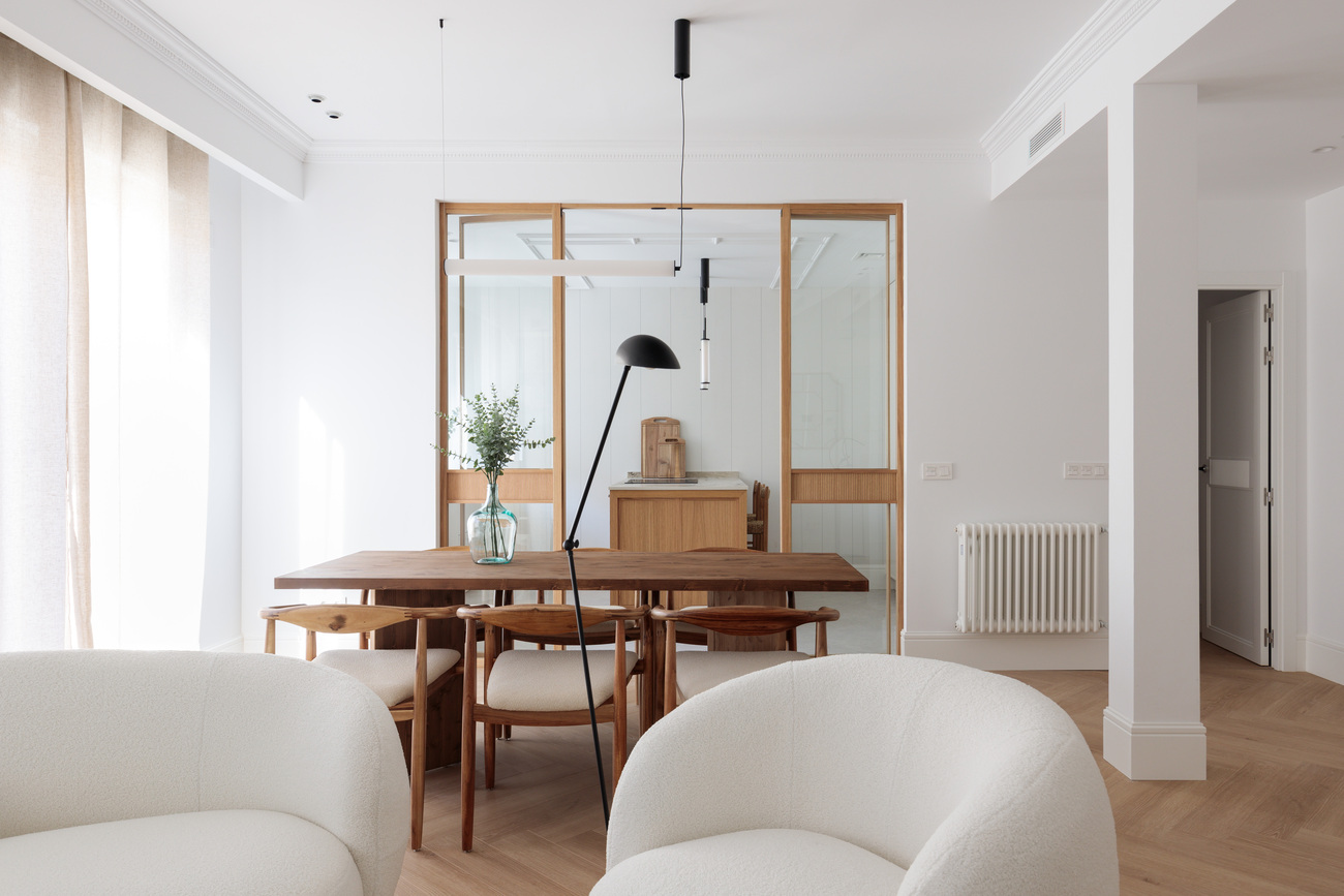 La zona social se articula en torno a un amplio y luminoso salón comedor, de líneas contemporáneas y atmósfera cálida, conectado con una cocina independiente que mantiene la privacidad del espacio a la vez que favorece la comunicación visual y la comodidad en el día a día.