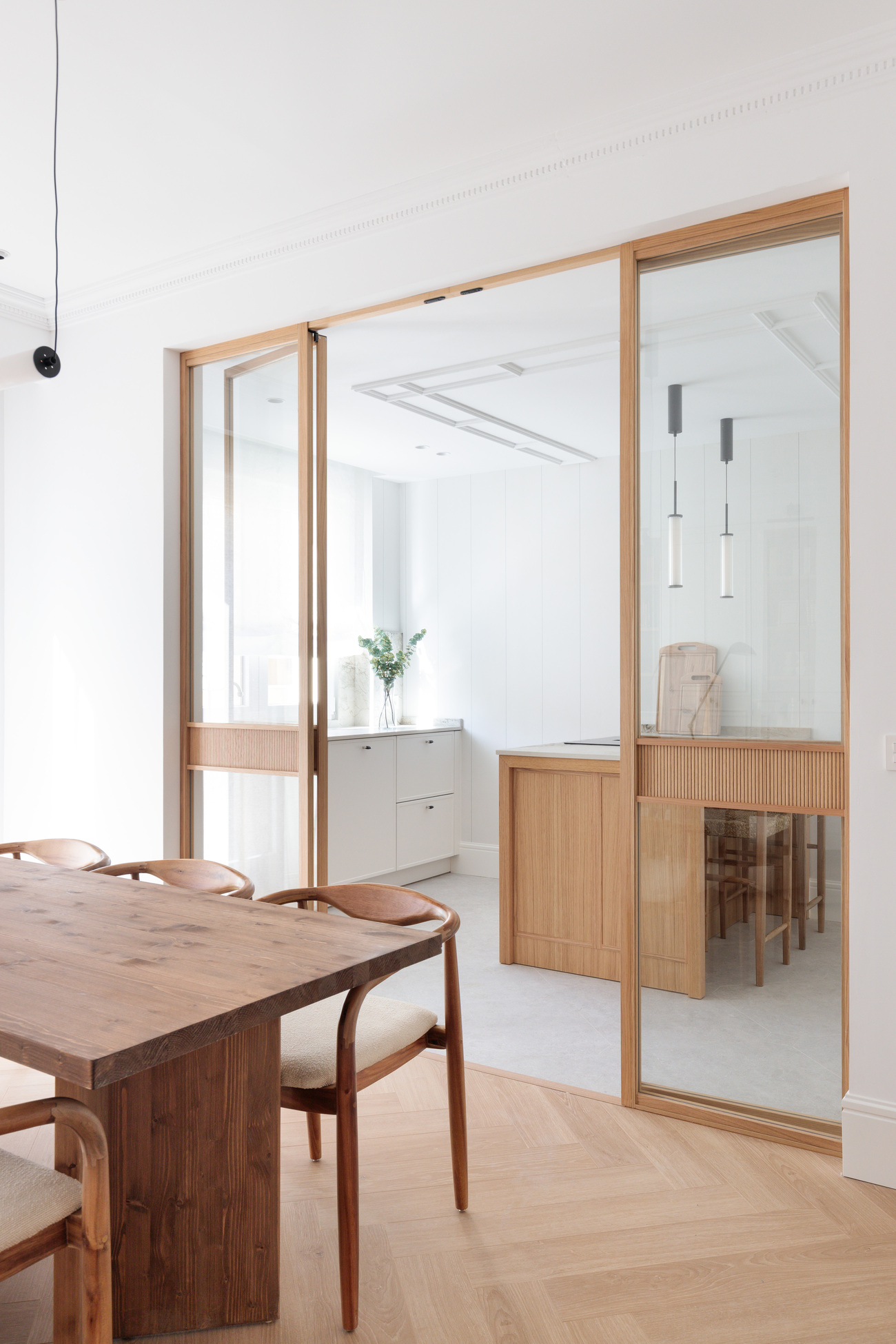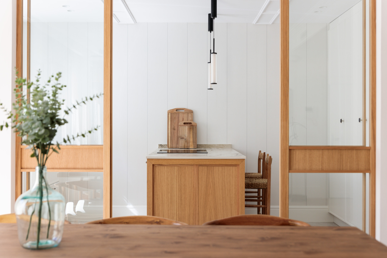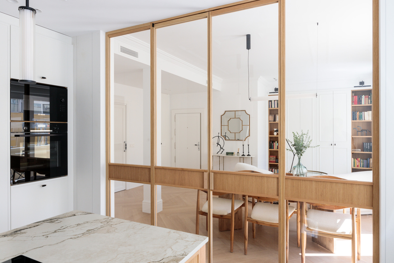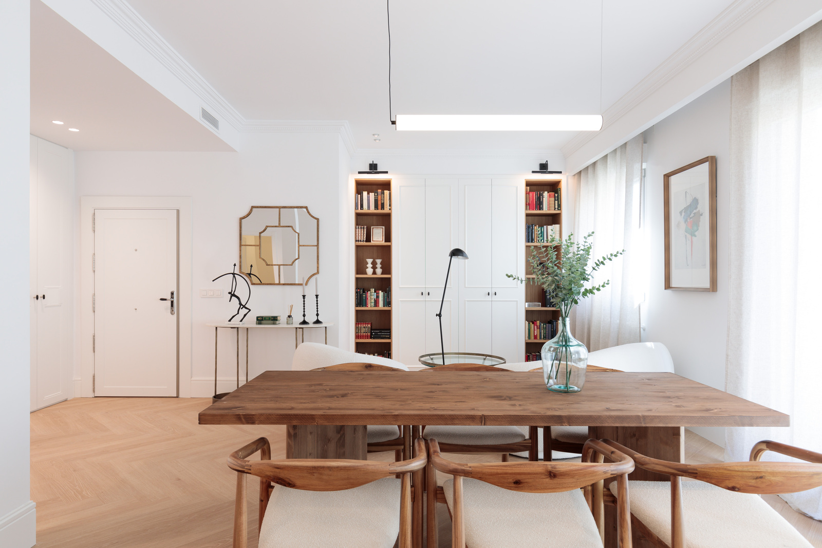 La zona social se articula en torno a un amplio y luminoso salón comedor, de líneas contemporáneas y atmósfera cálida, conectado con una cocina independiente que mantiene la privacidad del espacio a la vez que favorece la comunicación visual y la comodidad en el día a día.