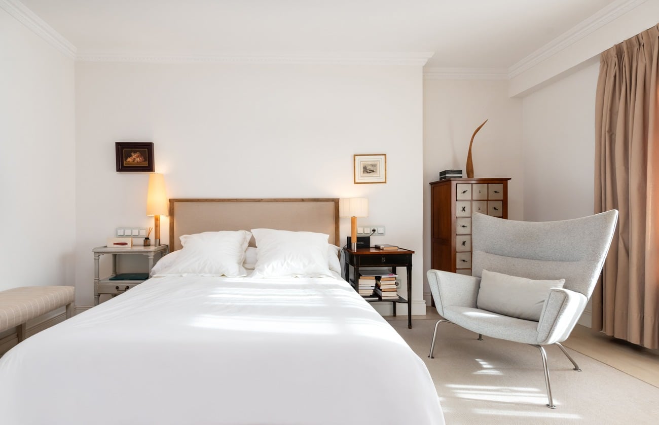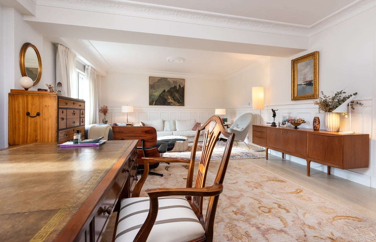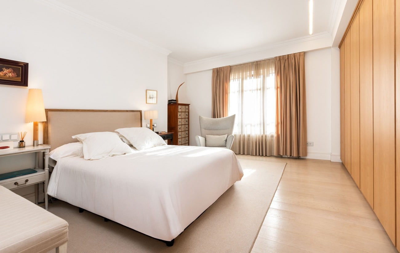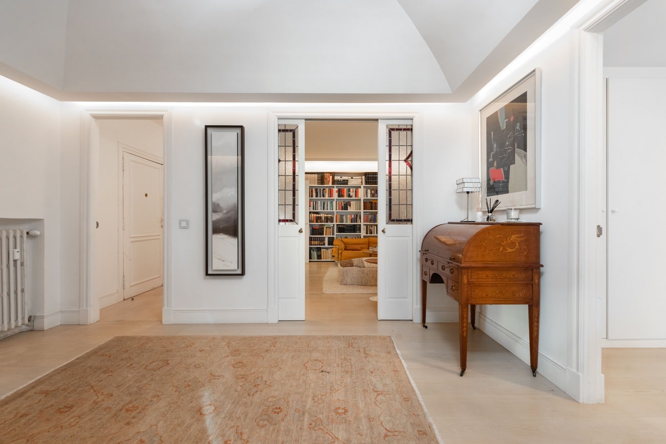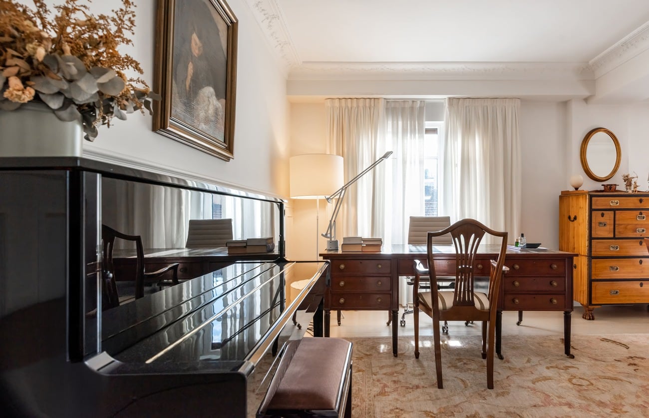 En una quinta planta exterior, recibe una luz constante y suave que acaricia las molduras originales y se posa sobre maderas nobles, tejidos naturales y piezas con historia. La atmósfera es calmada, íntima y envolvente; un equilibrio entre lo clásico y lo contemporáneo.