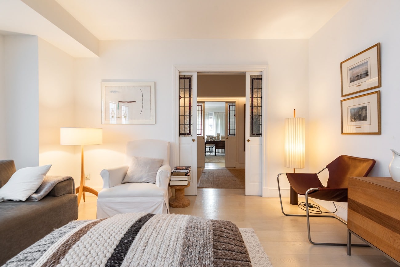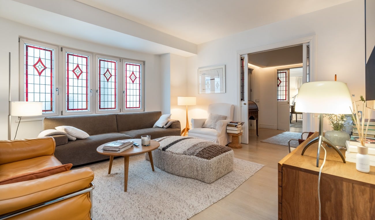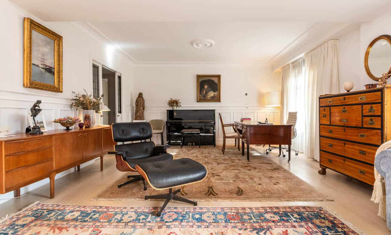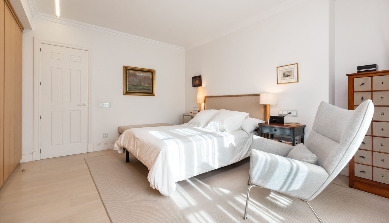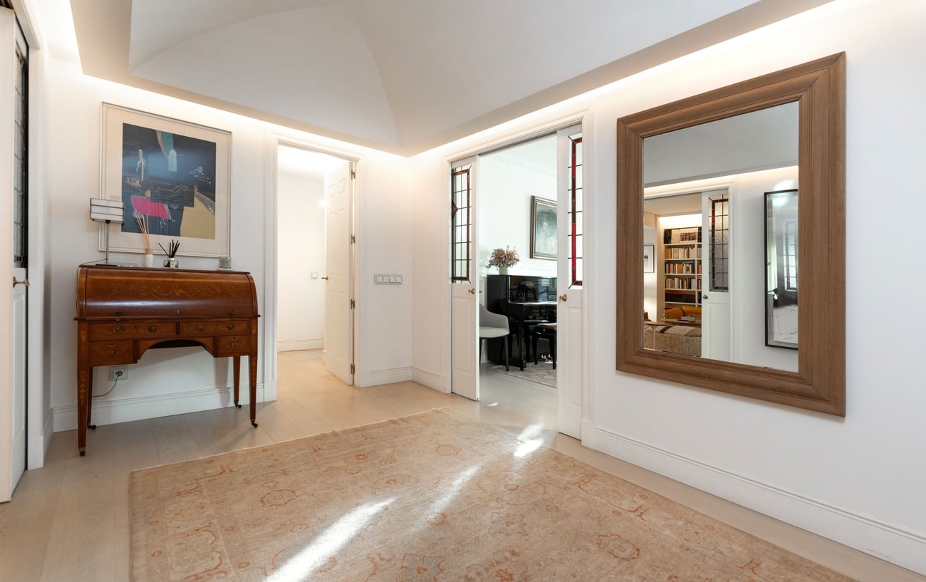 En una quinta planta exterior, recibe una luz constante y suave que acaricia las molduras originales y se posa sobre maderas nobles, tejidos naturales y piezas con historia. La atmósfera es calmada, íntima y envolvente; un equilibrio entre lo clásico y lo contemporáneo.