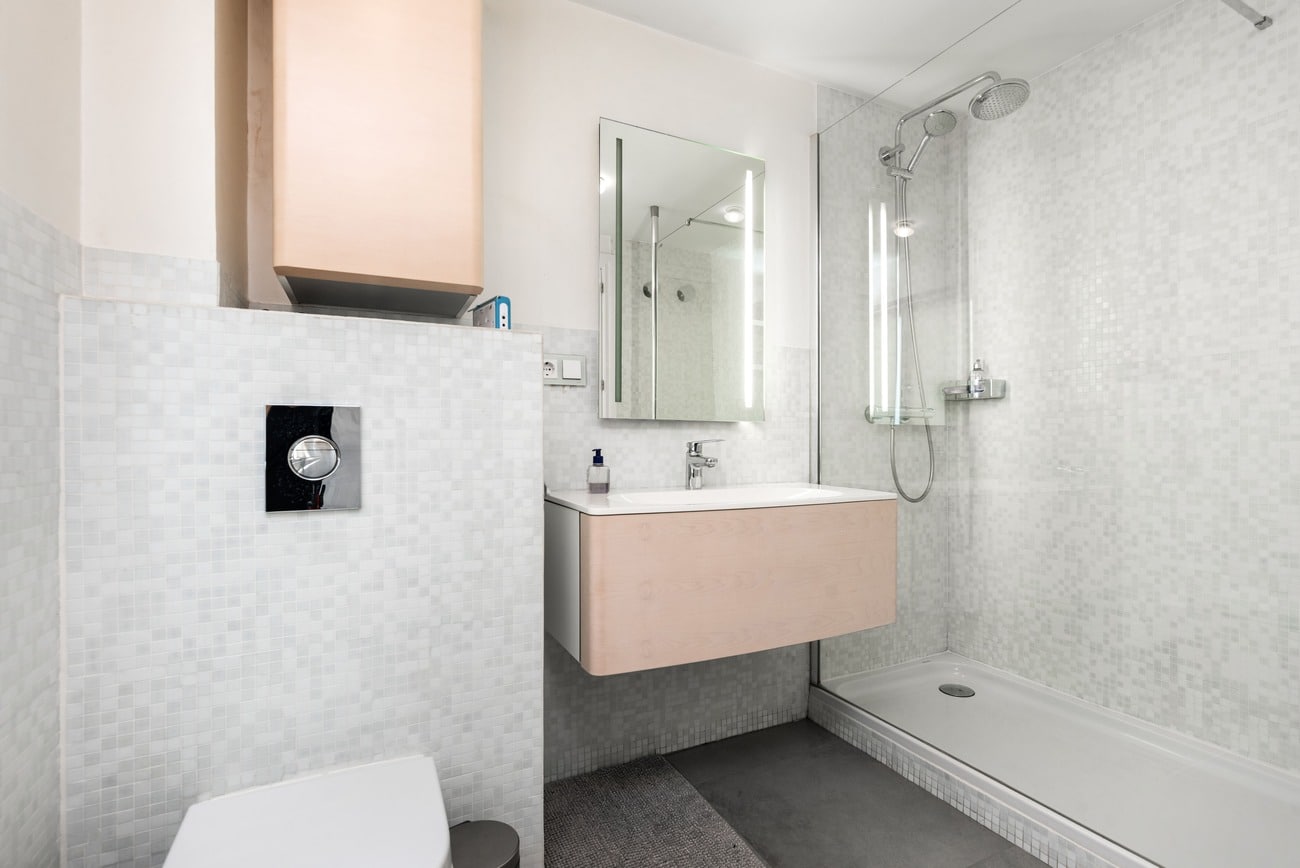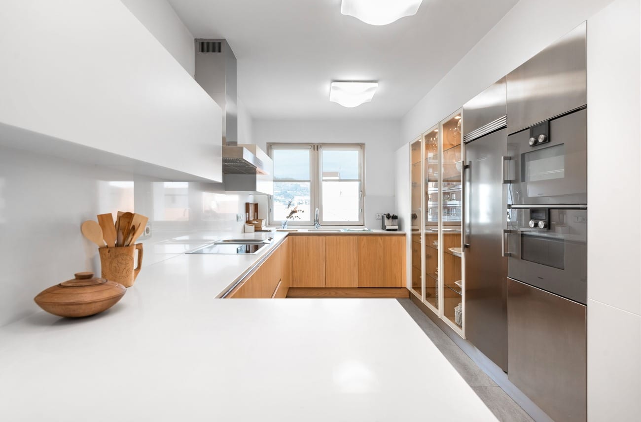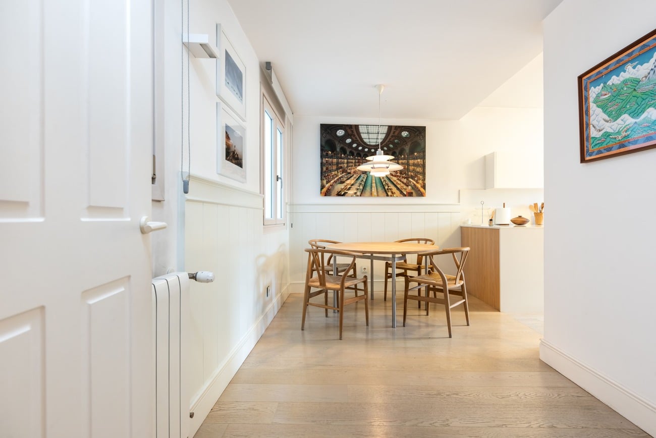 La vivienda se organiza en dos zonas claramente definidas. Un gran recibidor con doble acceso introduce una dimensión versátil, incluso con posibilidad de independizar espacios. La cocina, concebida como un lugar de encuentro, integra comedor en una composición de líneas depuradas, mobiliario a medida y materiales nobles cuidadosamente seleccionados. La funcionalidad se resuelve con discreción; la estética, con intención.