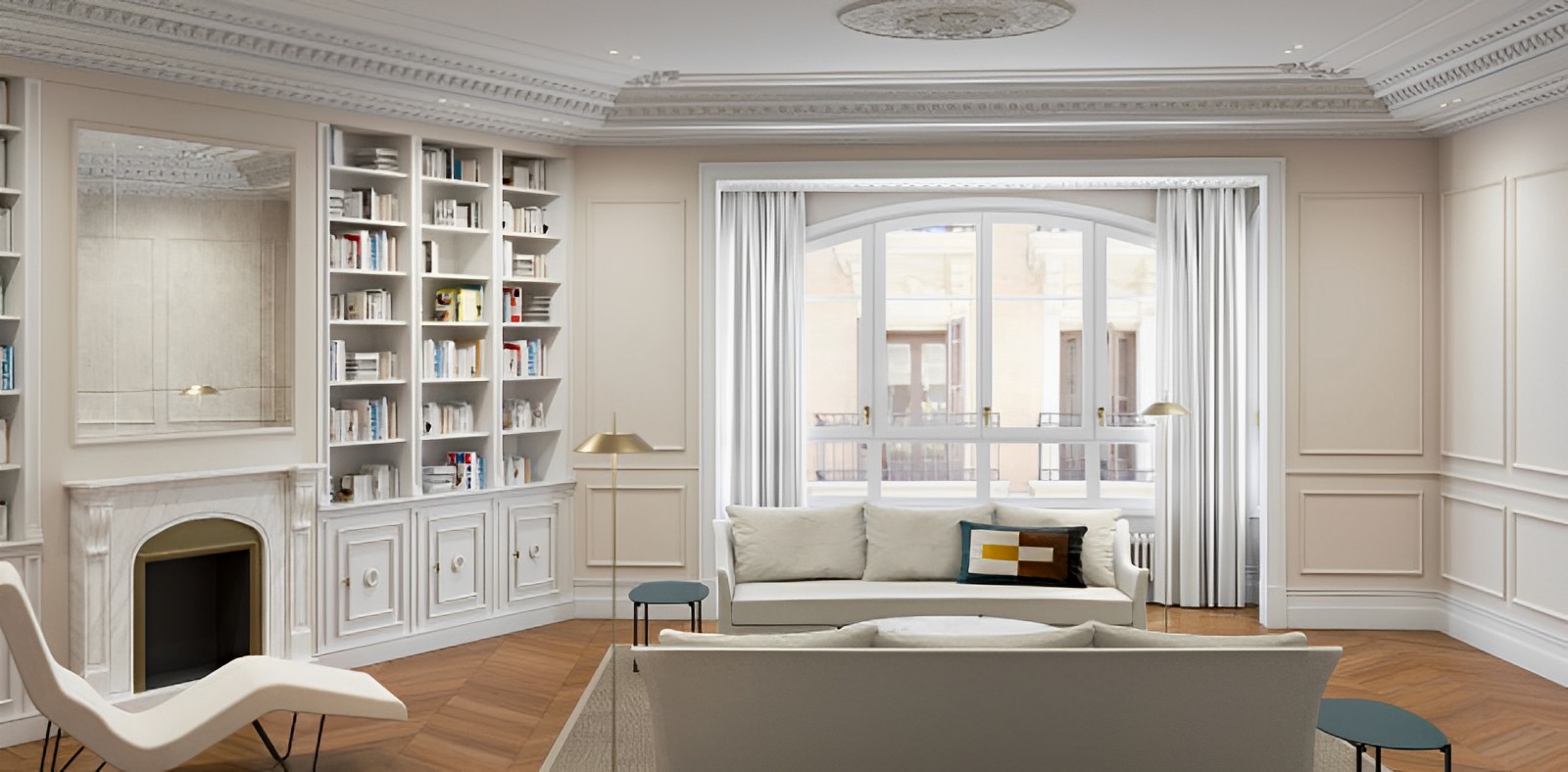 El barrio de Almagro, uno de los más residenciales y elegantes de Madrid, sobre todo el conocido “triángulo de oro”, donde se ubica esta vivienda, acoge algunos de los edificios más representativos, construidos entre finales del siglo XIX y principios del XX. Alberga tanto embajadas como parques, museos y galerías de arte, en él se han instalado en los últimos años algunos centros de arte, como la Academia de Cine o el Instituto Iberoamericano de Finlandia, que ofrecen cine, conferencias o exposiciones. En Almagro, encontramos también una amplia oferta comercial y tiendas de barrio de toda la vida.