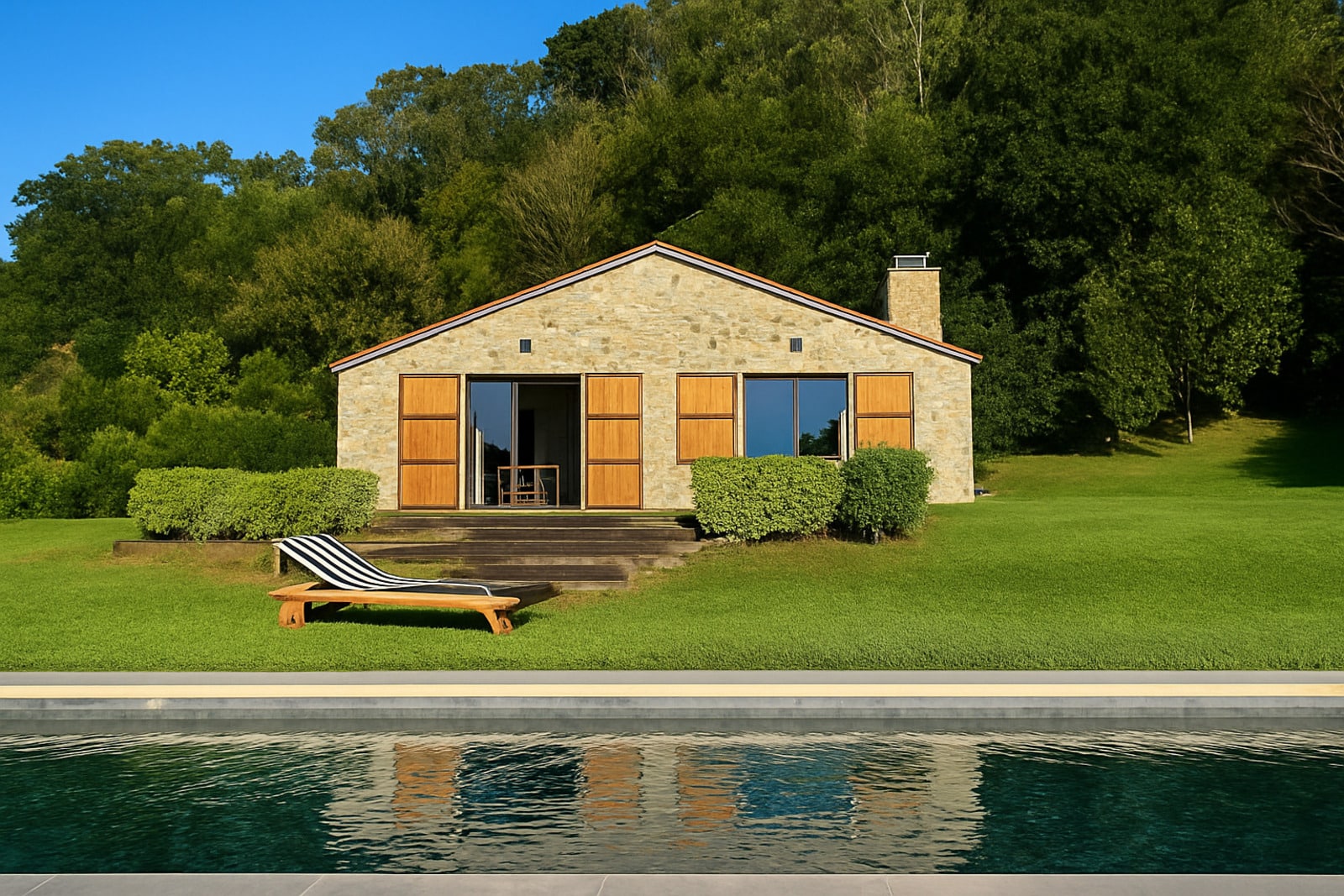 La piscina privada se convierte en un oasis desde el que contemplar la serenidad del paisaje rural de Cantabria, mientras la vegetación y el cuidado del terreno aportan privacidad y armonía.