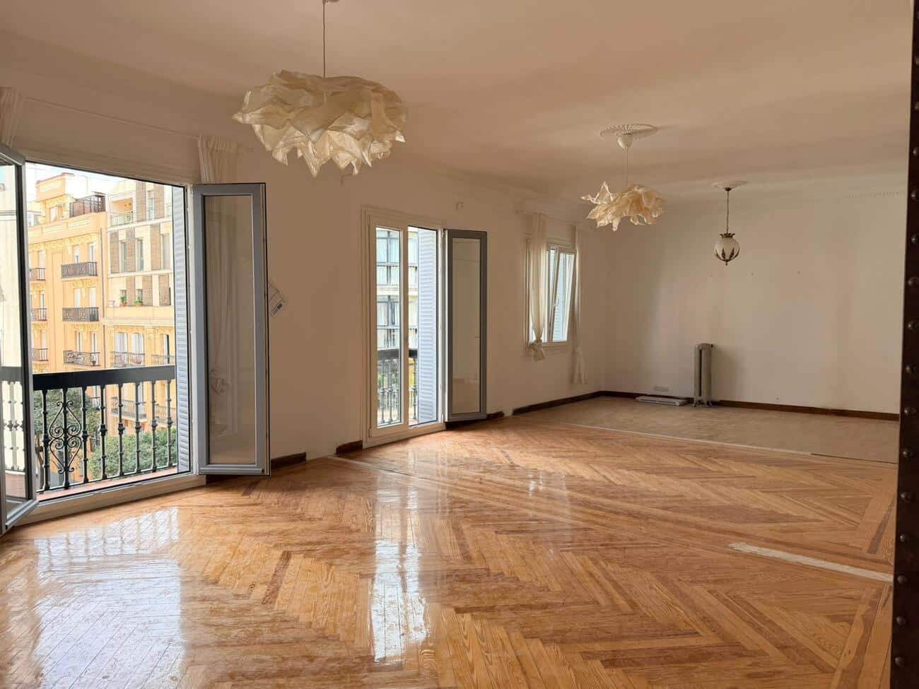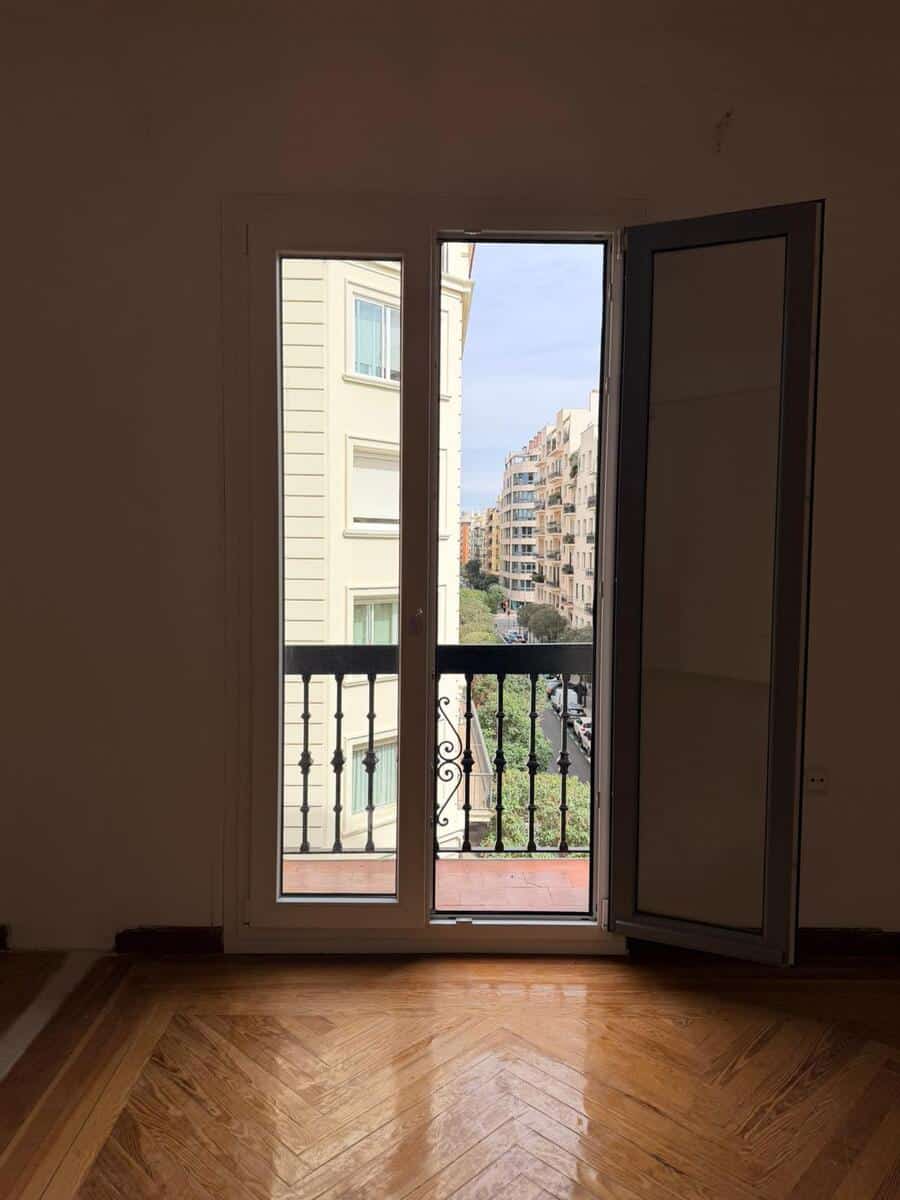 Situada en una cuarta planta, la propiedad se abre al exterior a través de tres balcones y amplias ventanas que inundan los espacios de luz natural, conectando el interior con la vida del barrio. La finca, de corte clásico, y los techos altos aportan ese carácter reconocible del Madrid de siempre, una base arquitectónica con identidad y elegancia.